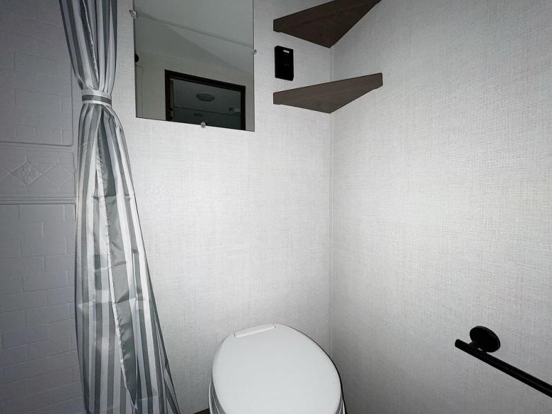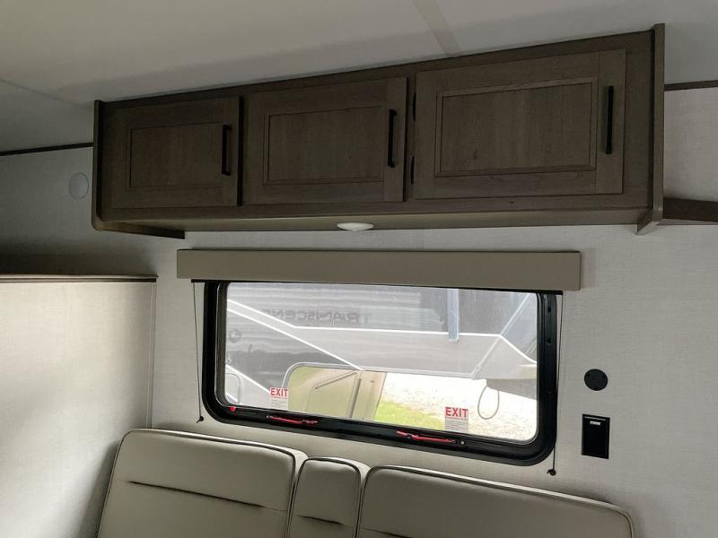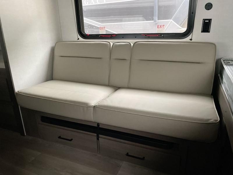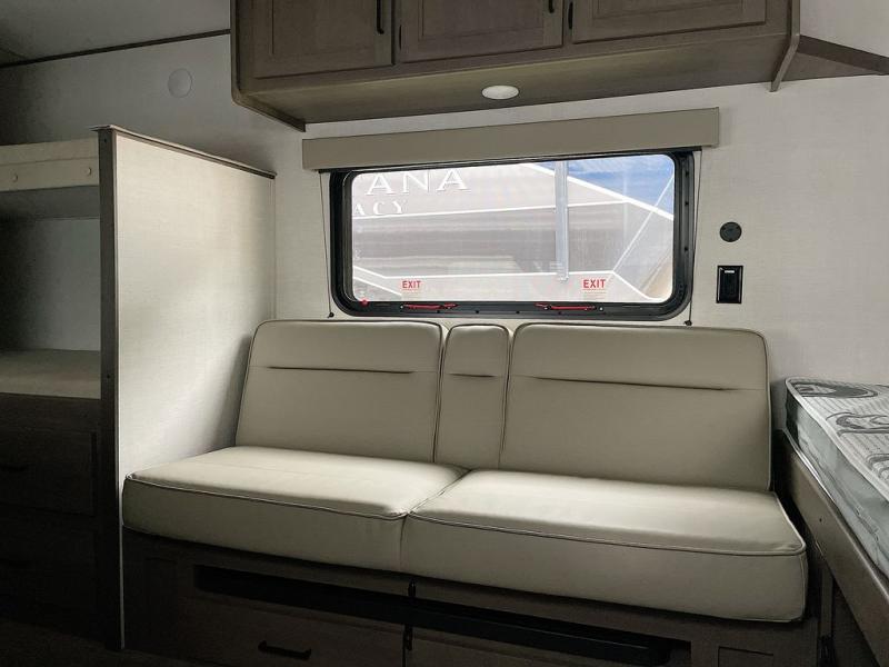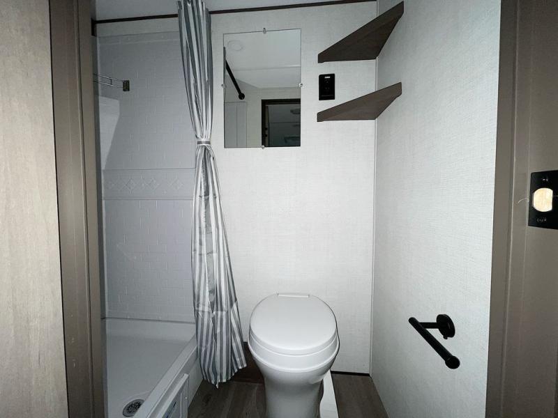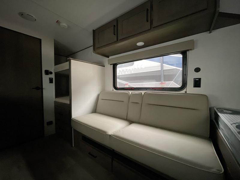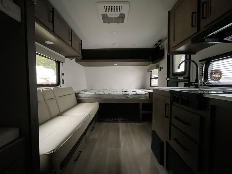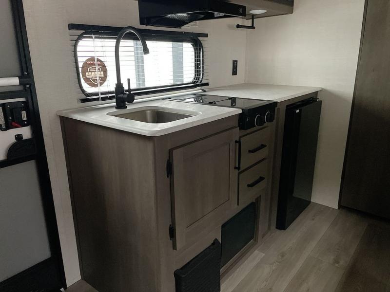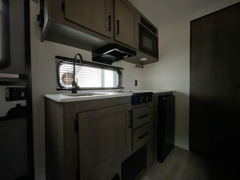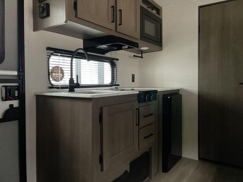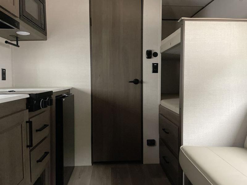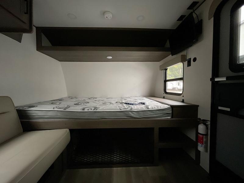 Camping trips to the lake have never been easier than with this travel trailer! The 28" x 67" bunks are right next to the private bath for easy nighttime use, and the front queen bed includes hidden storage for your things. There is also a 66" Jack knife sofa that provides a little more sleeping space for guests. A full kitchen lets you cook meals each day and there is an exterior LP quick connect if you want to fire up your own propane grill.
