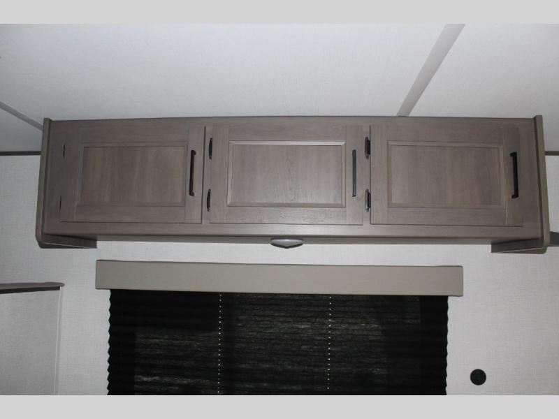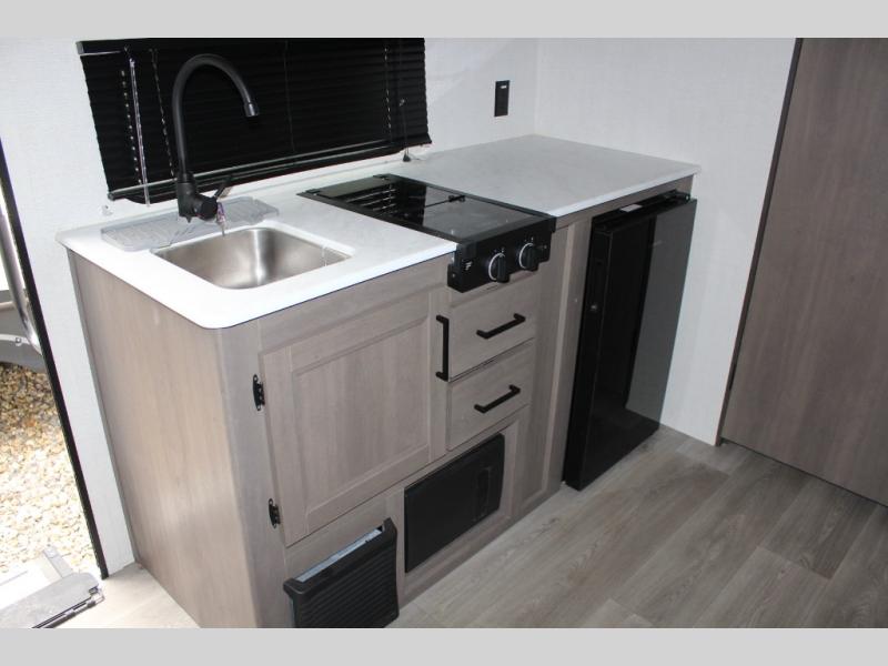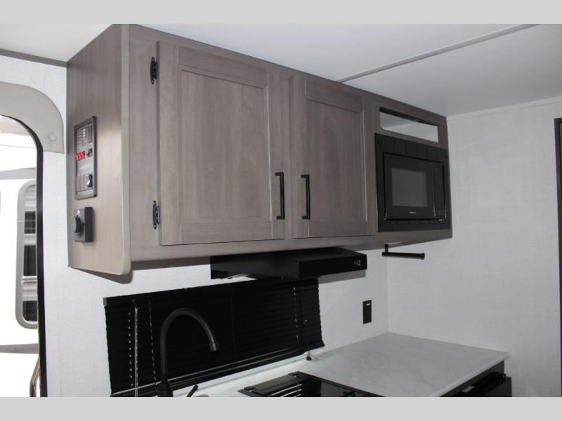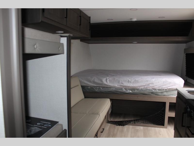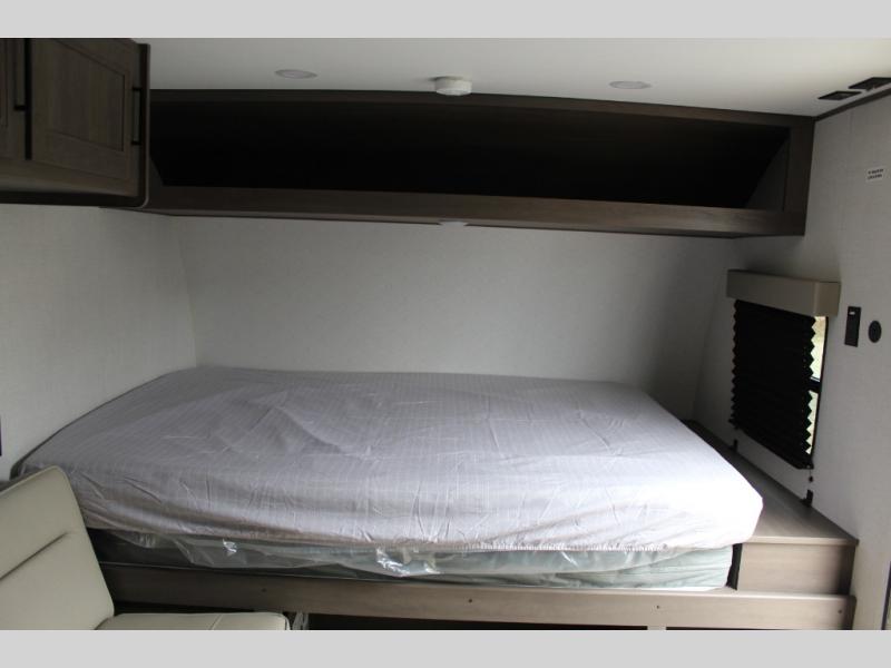 Camping trips to the lake have never been easier than with this travel trailer! The 28" x 67" bunks are right next to the private bath for easy nighttime use, and the front queen bed includes hidden storage for your things. There is also a 66" Jack knife sofa that provides a little more sleeping space for guests. A full kitchen lets you cook meals each day and there is an exterior LP quick connect if you want to fire up your own propane grill.