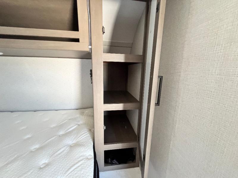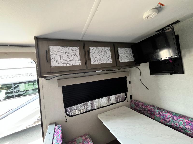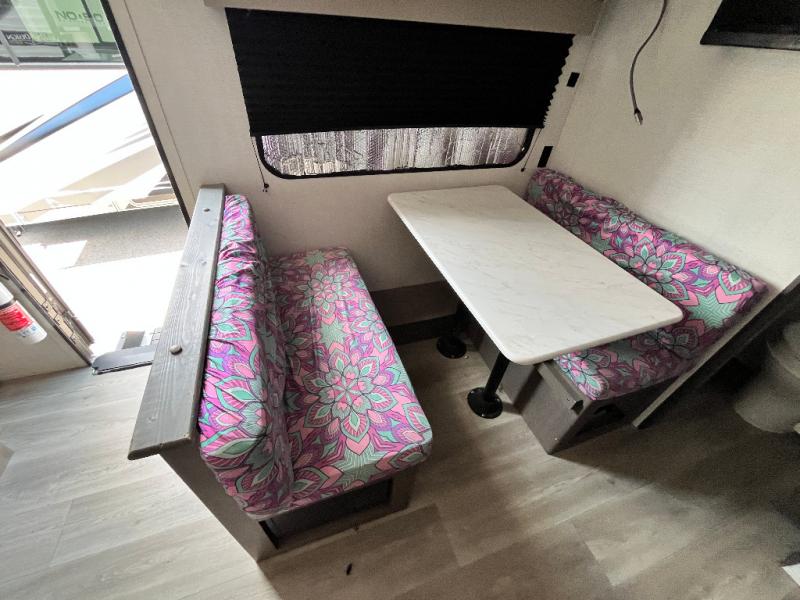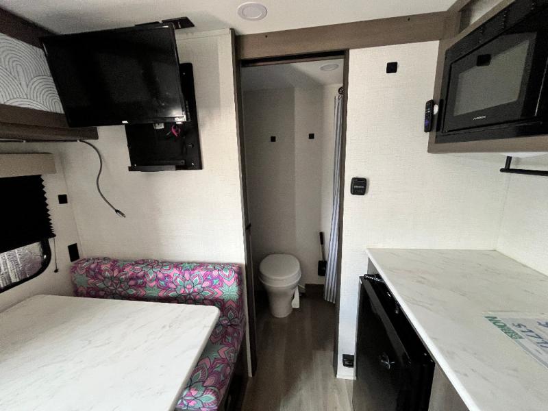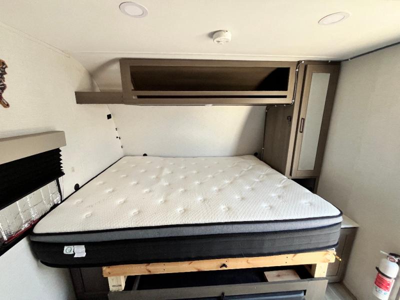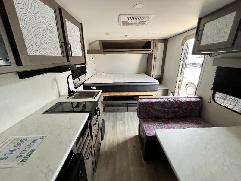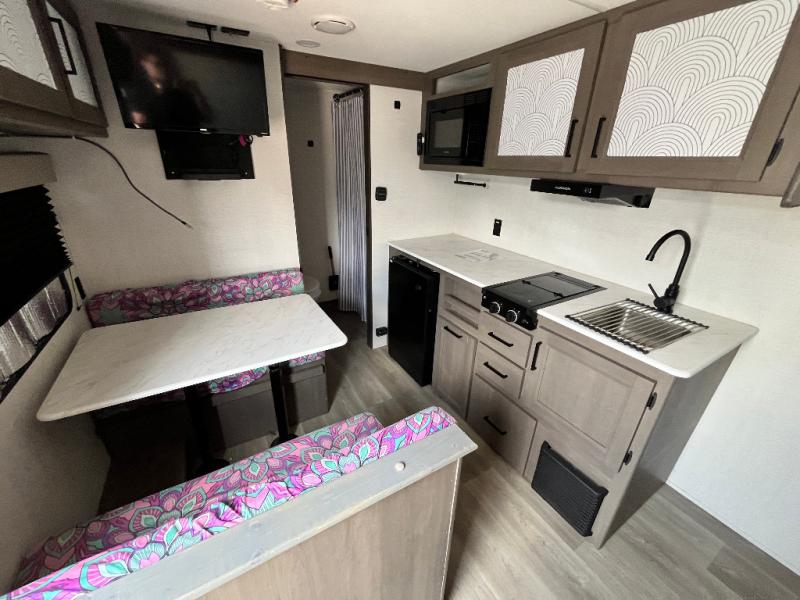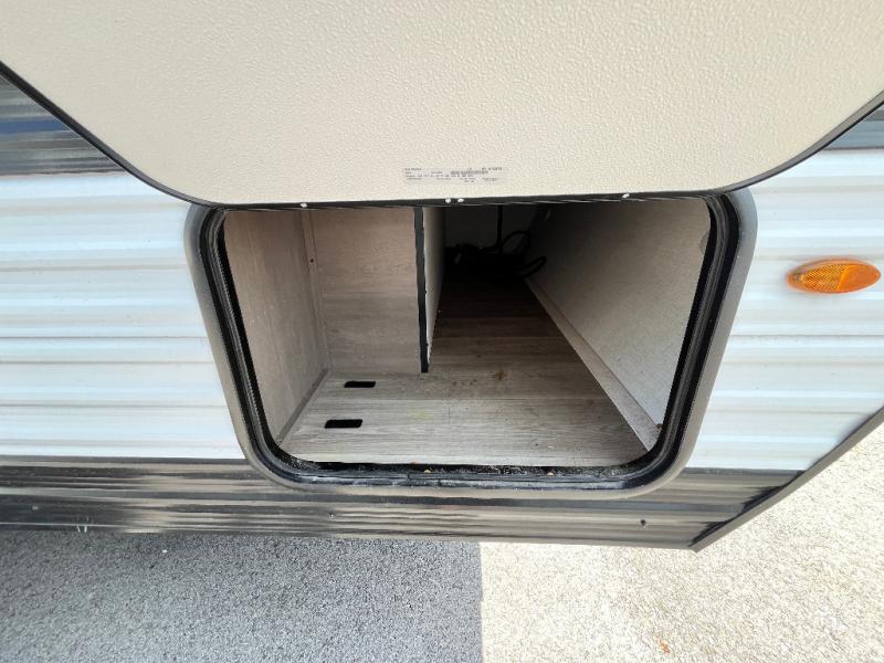 This is the perfect couple's trailer with versatile seating and sleeping space! You'll find a queen-size Murphy bed up front with storage space beside and above plus a full rear bath for added privacy. Once you've made lunch in the full kitchen, you can dine at the booth dinette, or take your plate outdoors to sit under the 10' power awning. You'll also find an unobstructed pass-thru storage outside that will be perfect for fishing poles, lawn chairs, tools and more!