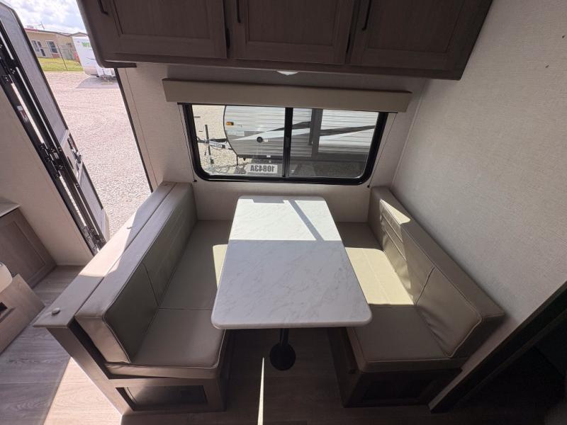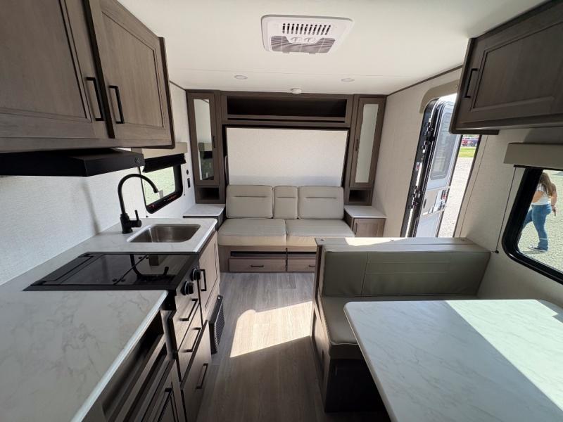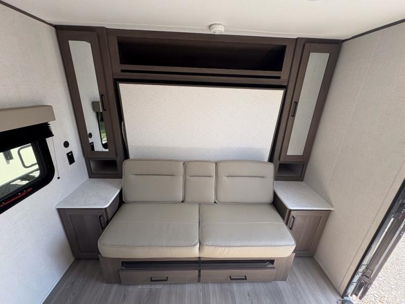 This is the perfect couple's trailer with versatile seating and sleeping space! You'll find a queen-size Murphy bed up front with storage space beside and above plus a full rear bath for added privacy. Once you've made lunch in the full kitchen, you can dine at the booth dinette, or take your plate outdoors to sit under the 10' power awning. You'll also find an unobstructed pass-thru storage outside that will be perfect for fishing poles, lawn chairs, tools and more!
