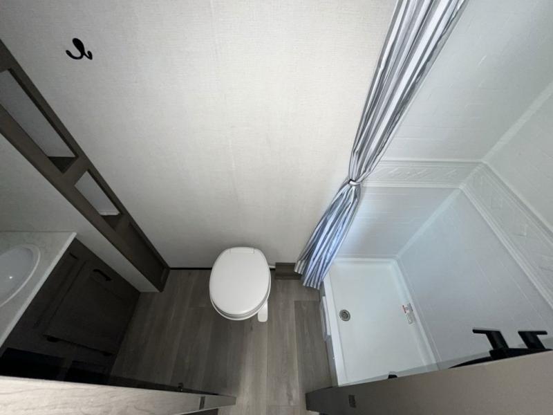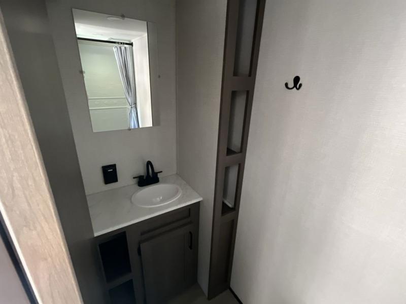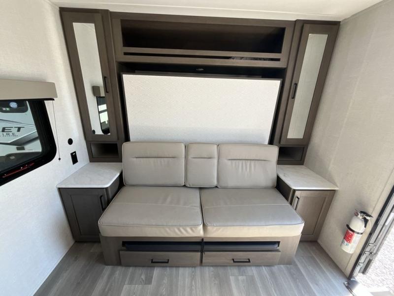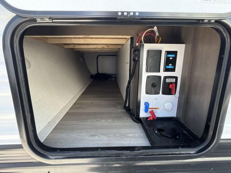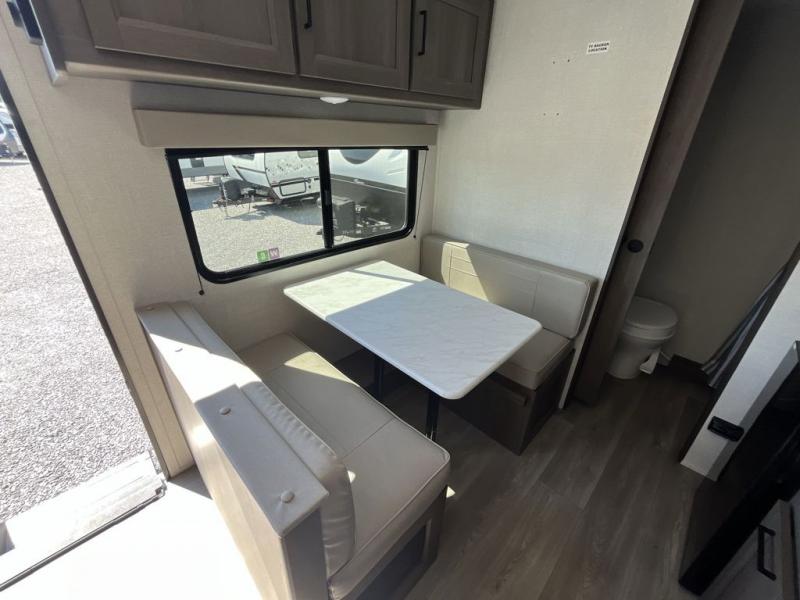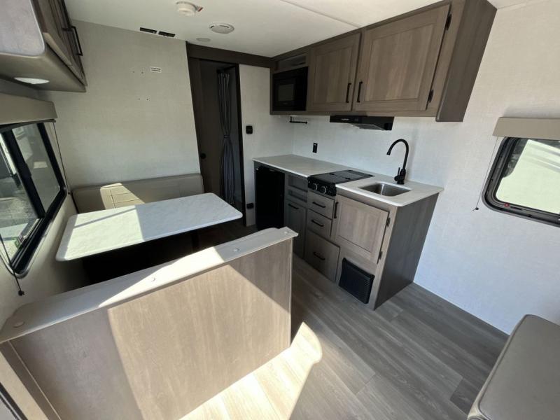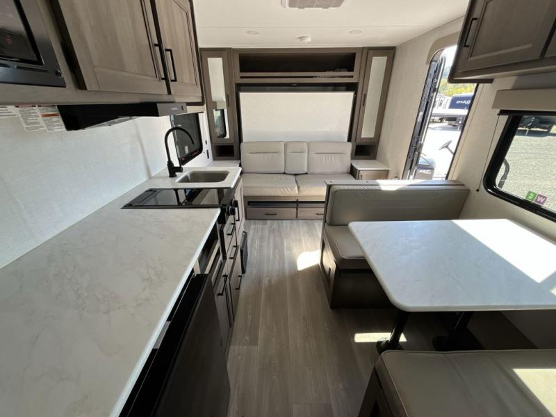 This is the perfect couple's trailer with versatile seating and sleeping space! You'll find a queen-size Murphy bed up front with storage space beside and above plus a full rear bath for added privacy. Once you've made lunch in the full kitchen, you can dine at the booth dinette, or take your plate outdoors to sit under the 10' power awning. You'll also find an unobstructed pass-thru storage outside that will be perfect for fishing poles, lawn chairs, tools and more!