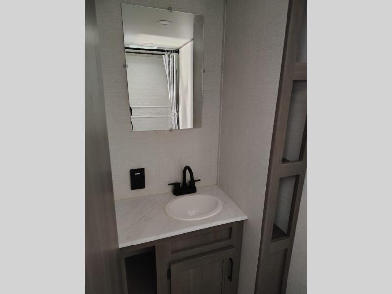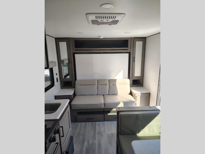 This is the perfect couple's trailer with versatile seating and sleeping space! You'll find a queen-size Murphy bed up front with storage space beside and above plus a full rear bath for added privacy. Once you've made lunch in the full kitchen, you can dine at the booth dinette, or take your plate outdoors to sit under the 10' power awning. You'll also find an unobstructed pass-thru storage outside that will be perfect for fishing poles, lawn chairs, tools and more!