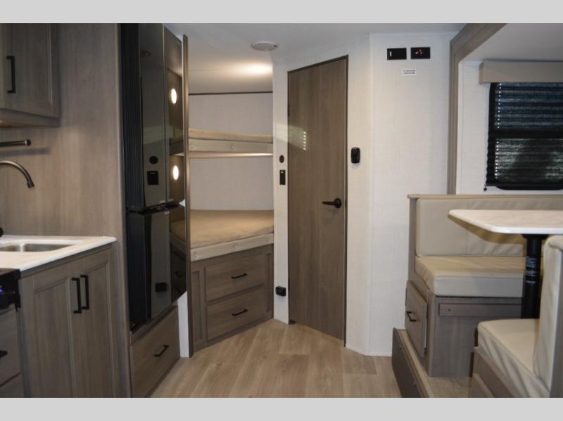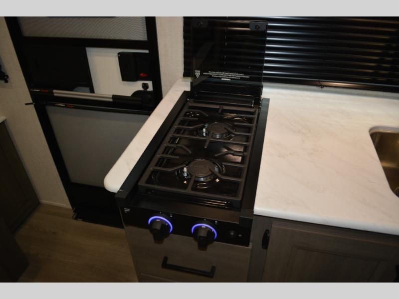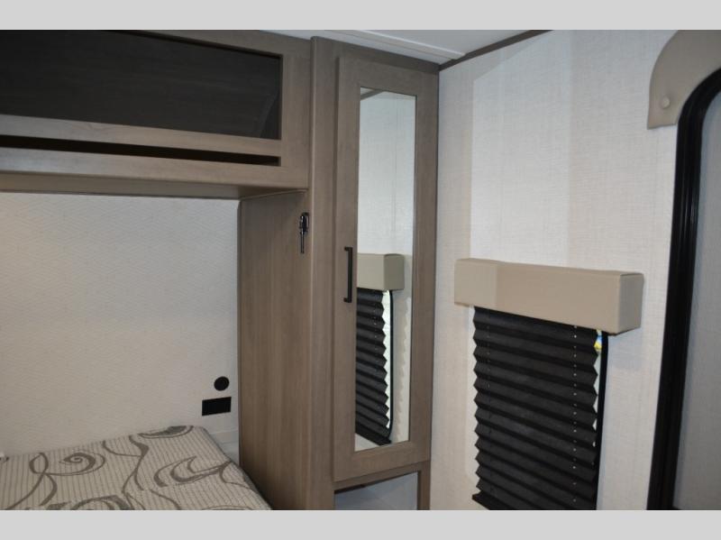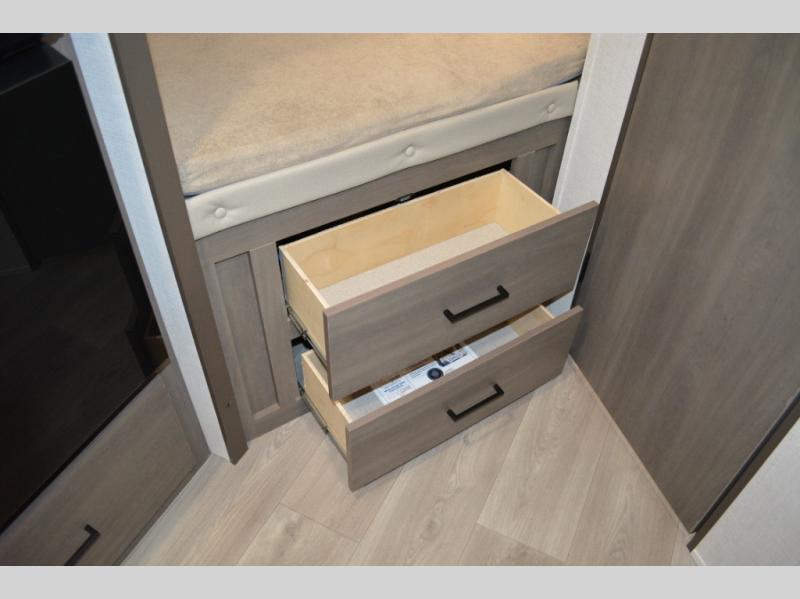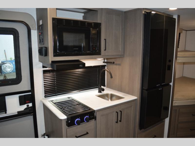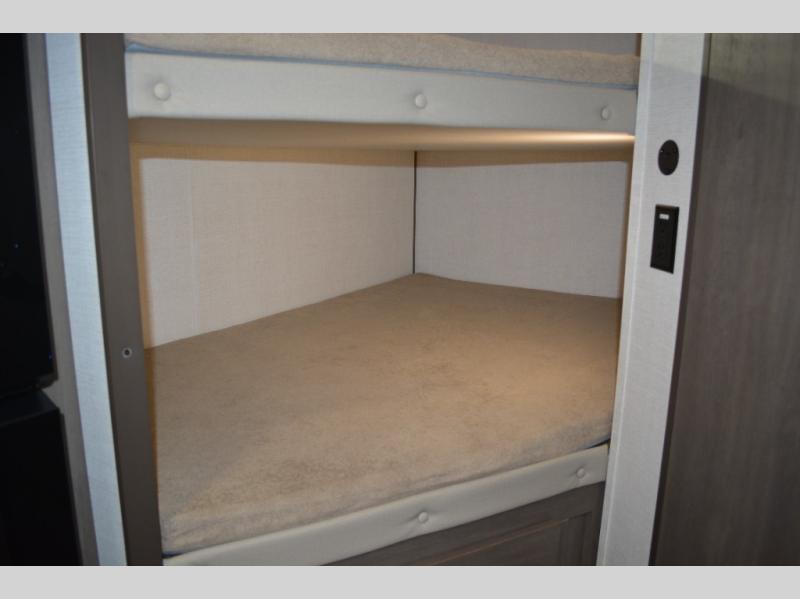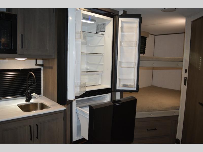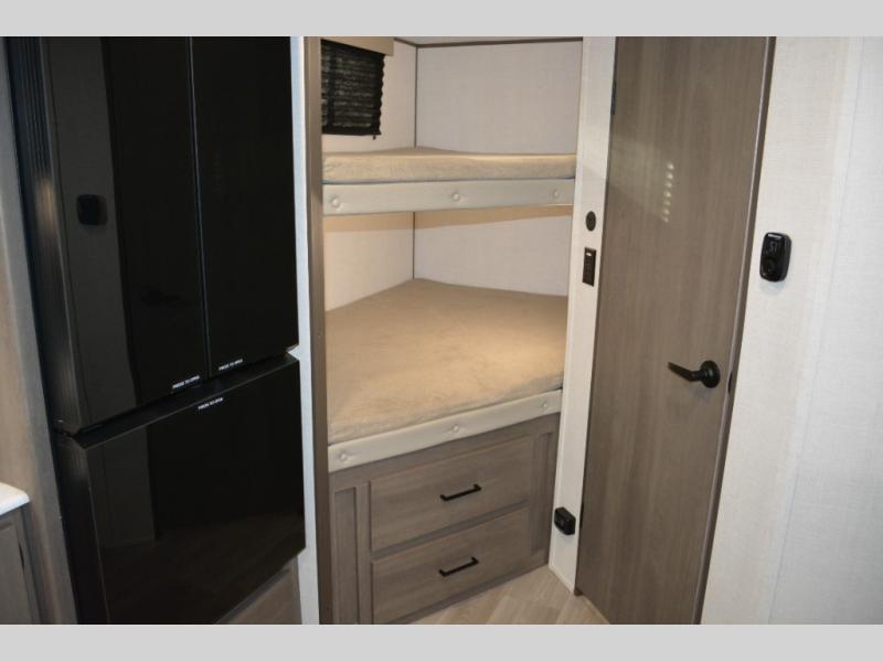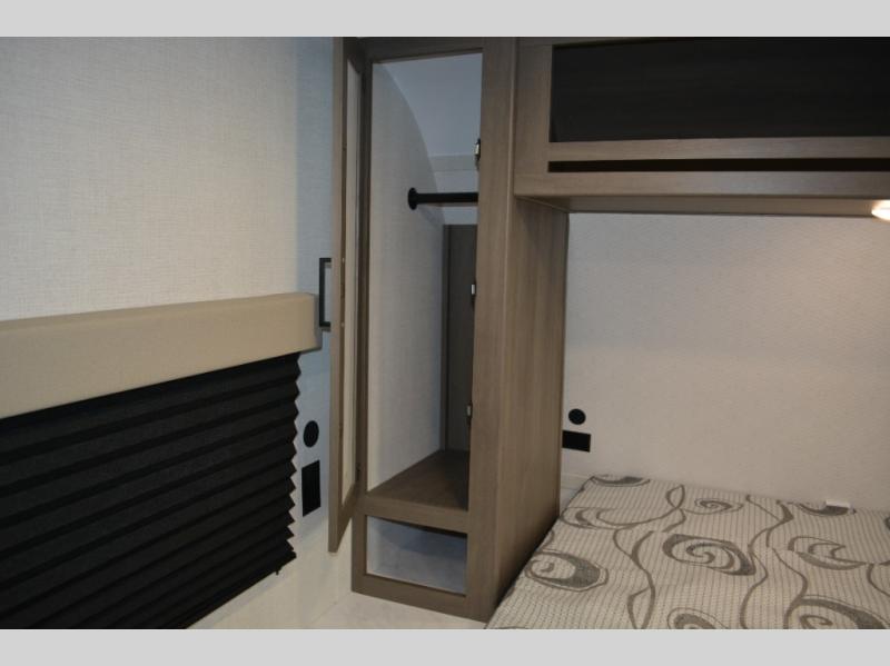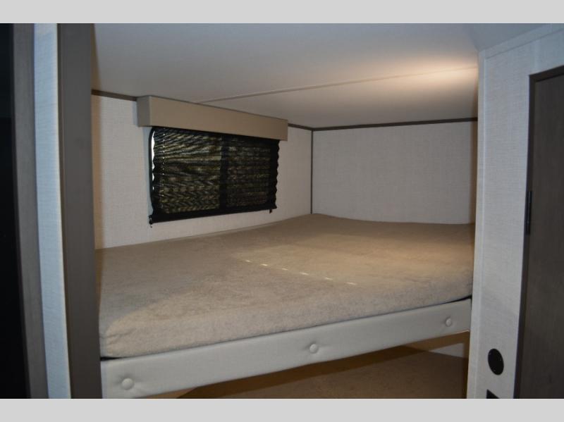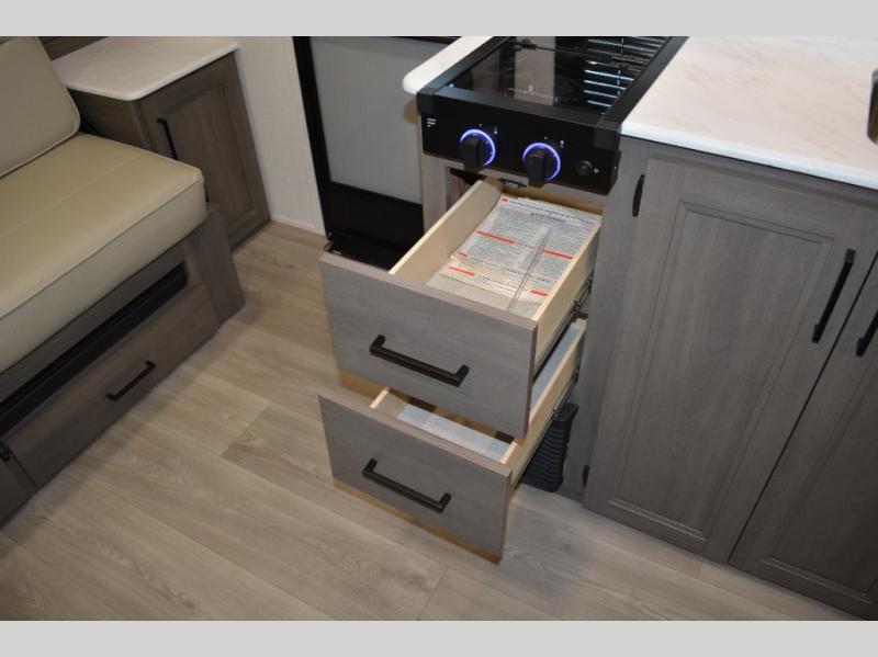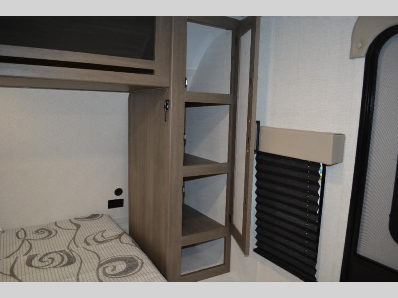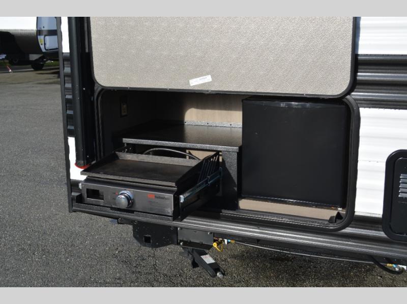 Spacious and versatile, this travel trailer is perfect for weekend trips to the campground or weeklong visits to the lake! There is a front Murphy bed with storage on both sides plus a pull-out pet drawer to keep your furry friends happy. Your guests or little ones will love the double-size bunks with privacy curtains, and the full bath is right next to the bunks for easy nighttime use. Once you make breakfast on the two burner range, you can dine at the booth dinette slide. And this model also includes an outdoor griddle and refrigerator if you want to make breakfast outdoors. Additional exterior features include a 16' power awning, an interior/exterior table, and a pass-thru storage for larger camp gear.