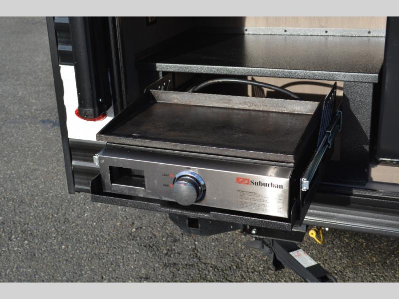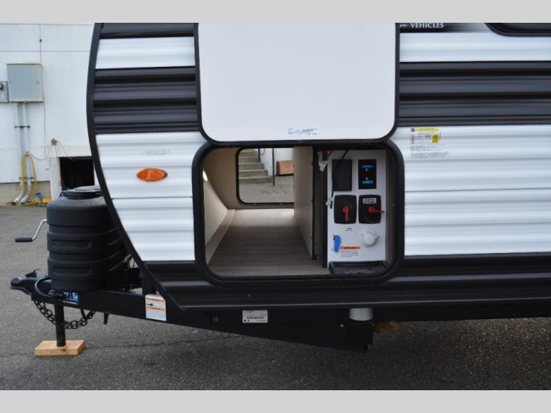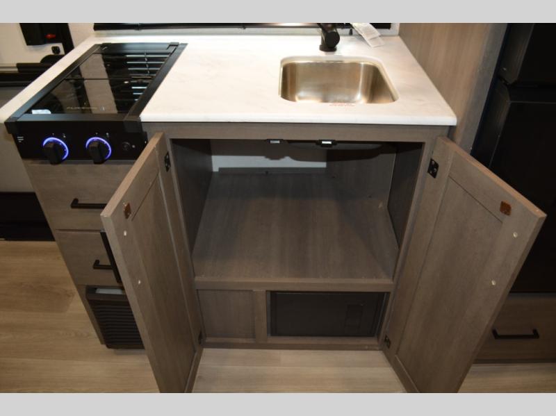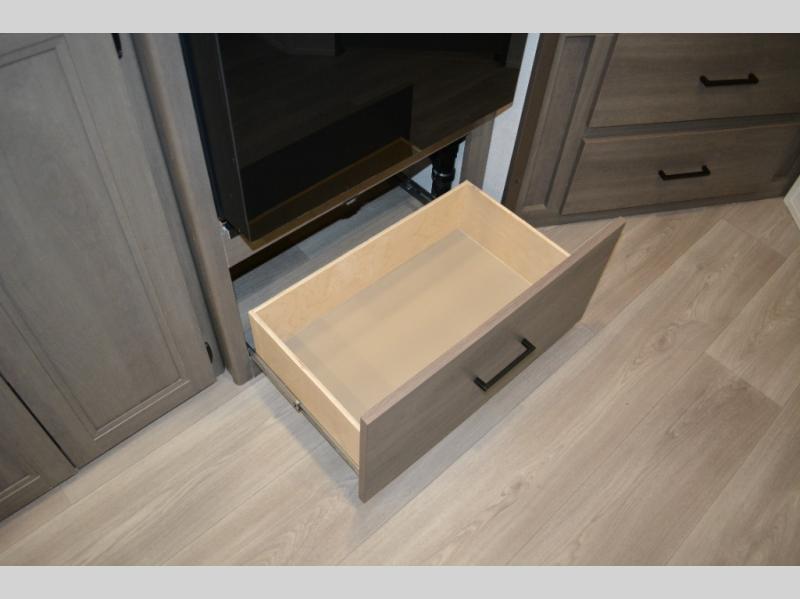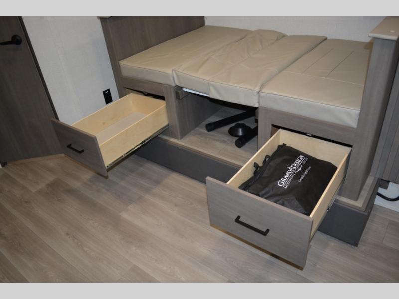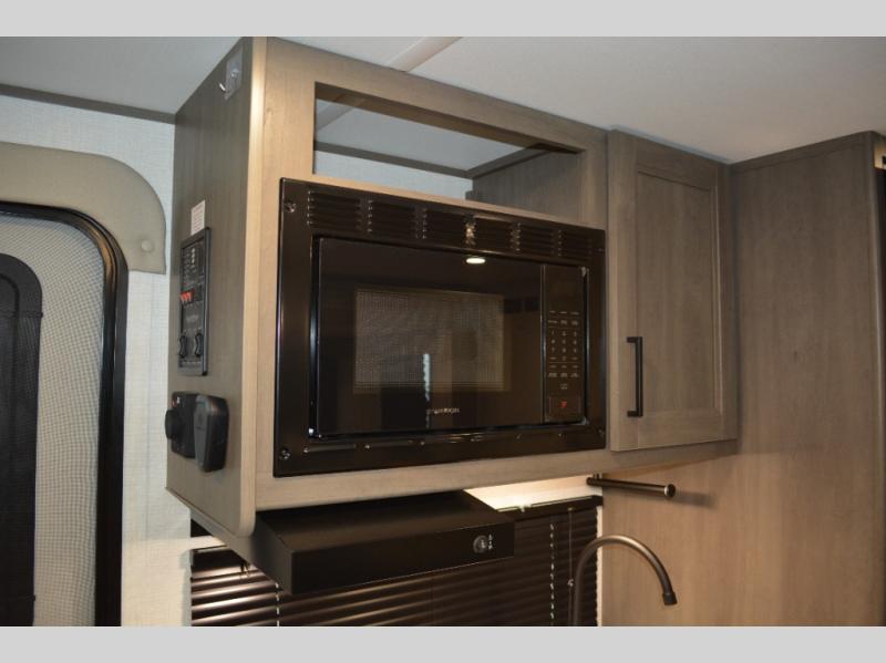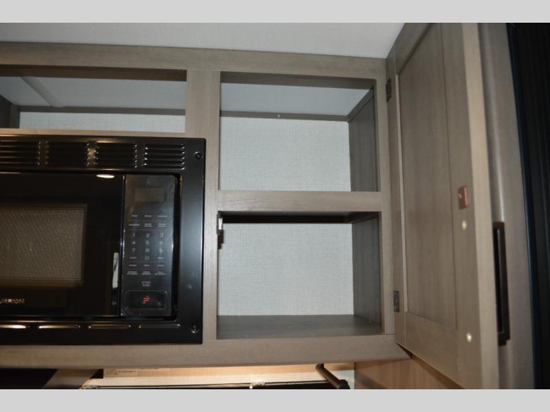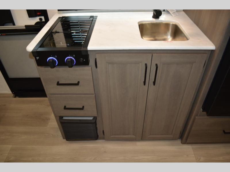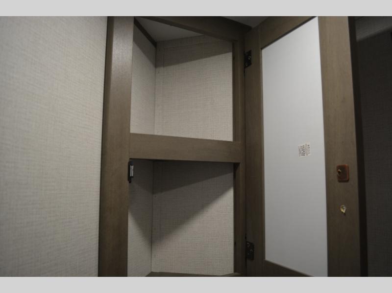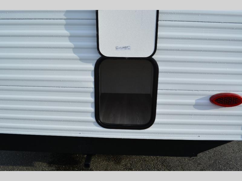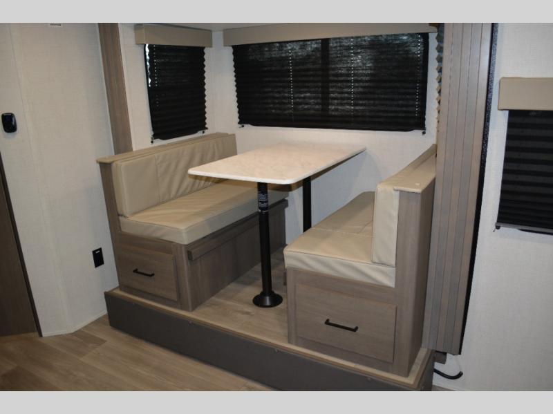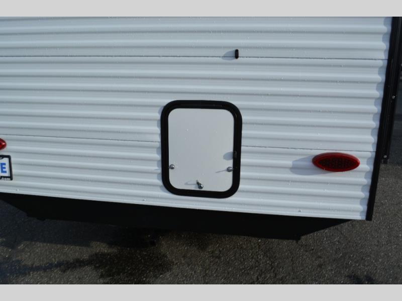 Spacious and versatile, this travel trailer is perfect for weekend trips to the campground or weeklong visits to the lake! There is a front Murphy bed with storage on both sides plus a pull-out pet drawer to keep your furry friends happy. Your guests or little ones will love the double-size bunks with privacy curtains, and the full bath is right next to the bunks for easy nighttime use. Once you make breakfast on the two burner range, you can dine at the booth dinette slide. And this model also includes an outdoor griddle and refrigerator if you want to make breakfast outdoors. Additional exterior features include a 16' power awning, an interior/exterior table, and a pass-thru storage for larger camp gear.