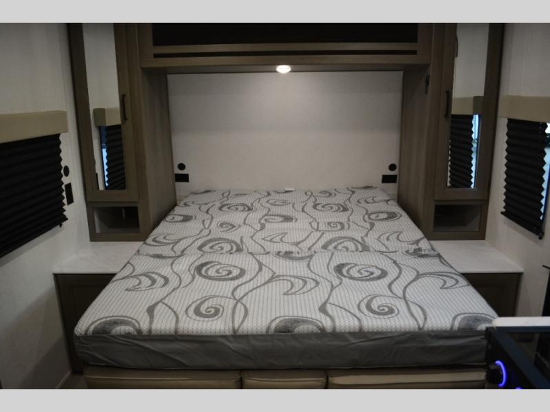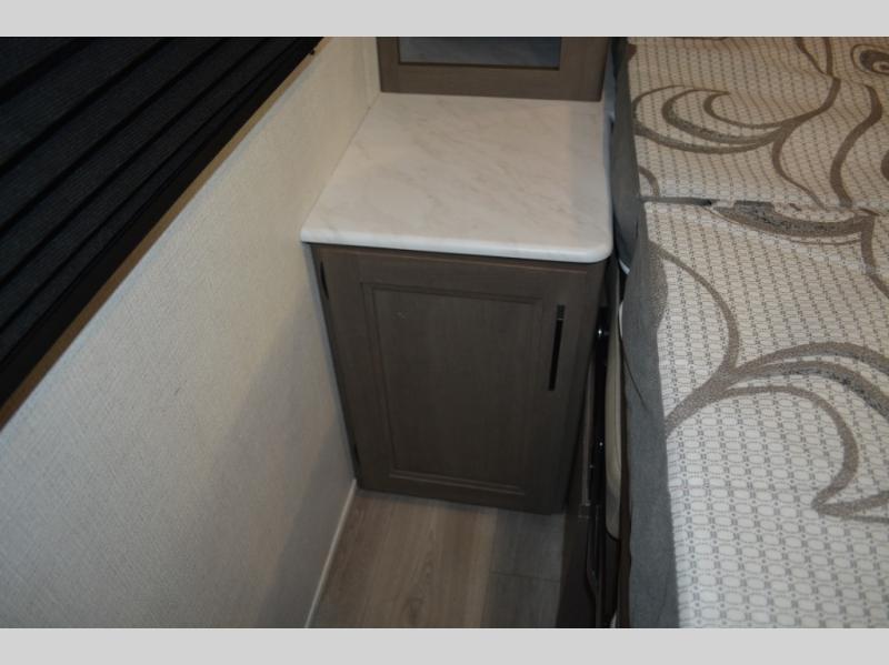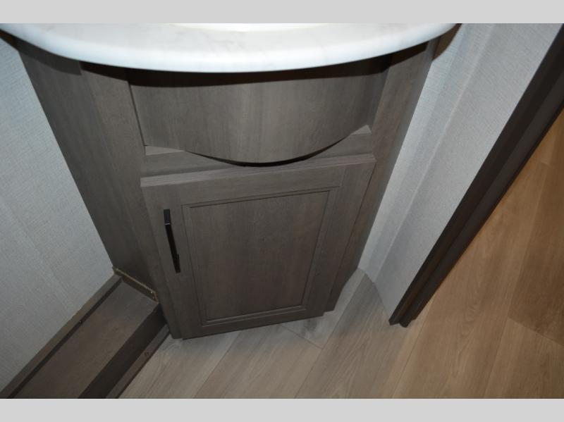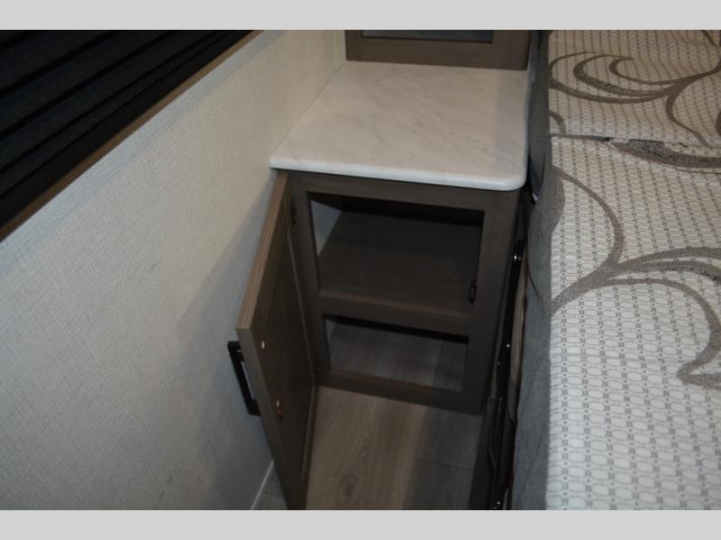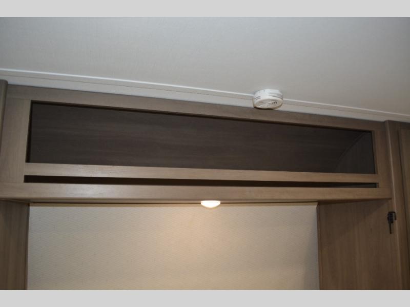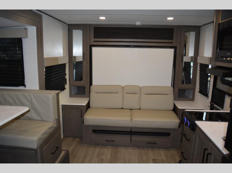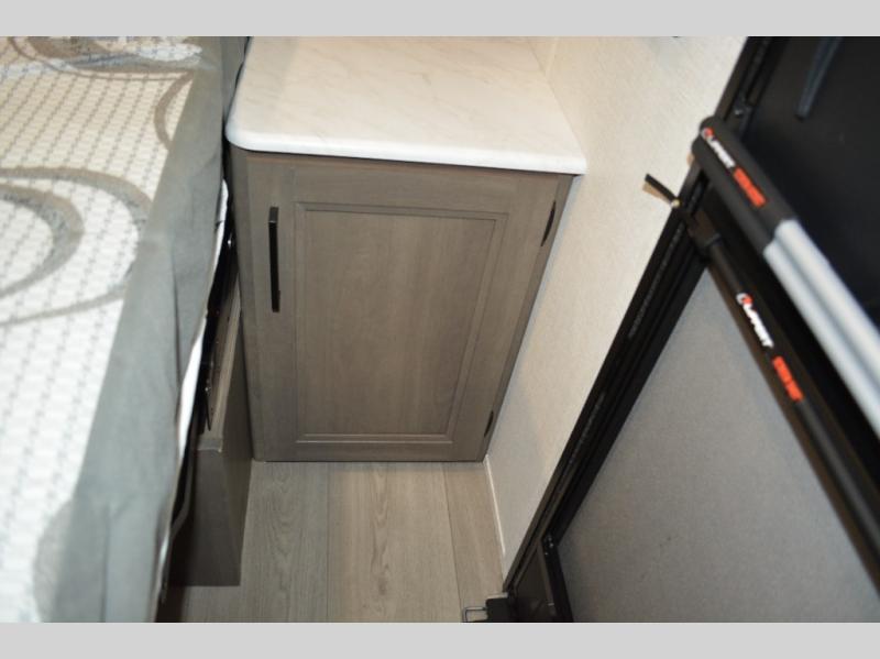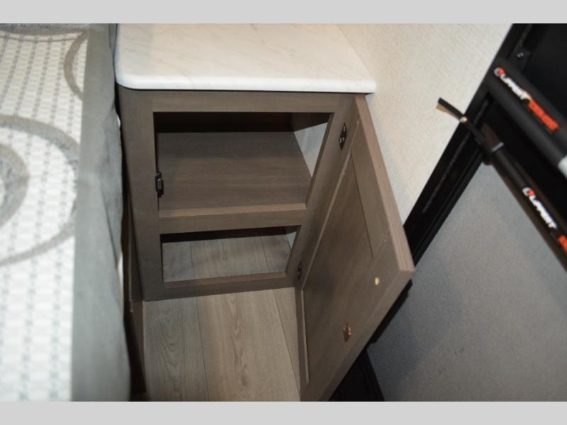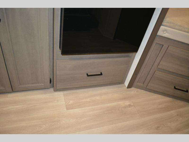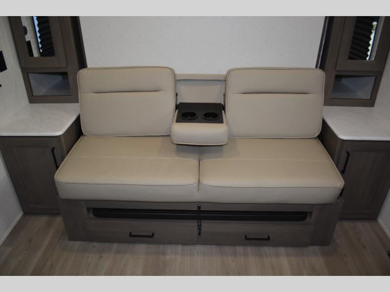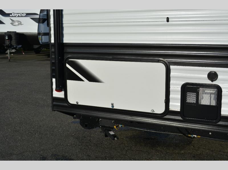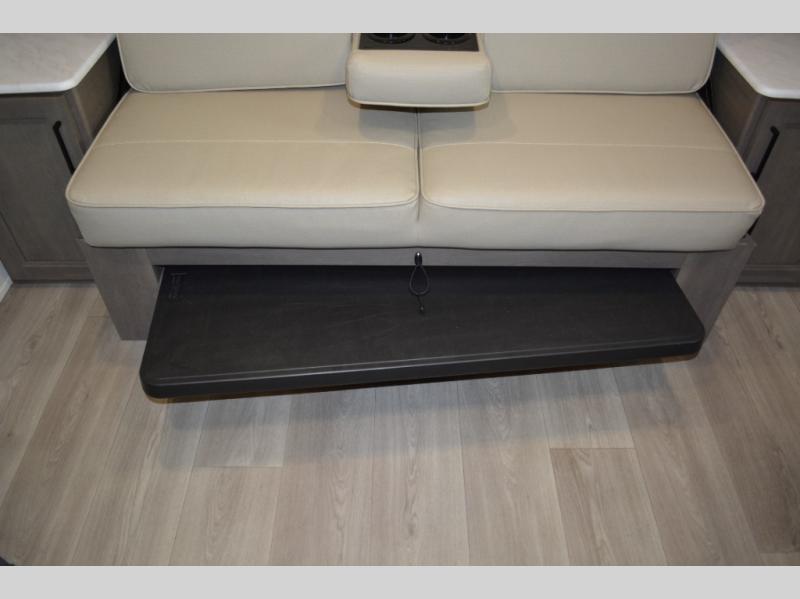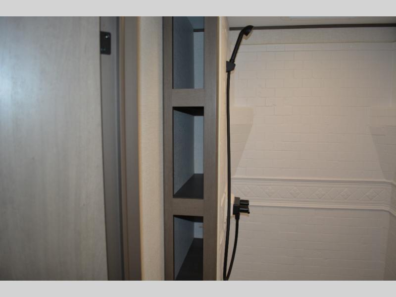 Spacious and versatile, this travel trailer is perfect for weekend trips to the campground or weeklong visits to the lake! There is a front Murphy bed with storage on both sides plus a pull-out pet drawer to keep your furry friends happy. Your guests or little ones will love the double-size bunks with privacy curtains, and the full bath is right next to the bunks for easy nighttime use. Once you make breakfast on the two burner range, you can dine at the booth dinette slide. And this model also includes an outdoor griddle and refrigerator if you want to make breakfast outdoors. Additional exterior features include a 16' power awning, an interior/exterior table, and a pass-thru storage for larger camp gear.