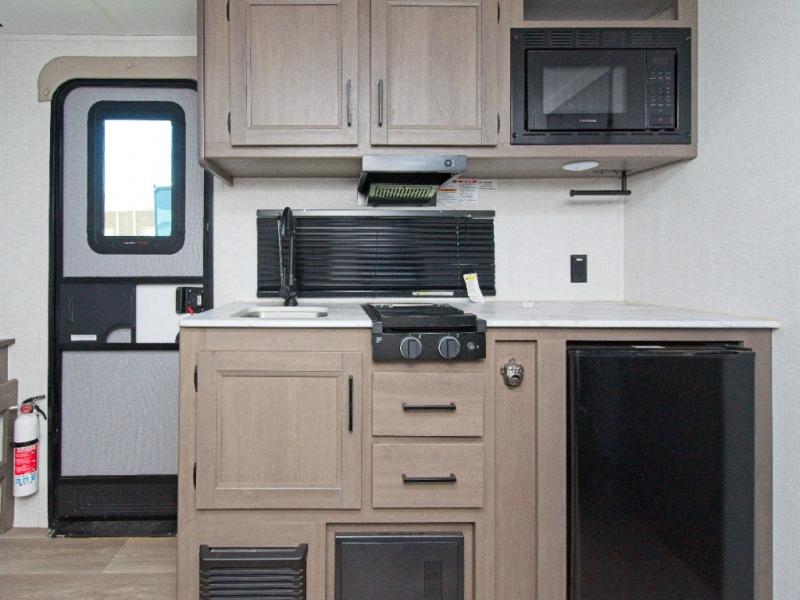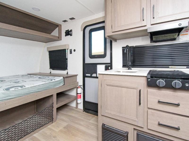 Make your camping trips easier and more enjoyable with the Transcend One 151BH! Perfect for families or couples, this lightweight travel trailer features 28" x 67" bunks next to the private bath for convenience, plus a front queen bed with hidden storage. The 66" jackknife sofa adds extra sleeping space for guests, and the full kitchen lets you prepare meals indoors or use the exterior LP quick connect for grilling outside.