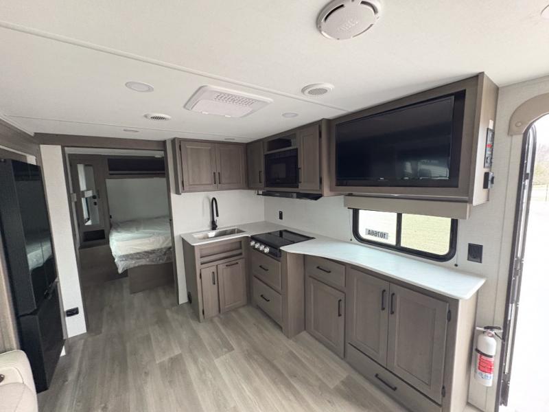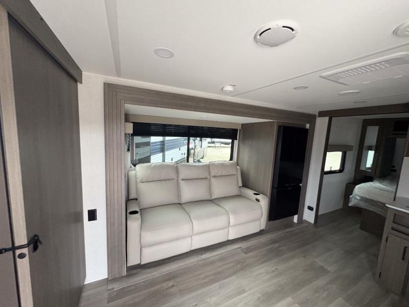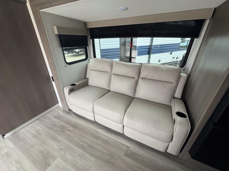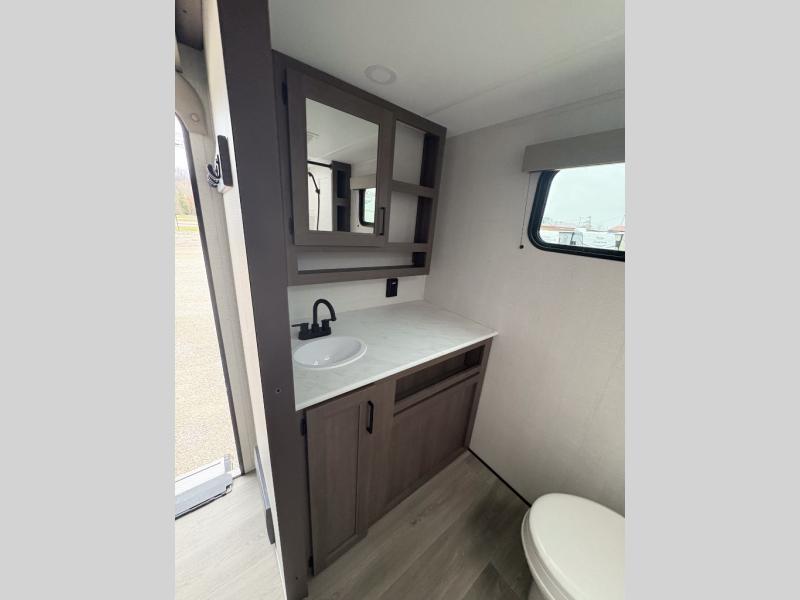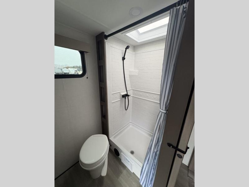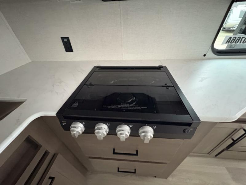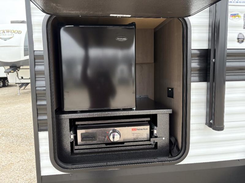 Pack your bags and head for the campground in this spacious travel trailer! Once you arrive, you can unload the pass-thru storage, then make lunch on the exterior griddle with a 1.7 cu. ft. exterior refrigerator. The U-shaped dinette slide will provide a place to dine if you decide not to stay outside under the 16' power awning. Optional theater seats can be chosen in place of the dinette for even more comfort! You'll sleep soundly on the queen bed in the front bedroom, and the full rear bath lets you freshen up each day.