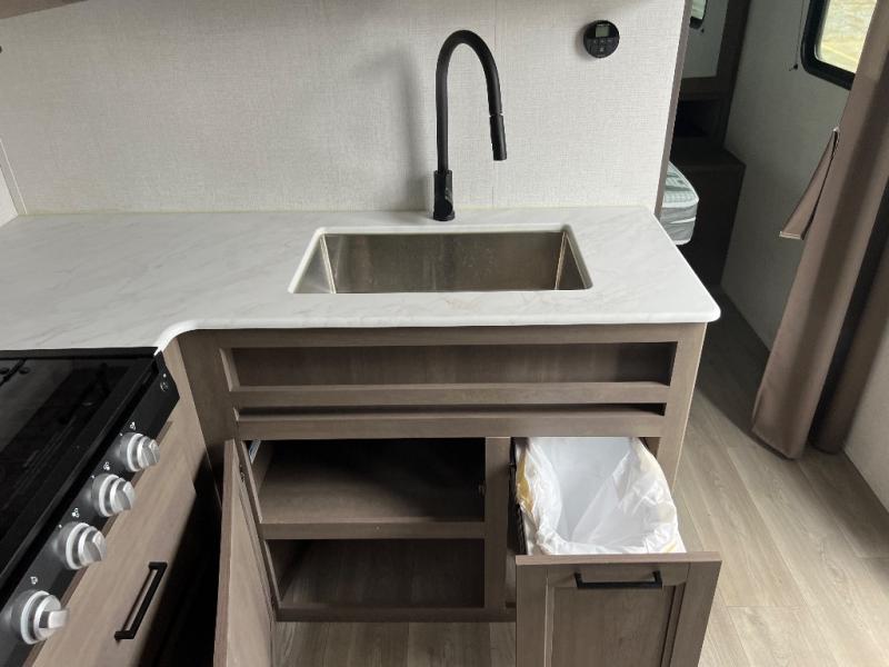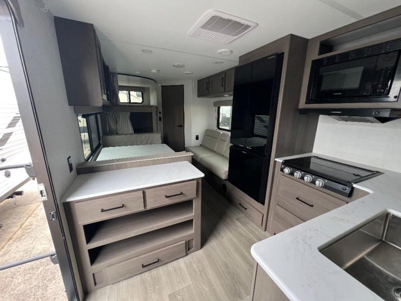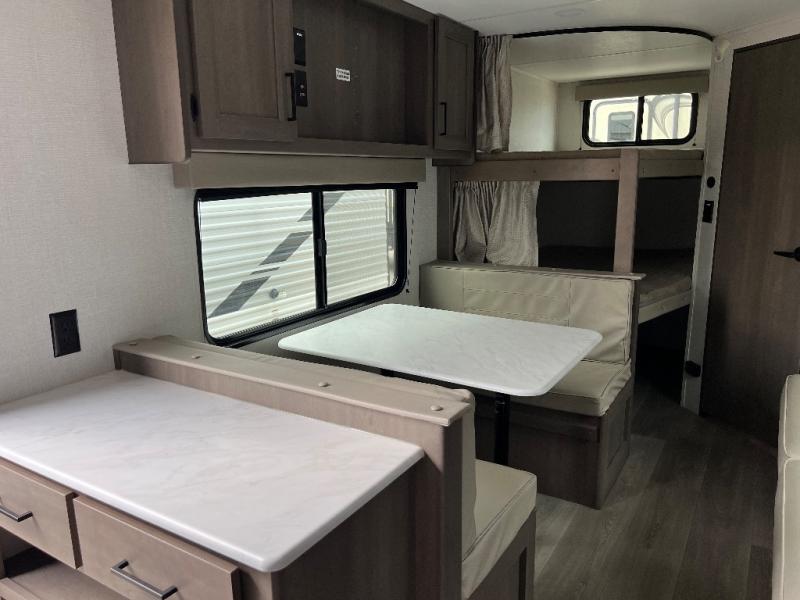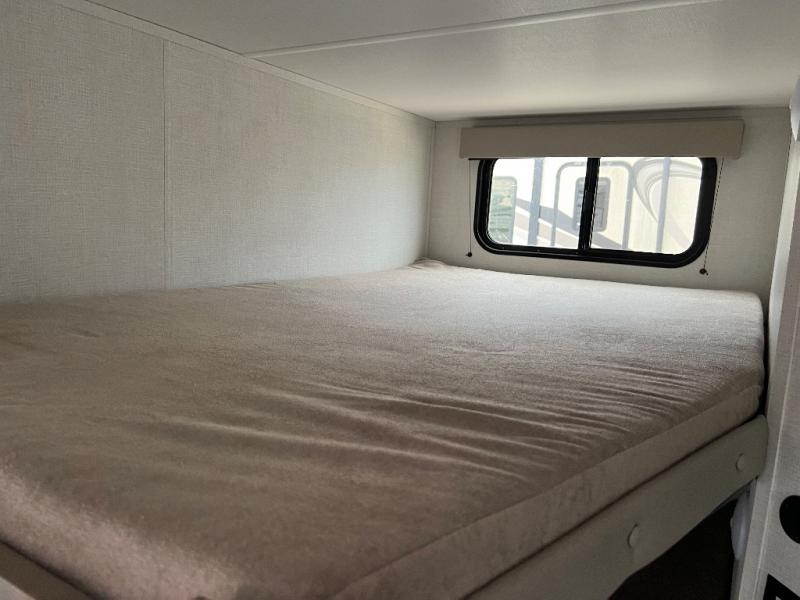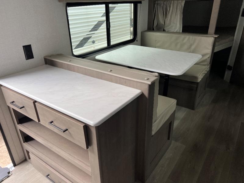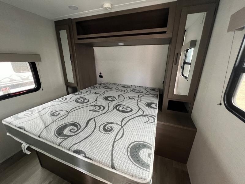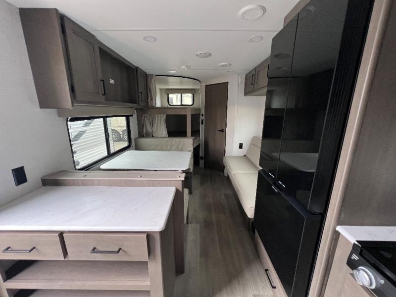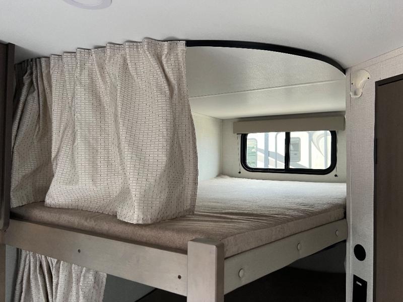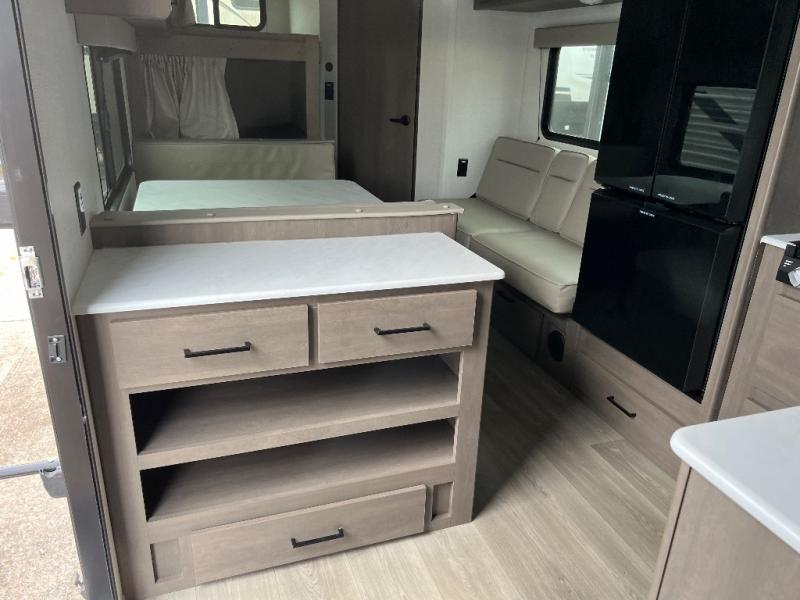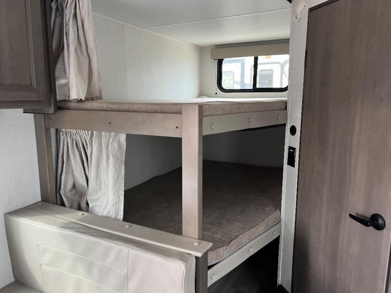This is the perfect travel trailer if you like to camp with friends and family. Since there are double-size bunks, a queen bed in the front bedroom, plus a booth dinette and sofa, you can sleep eight campers each night! The three burner range and microwave in the kitchen will let you cook meals each day, and the 12V refrigerator will keep your cold items fresh. This model also includes a counter with extra storage underneath, a pull-out trash can storage for convenience, and a full bath to freshen up in each day. And you'll love having your own space in the front bedroom with a privacy curtain, dual wardrobes, and TV prep if you want to add a television!