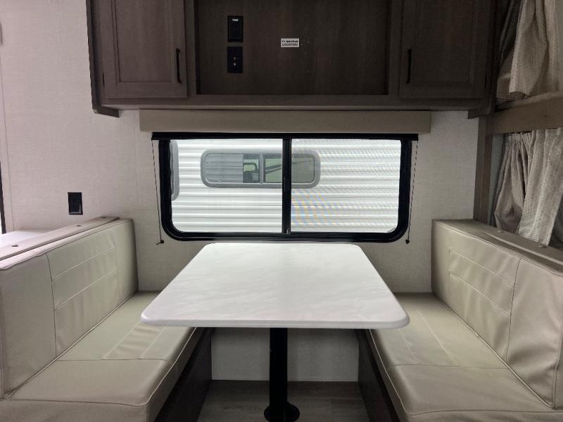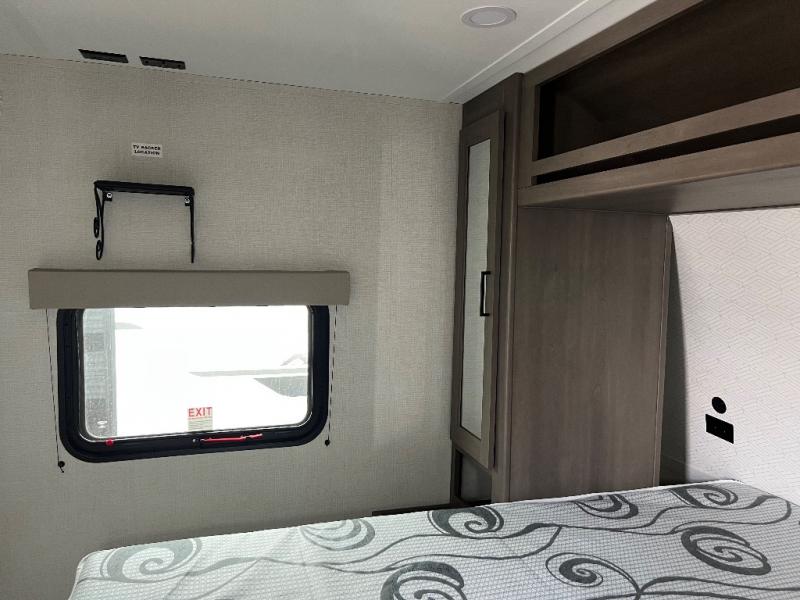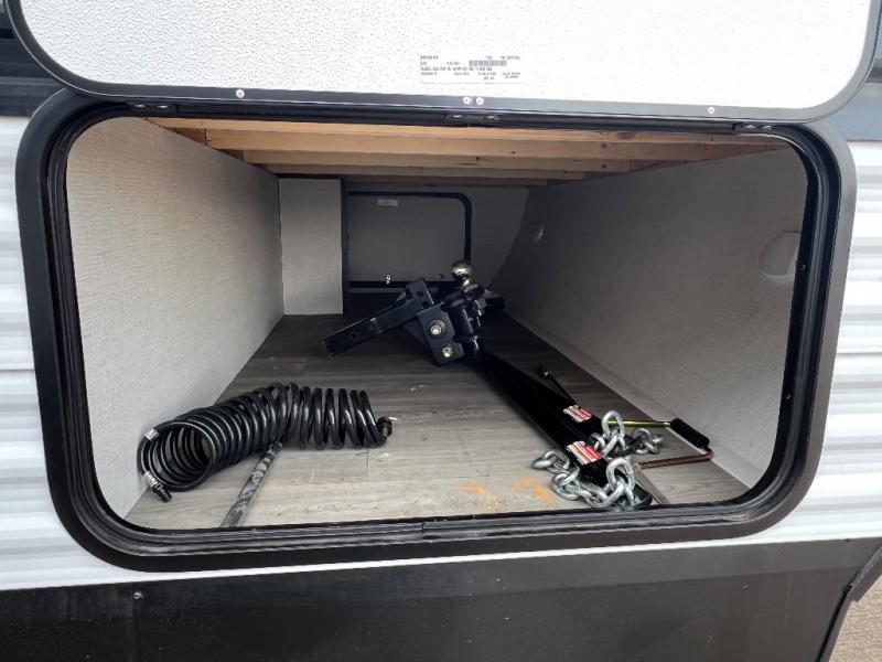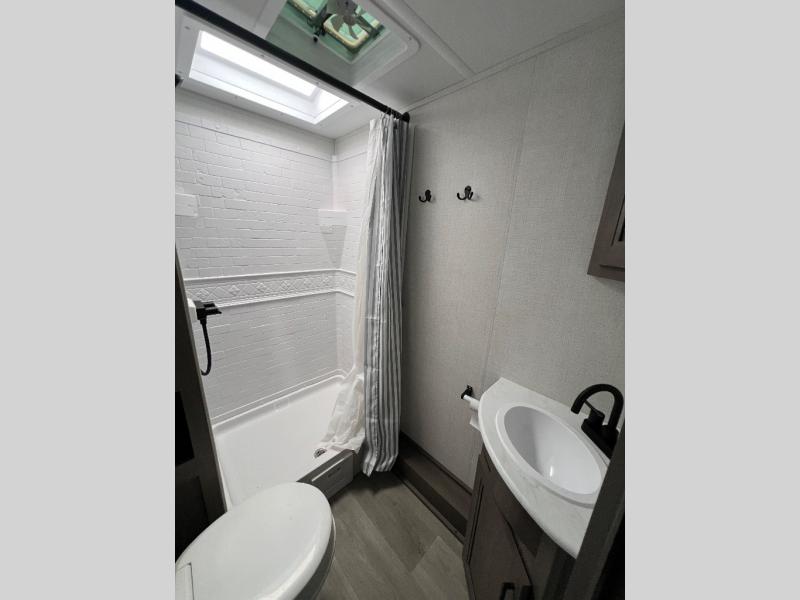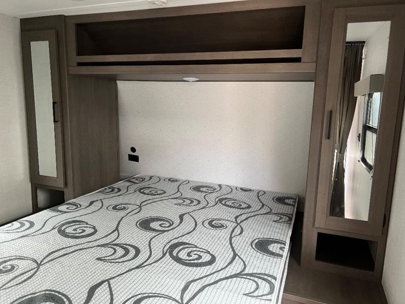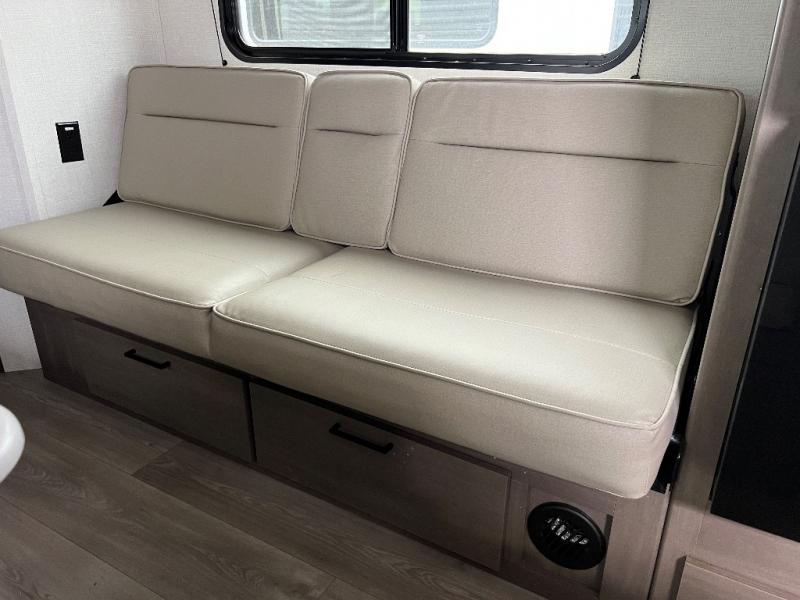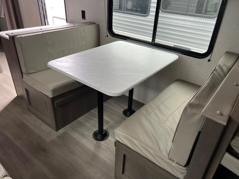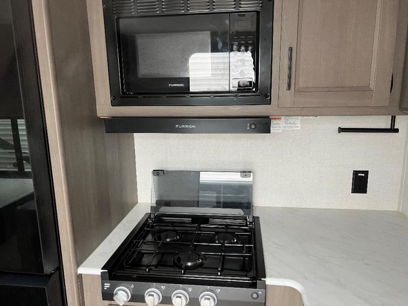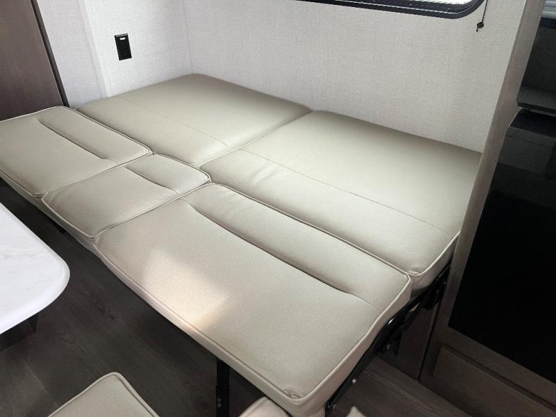 This is the perfect travel trailer if you like to camp with friends and family. Since there are double-size bunks, a queen bed in the front bedroom, plus a booth dinette and sofa, you can sleep eight campers each night! The three burner range and microwave in the kitchen will let you cook meals each day, and the 12V refrigerator will keep your cold items fresh. This model also includes a counter with extra storage underneath, a pull-out trash can storage for convenience, and a full bath to freshen up in each day. And you'll love having your own space in the front bedroom with a privacy curtain, dual wardrobes, and TV prep if you want to add a television!