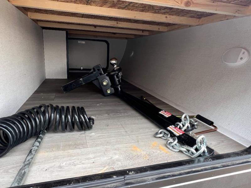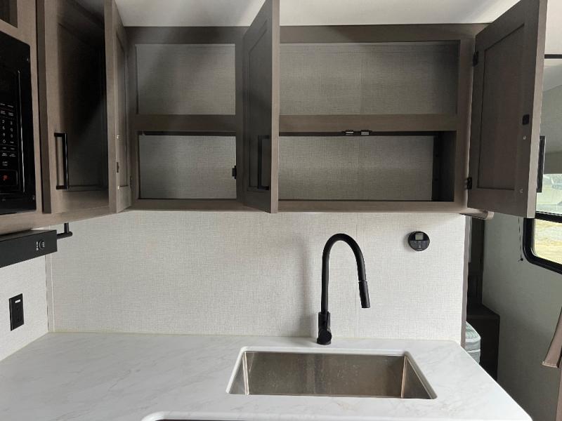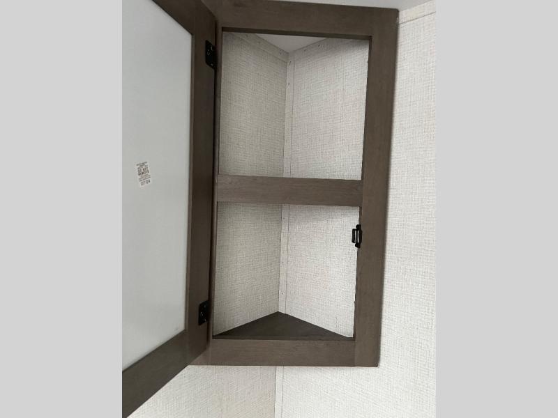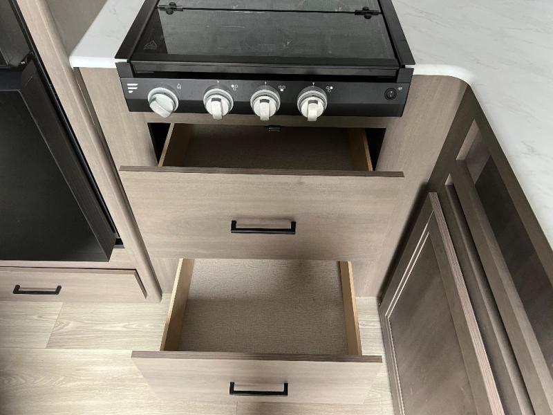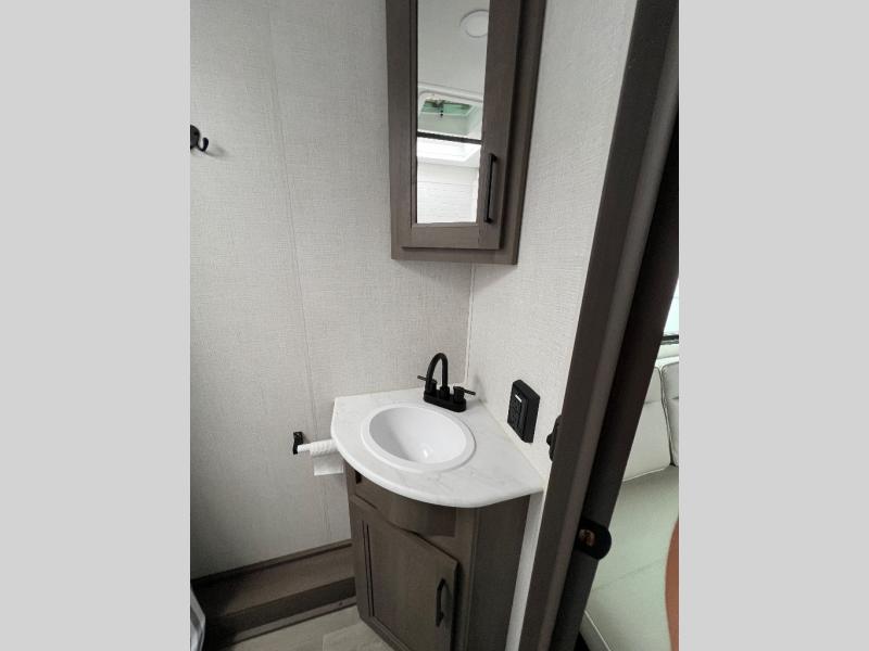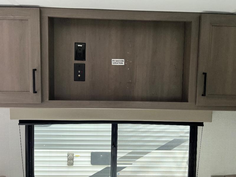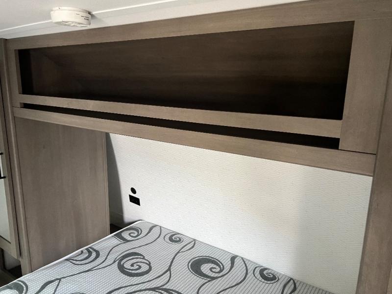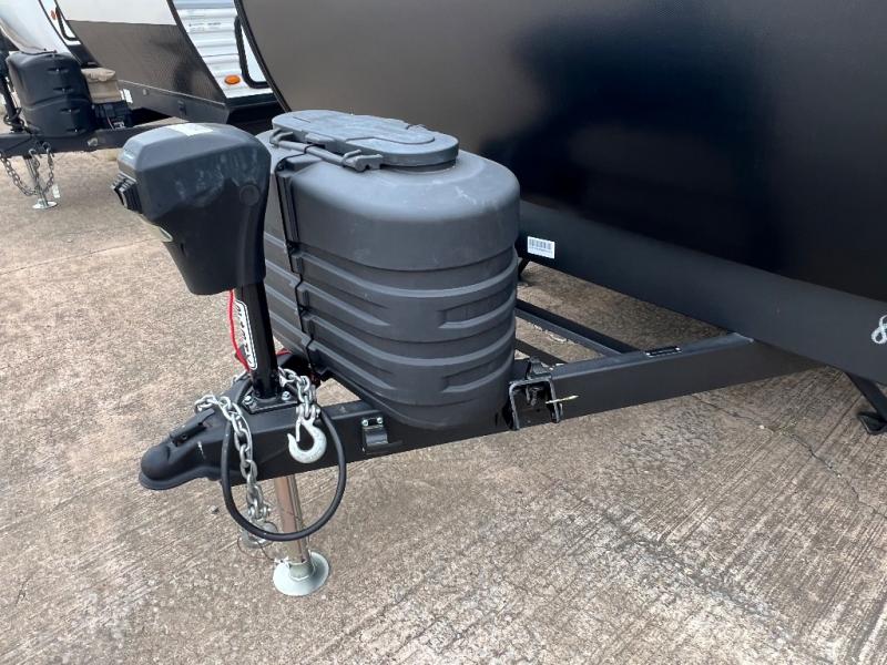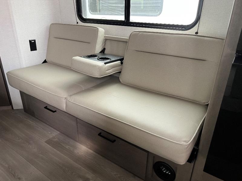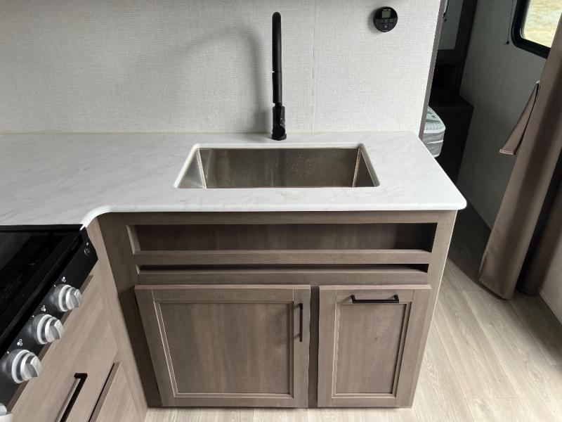 This is the perfect travel trailer if you like to camp with friends and family. Since there are double-size bunks, a queen bed in the front bedroom, plus a booth dinette and sofa, you can sleep eight campers each night! The three burner range and microwave in the kitchen will let you cook meals each day, and the 12V refrigerator will keep your cold items fresh. This model also includes a counter with extra storage underneath, a pull-out trash can storage for convenience, and a full bath to freshen up in each day. And you'll love having your own space in the front bedroom with a privacy curtain, dual wardrobes, and TV prep if you want to add a television!