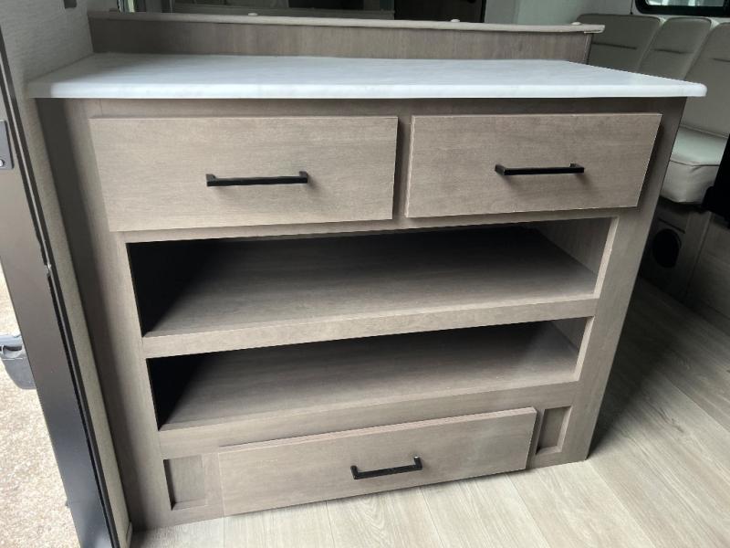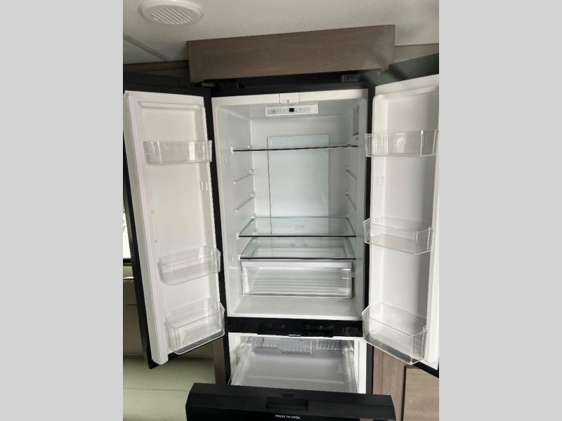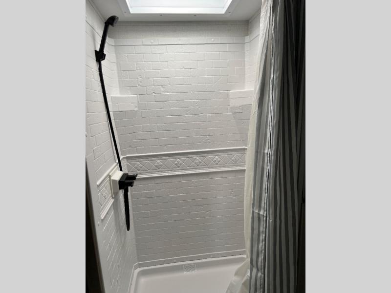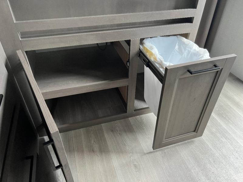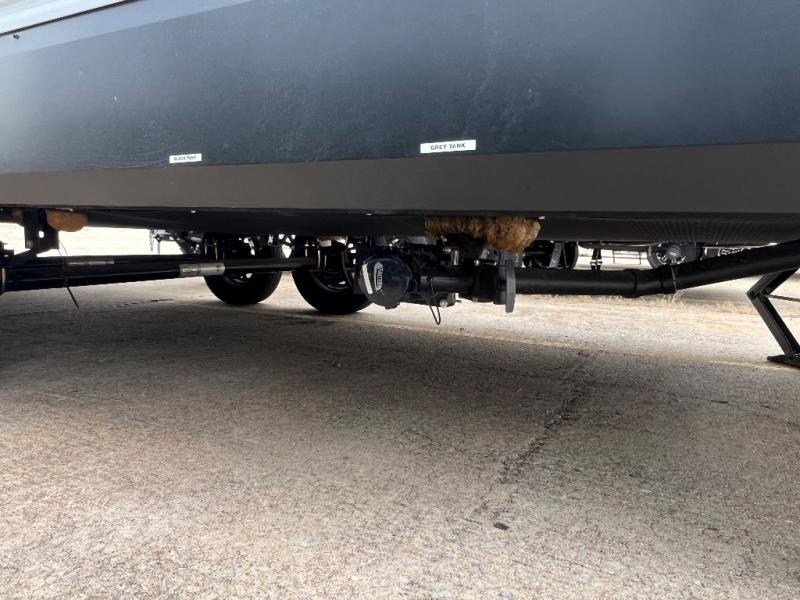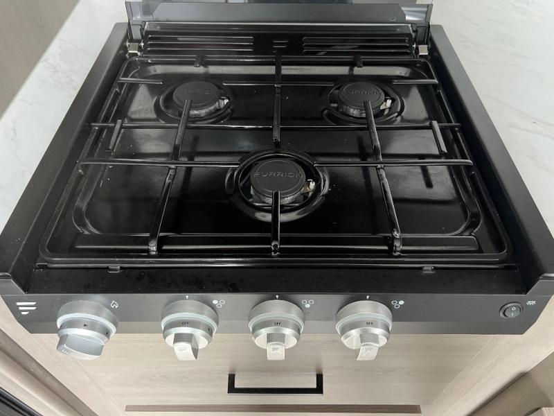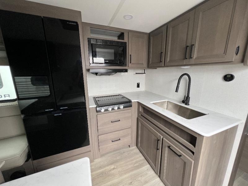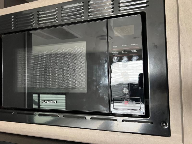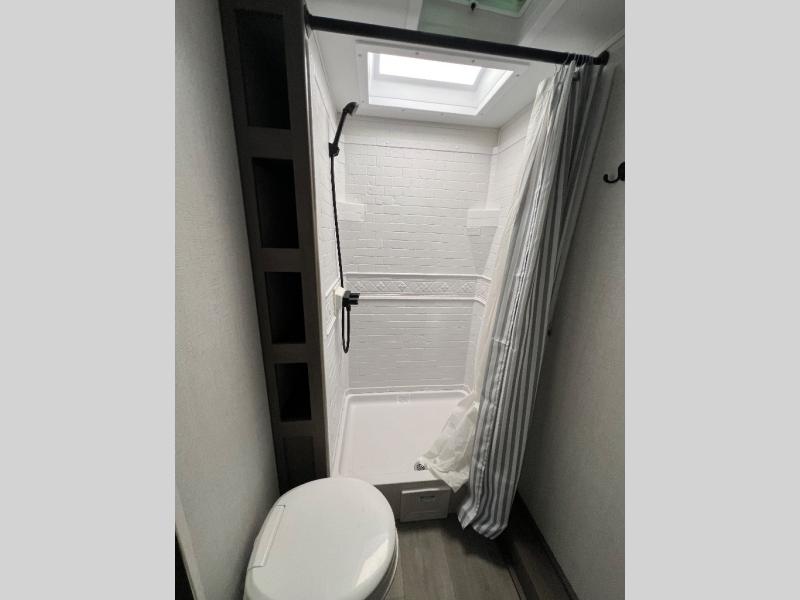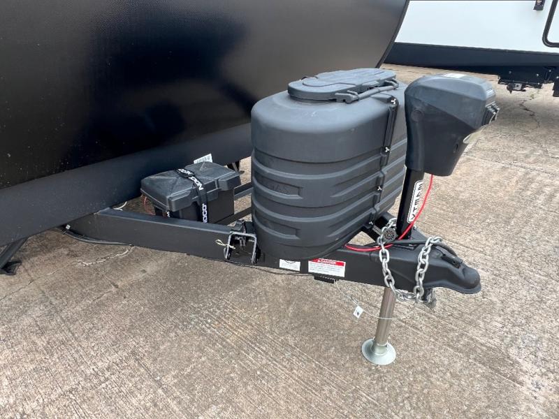 This is the perfect travel trailer if you like to camp with friends and family. Since there are double-size bunks, a queen bed in the front bedroom, plus a booth dinette and sofa, you can sleep eight campers each night! The three burner range and microwave in the kitchen will let you cook meals each day, and the 12V refrigerator will keep your cold items fresh. This model also includes a counter with extra storage underneath, a pull-out trash can storage for convenience, and a full bath to freshen up in each day. And you'll love having your own space in the front bedroom with a privacy curtain, dual wardrobes, and TV prep if you want to add a television!