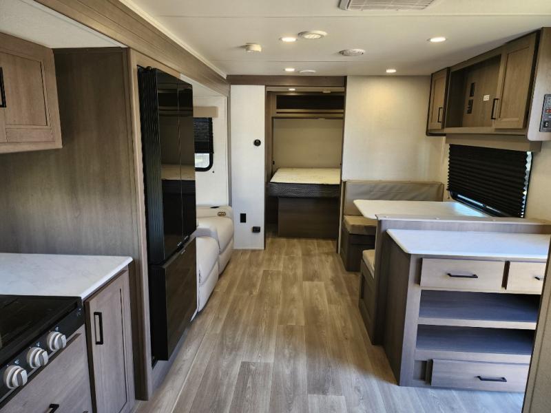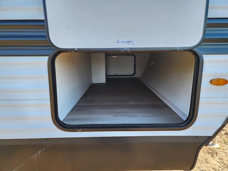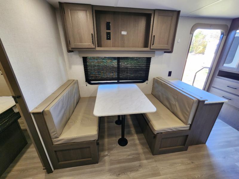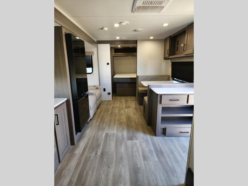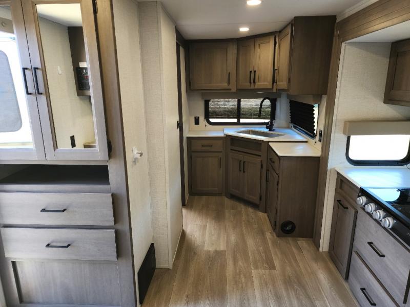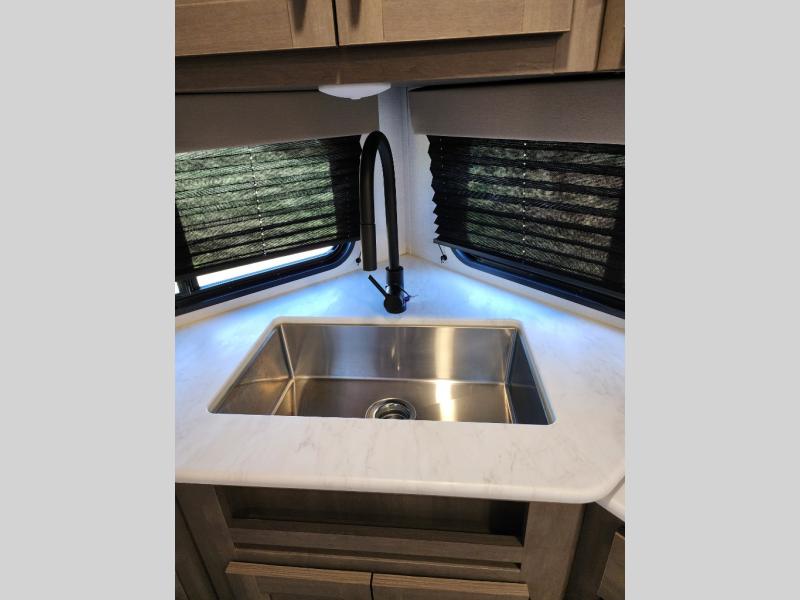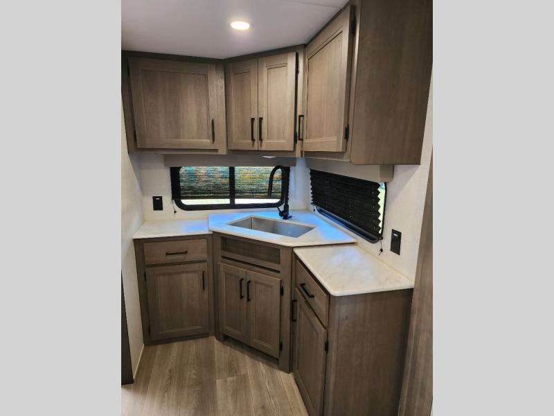 It will be so easy to enjoy camping trips in this travel trailer for five to six! The main living area is made spacious by the large slide out, and here you'll find the 60" sleeper sofa and the kitchen appliances. A booth dinette across the room provides a place to dine and play board games, or you can head outdoors to sit under the 17' power awning with LED lights. The queen bed in the front private bedroom will have you feeling right at home, and the TV prep here gives you the option to watch movies in bed. This model also includes a rear corner kitchen with ample counter space and a large sink, and you'll find the full bath in the other rear corner!