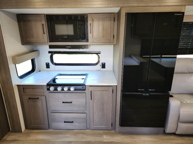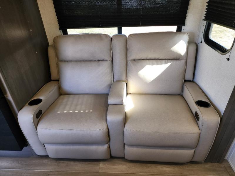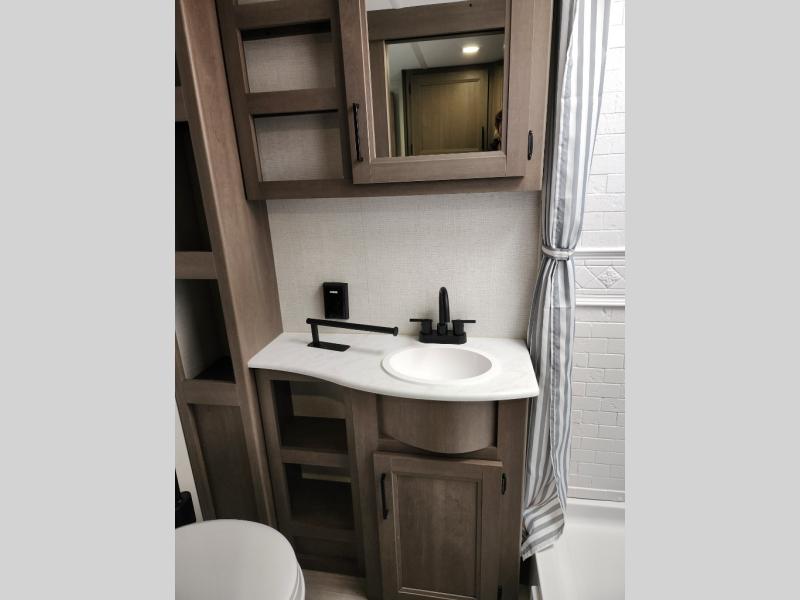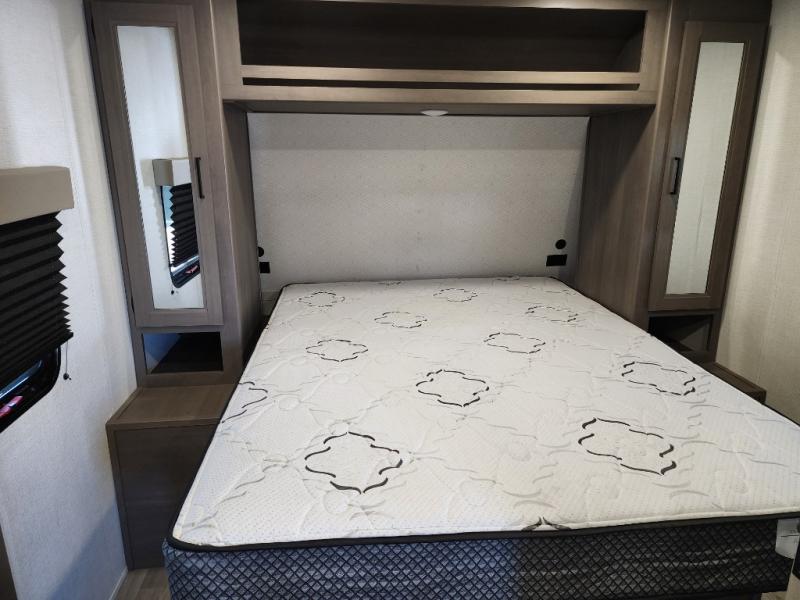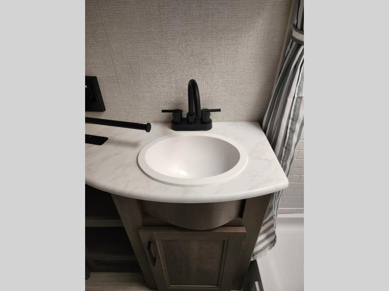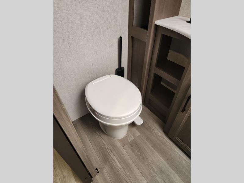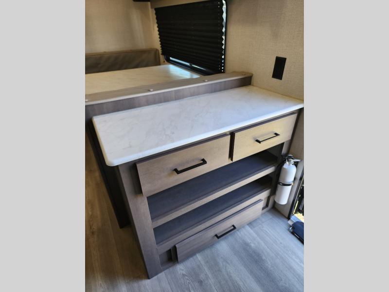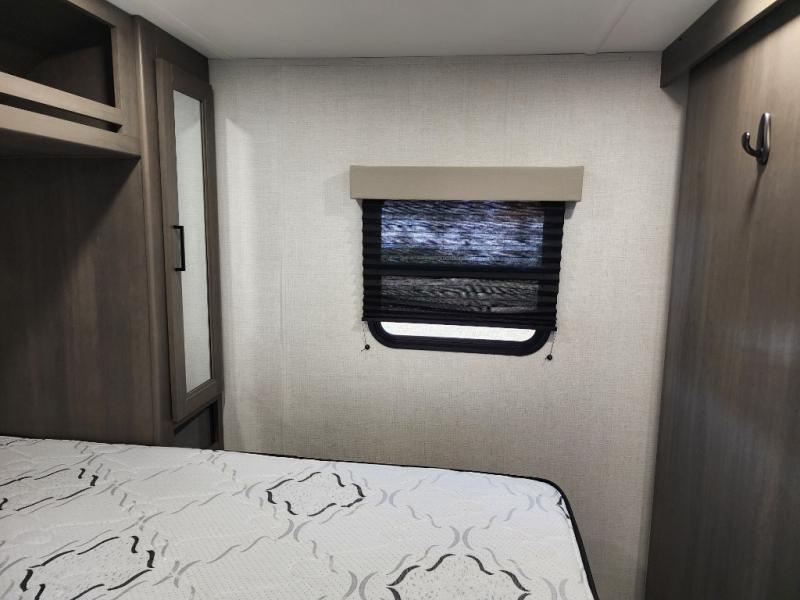 It will be so easy to enjoy camping trips in this travel trailer for five to six! The main living area is made spacious by the large slide out, and here you'll find the 60" sleeper sofa and the kitchen appliances. A booth dinette across the room provides a place to dine and play board games, or you can head outdoors to sit under the 17' power awning with LED lights. The queen bed in the front private bedroom will have you feeling right at home, and the TV prep here gives you the option to watch movies in bed. This model also includes a rear corner kitchen with ample counter space and a large sink, and you'll find the full bath in the other rear corner!