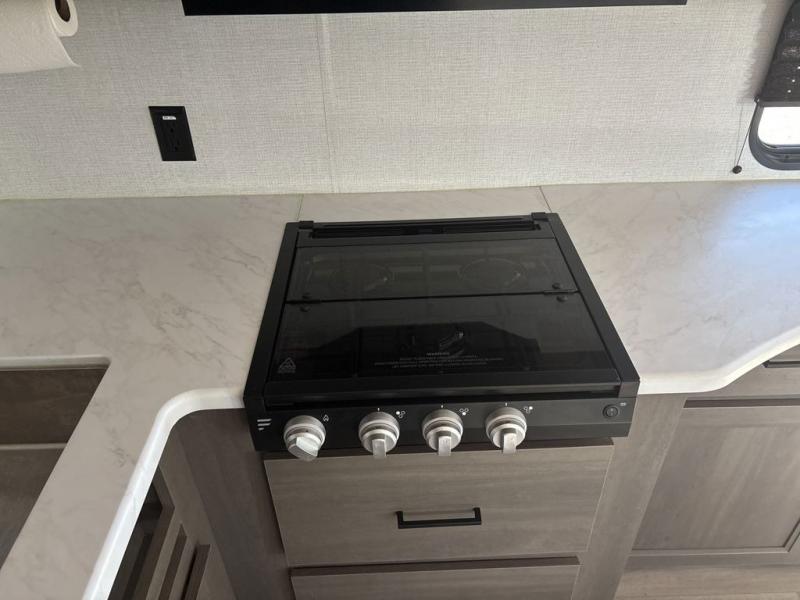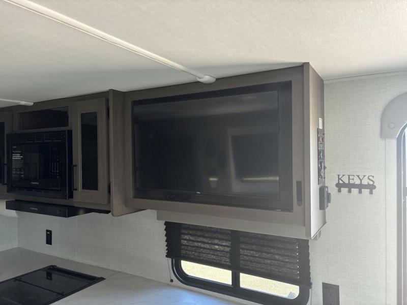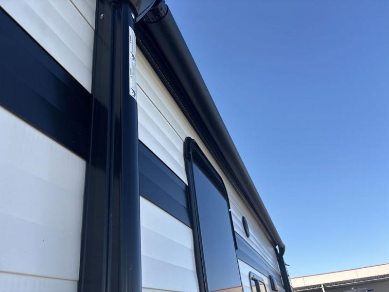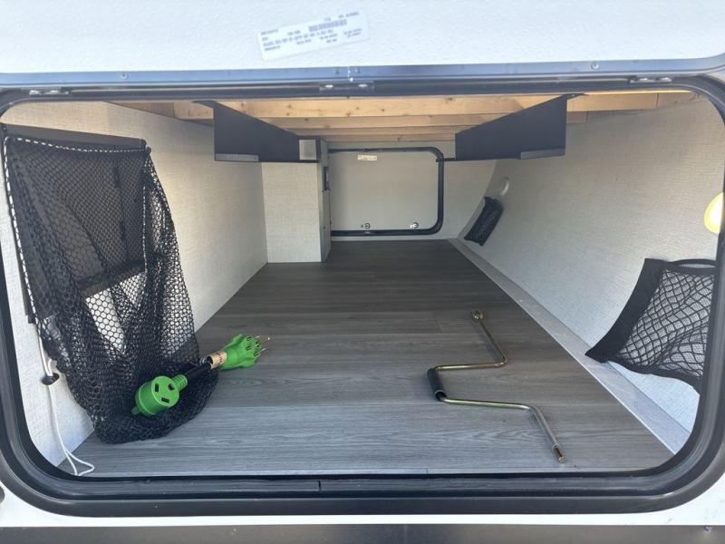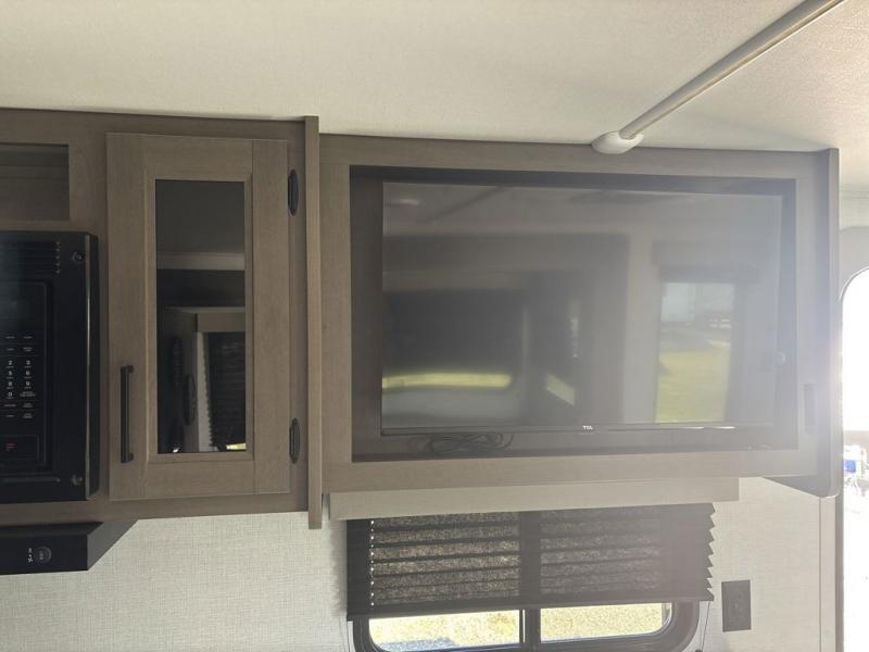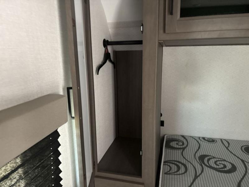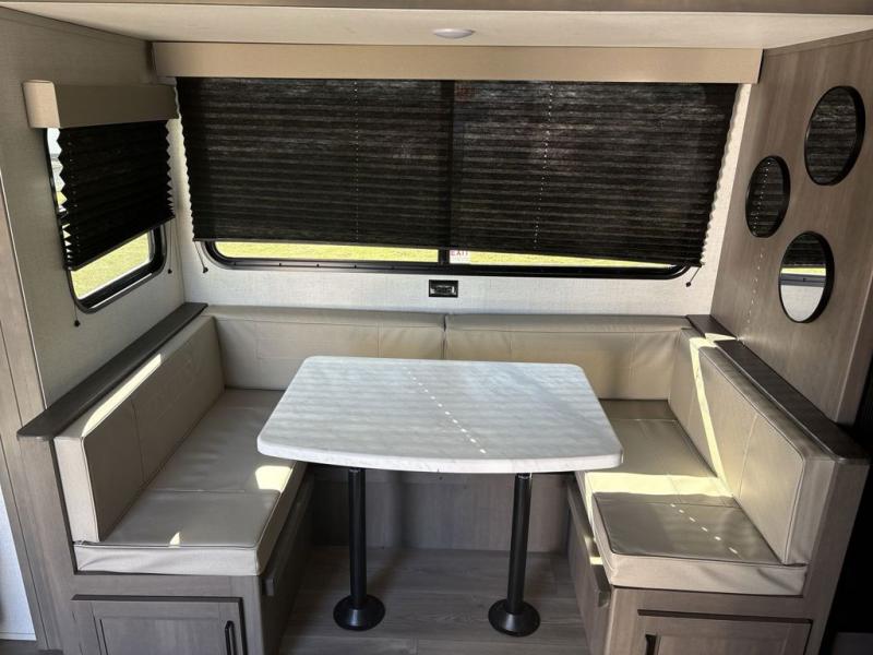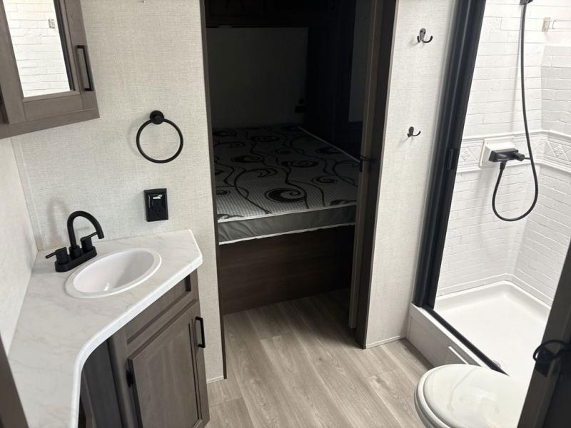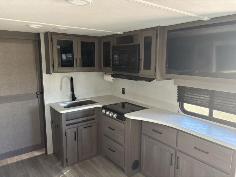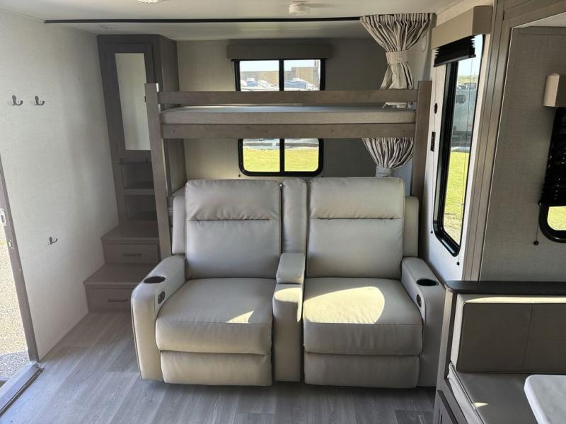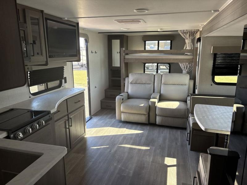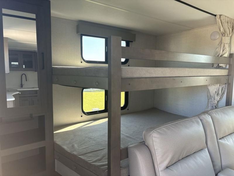 Your crew of eight will love camping in this spacious travel trailer! There are double-size bunks in the back with step storage and an added wardrobe for your guests' things plus exterior storage for camp gear galore. A walk-thru bath will create a front master bedroom you are sure to love, especially with its queen bed, wardrobe storage, and private exterior entry door! The main living area will be a favorite place to hang out with its U-shaped dinette, theater seating and 32" TV. If the weather is nice, you may just find yourselves outdoors since there is a rear exterior griddle and 1.7 cu. ft. refrigerator!