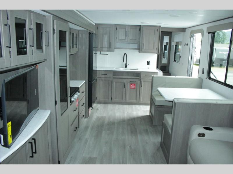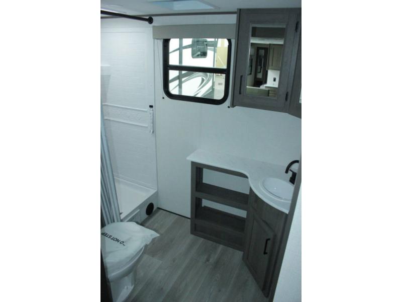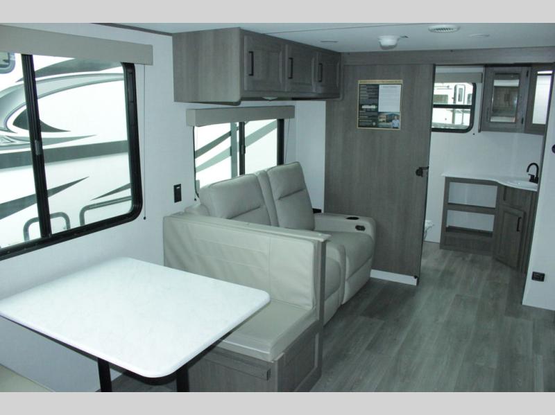 Your search for the perfect couple's trailer is over with this RV in tow! You will enjoy your own private bedroom up front with a queen bed, overhead storage, and TV prep if you choose to bring along your own television. The spacious full rear bath includes a linen closet and a walk-in shower to easily clean up each day. Relax on the 60" sleeper sofa after a long day outdoors, or you can choose the optional theater seating if you don't need additional sleeping space. The booth dinette can also be used for an overnight guest or two little ones. This model also includes plenty of storage space and plenty of counter space to prep and cook at-home meals! Finally relax under the shade of the massive 19' awning.