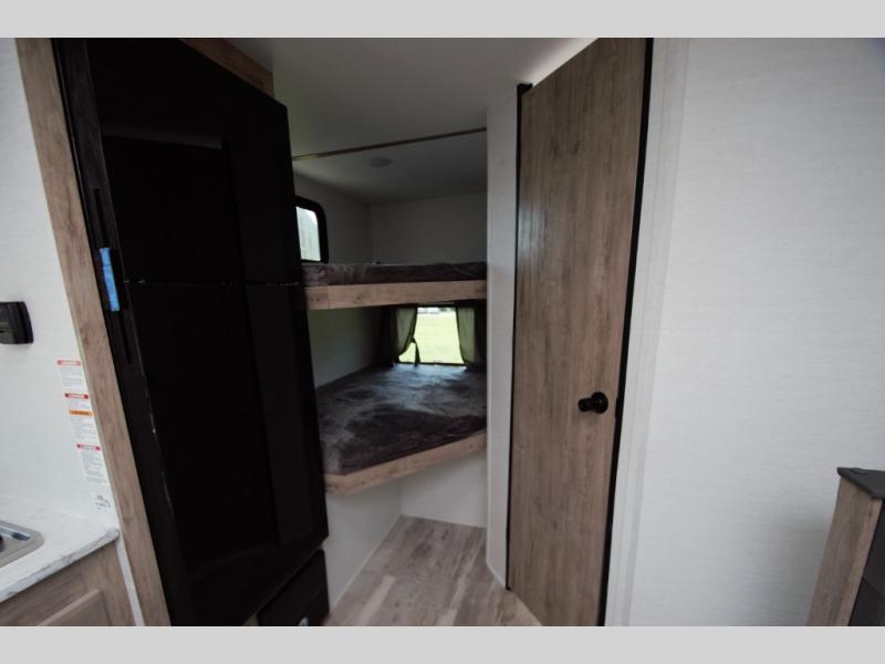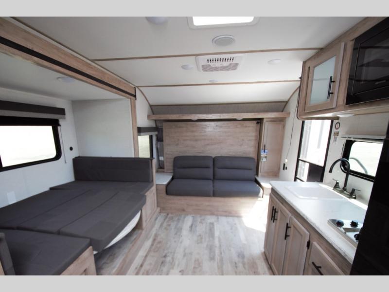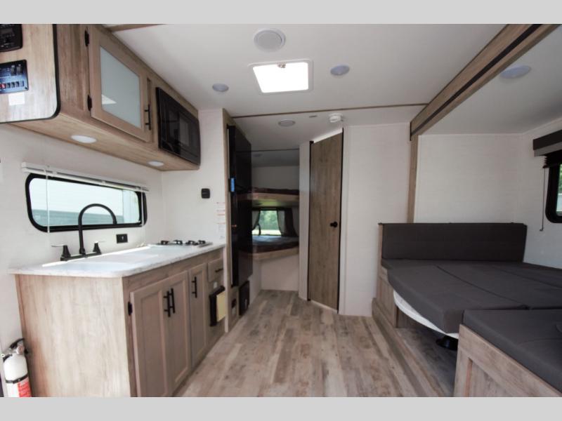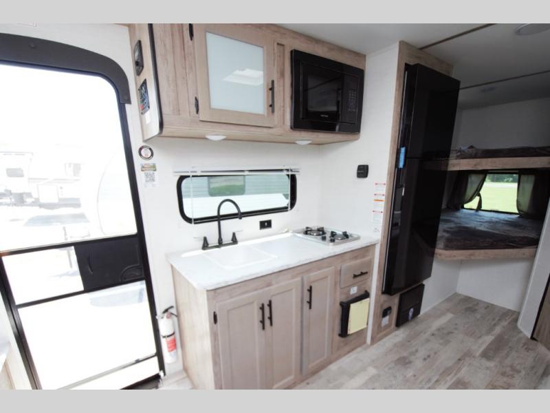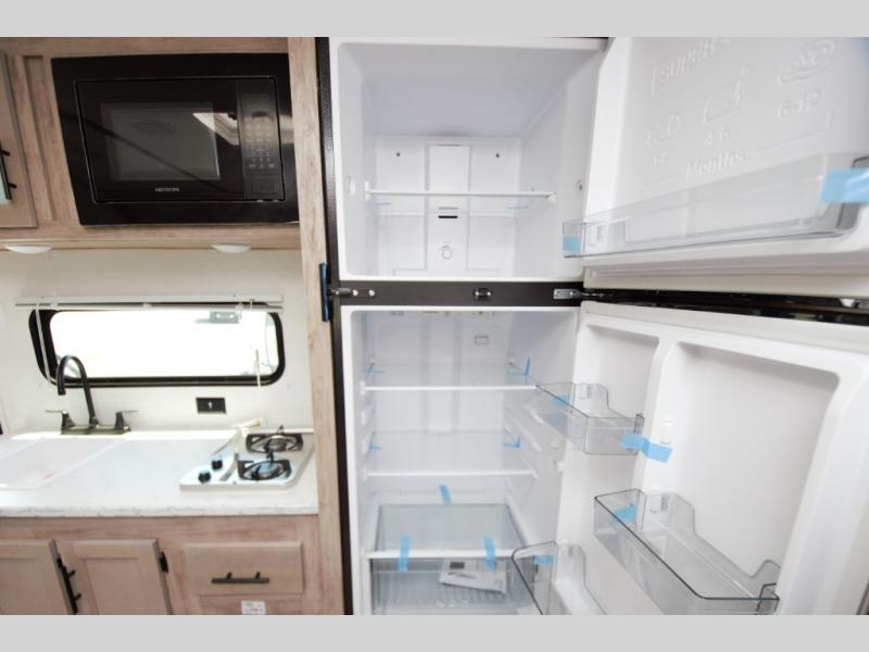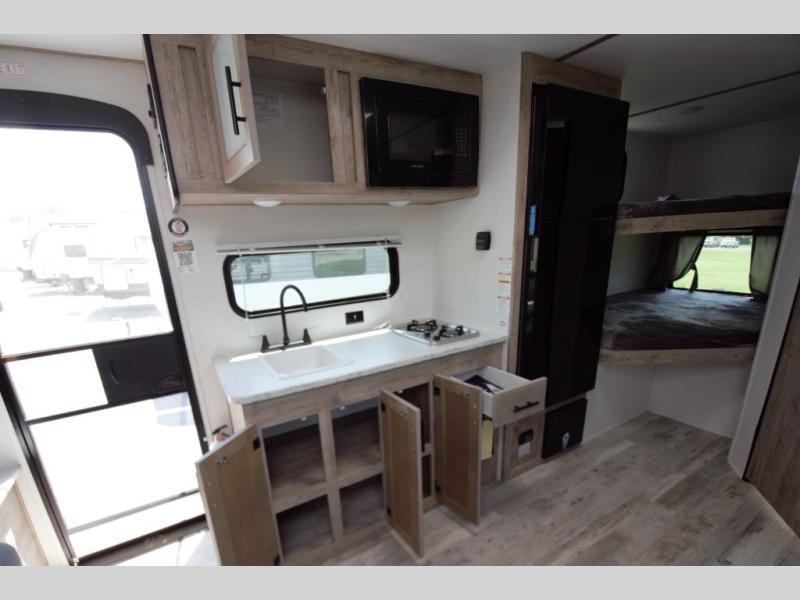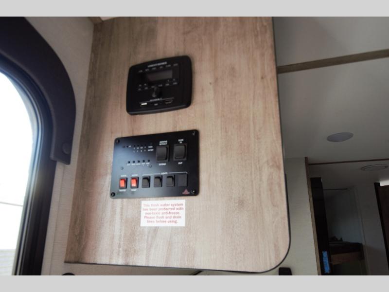 Enjoy craft made cabinetry, fabric wrapped valances, a white kitchen sink, wood ceiling trim, and LED lighting throughout. Smart storage solutions make it easy to bring everything you need.