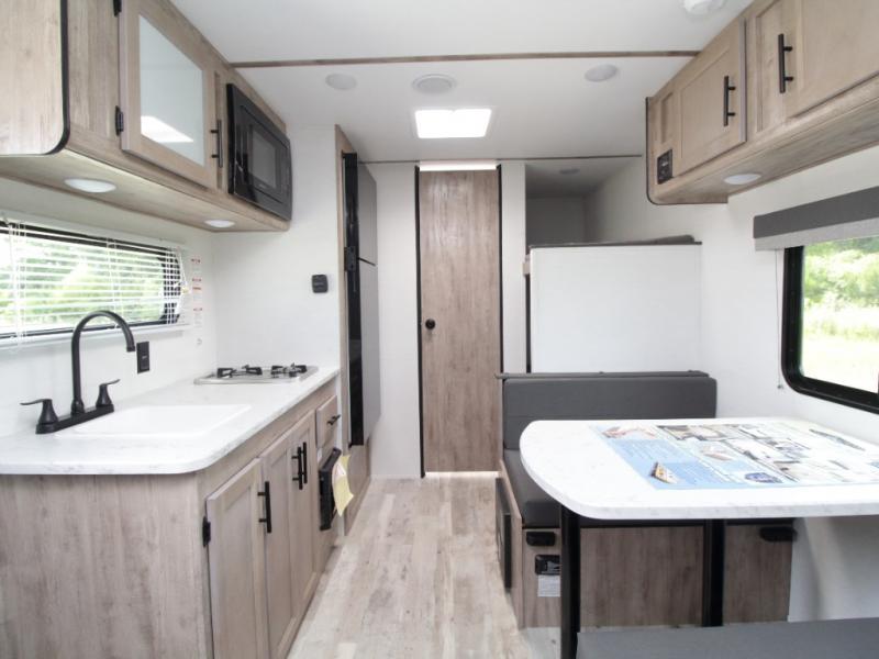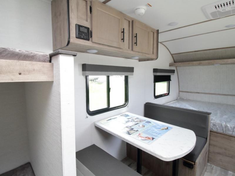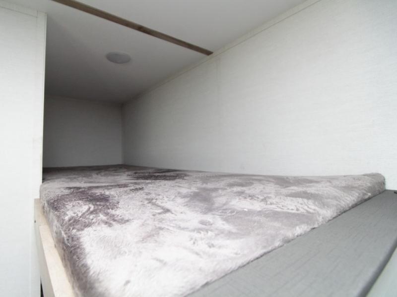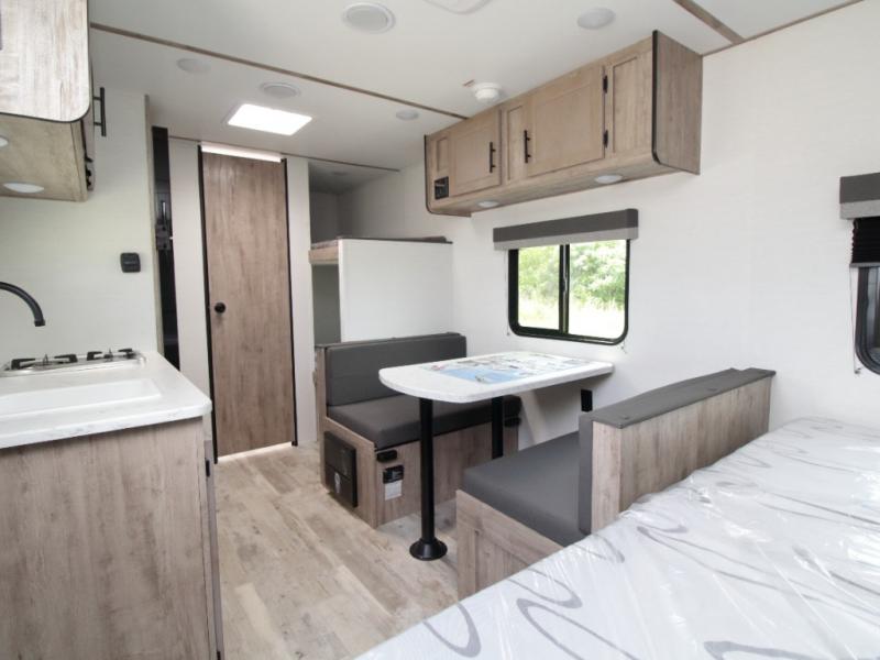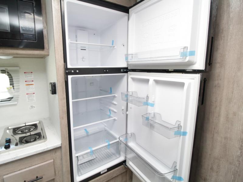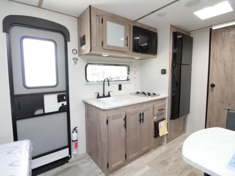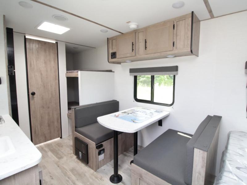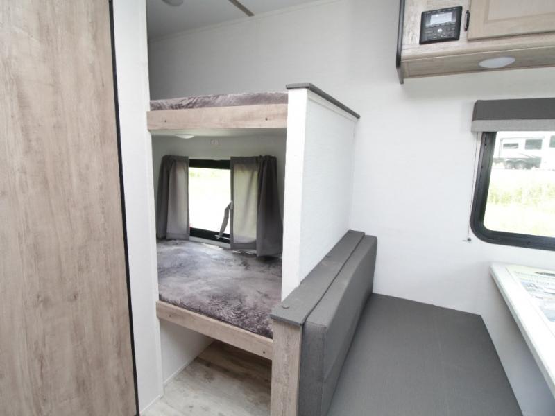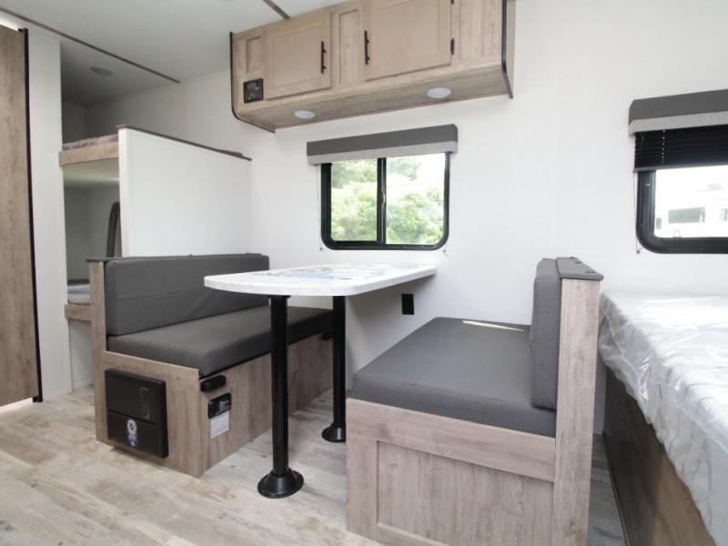 Sleeping up to five people, this model includes bunk beds, a queen-size bed, and a booth dinette that offers additional sleeping space. The fully equipped kitchen features a two-burner cooktop, microwave, and a double-door refrigerator, allowing you to prepare meals with ease. Store your cookware in the convenient pot and pan drawer, and unwind under the power awning for shaded relaxation at your campsite.