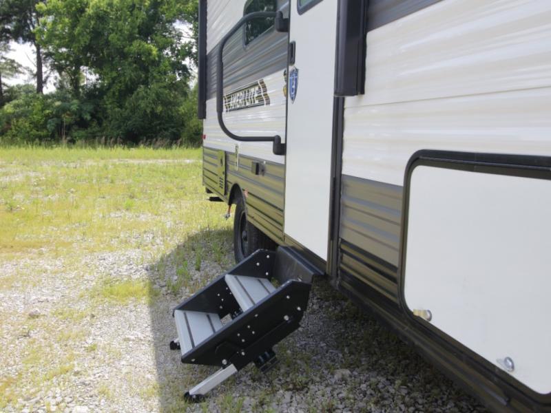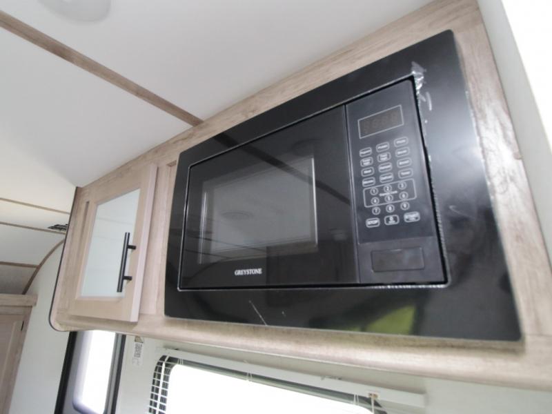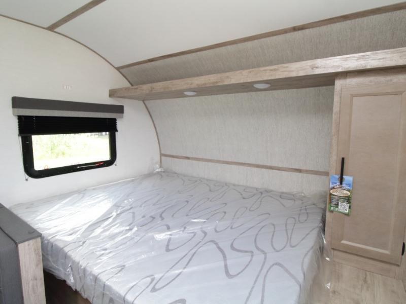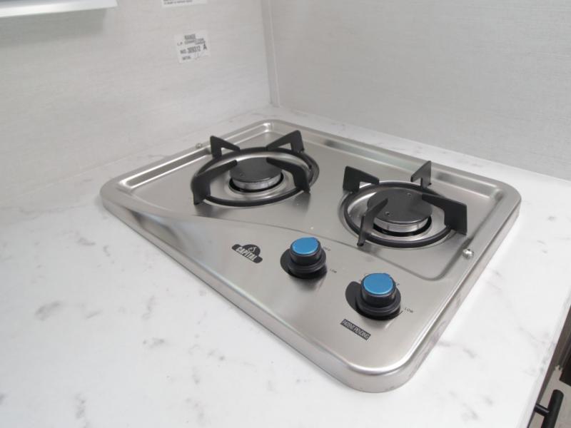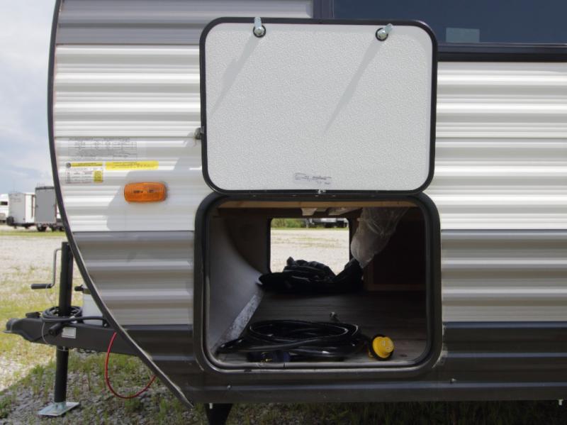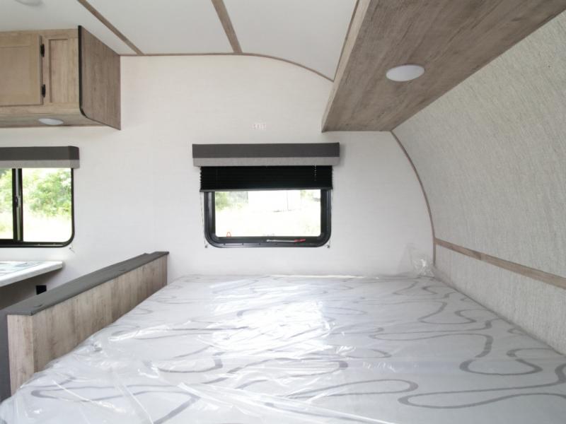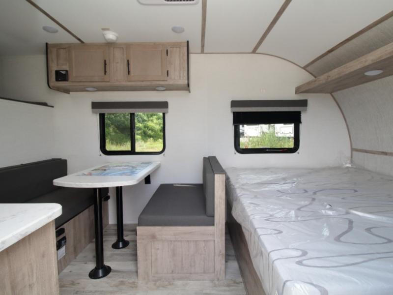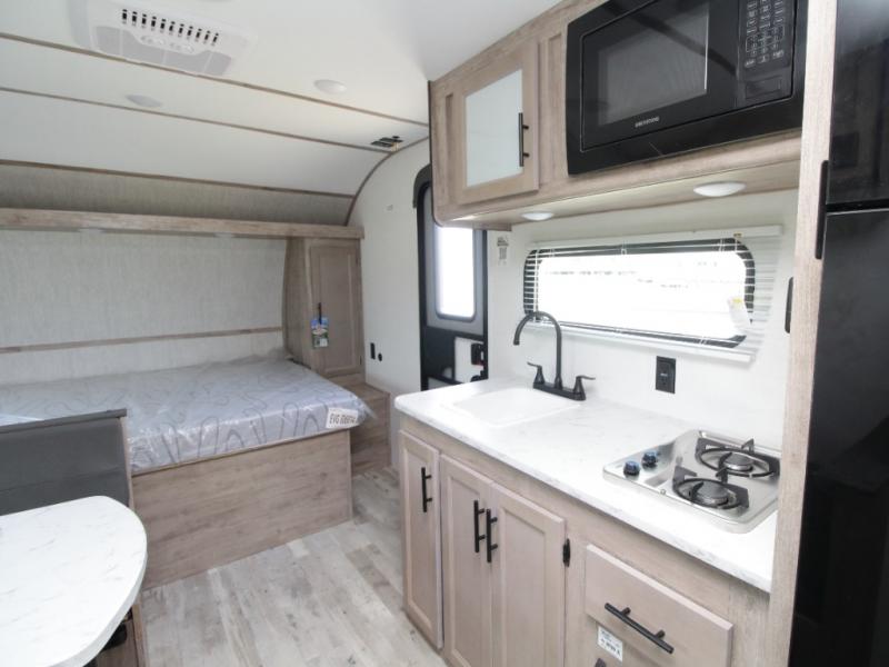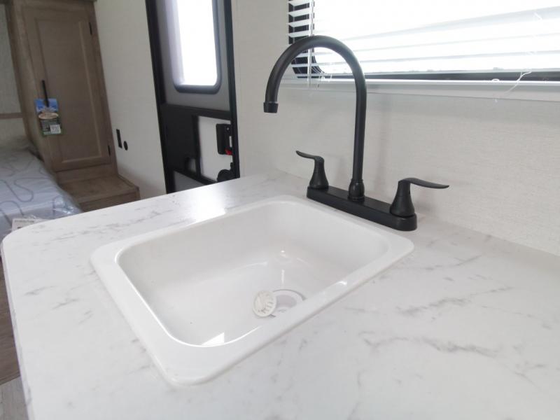 Sleeping up to five people, this model includes bunk beds, a queen-size bed, and a booth dinette that offers additional sleeping space. The fully equipped kitchen features a two-burner cooktop, microwave, and a double-door refrigerator, allowing you to prepare meals with ease. Store your cookware in the convenient pot and pan drawer, and unwind under the power awning for shaded relaxation at your campsite.