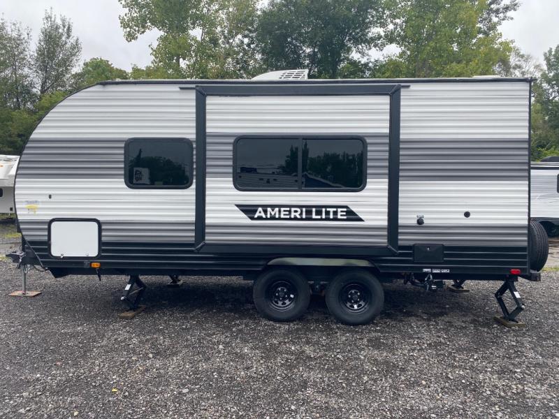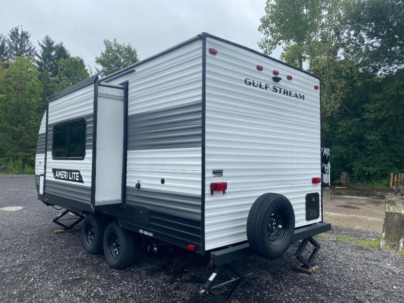 The Ameri-Lite Ultra Lite travel trailers by Gulf Stream are the perfect RV for families wanting to start their camping lifestyle, but not break the bank. These lightweight units are built with a diamond plate lower front, a one-piece synthetic vinyl roof, and a uni-body construction with steel hurricane straps tying the walls to the floor for added durability. The front power hitch jack and four stabilizer jacks will make set-up hassle-free once you arrive at the campground, and you can put out the electric awning to rest in the shade when you're done. Each model includes convenient amenities, like the 13,500 BTU A/C, the tankless water heater, a central control panel, and multiple USB ports for your tablet, phone, and camera! The inside is designed to make you feel at home with radiant LED lighting, designer kitchen backsplash, pleated privacy shades, craft-made cabinetry, plus many more features. Start your RV lifestyle with an affordable, lightweight Ameri-Lite Ultra Lite travel trailer today!