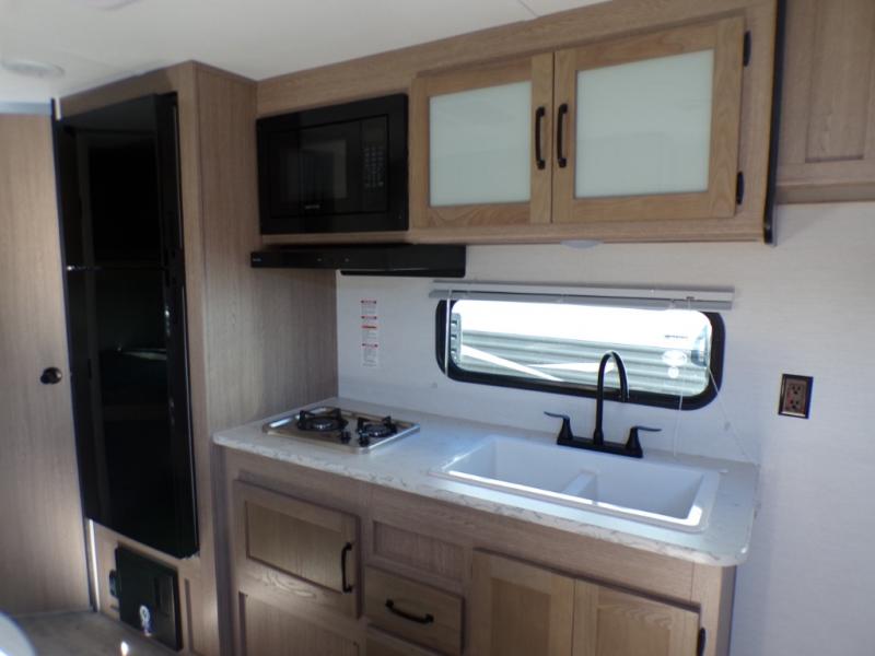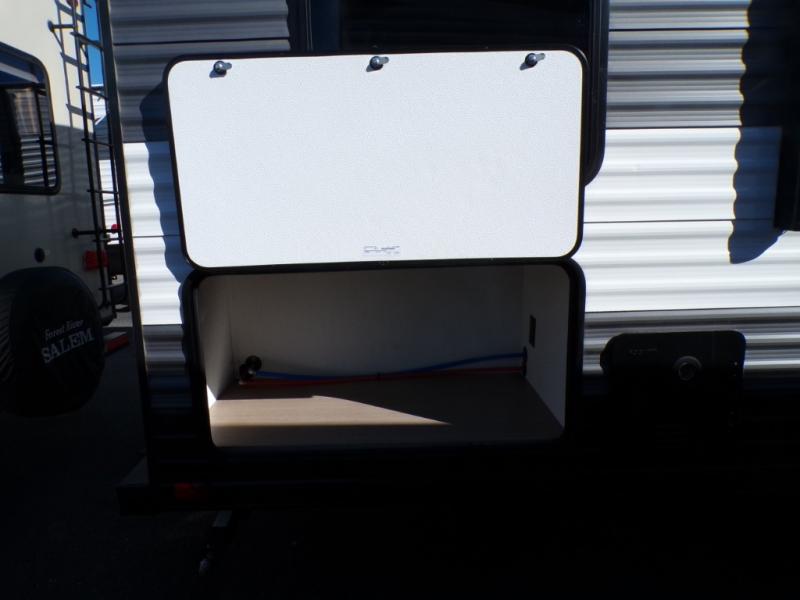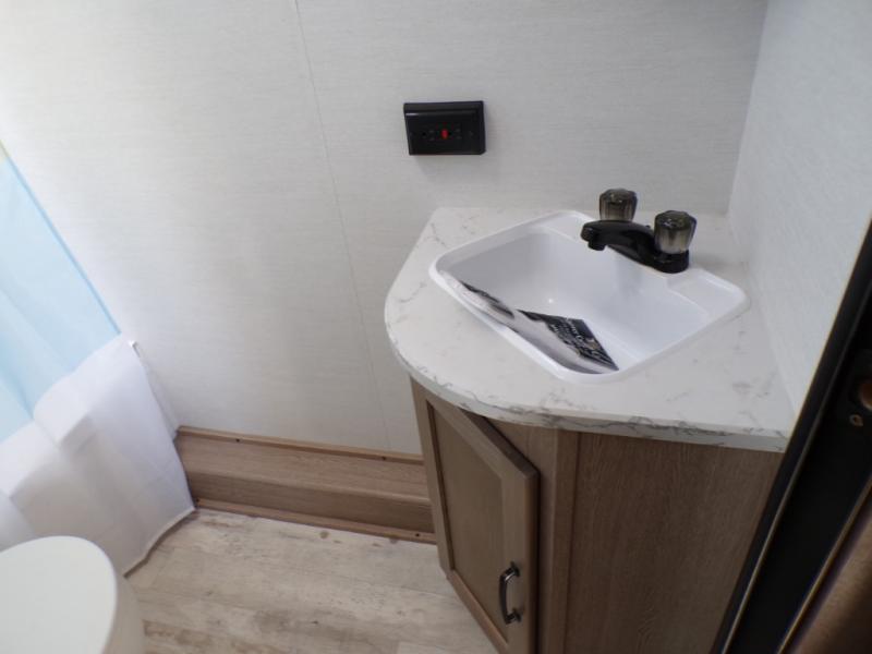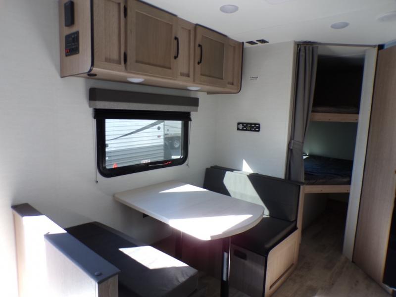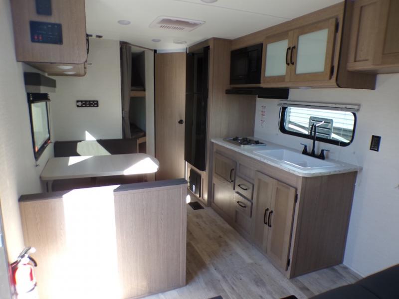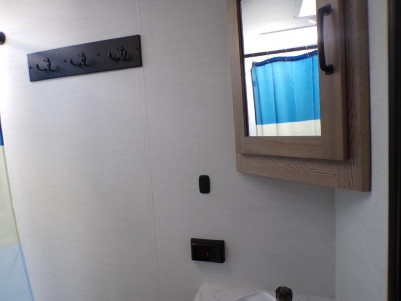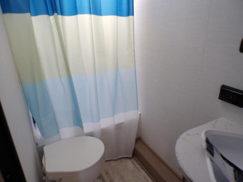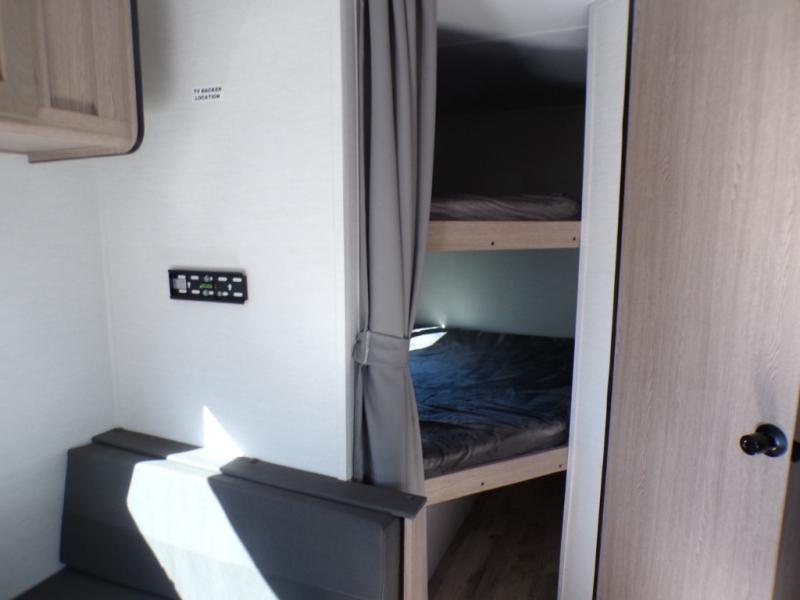 Make your reservations, start planning your menu, and load up your clothes, games, food and more for a fun weekend camping in this 'Show Stopper' trailer! You will have a front private bedroom with a queen-size bed and closets, while your family and friends can choose from the double-size bunks and furniture to sleep on. There is a convertible sofa and a booth dinette, plus a galley kitchen with a microwave oven, sink, plus overhead storage for pots, pans, and dry goods. The rear corner full bathroom offers a tub/shower, toilet, and a sink to be able to get cleaned up in after hiking or relaxing by a fire.