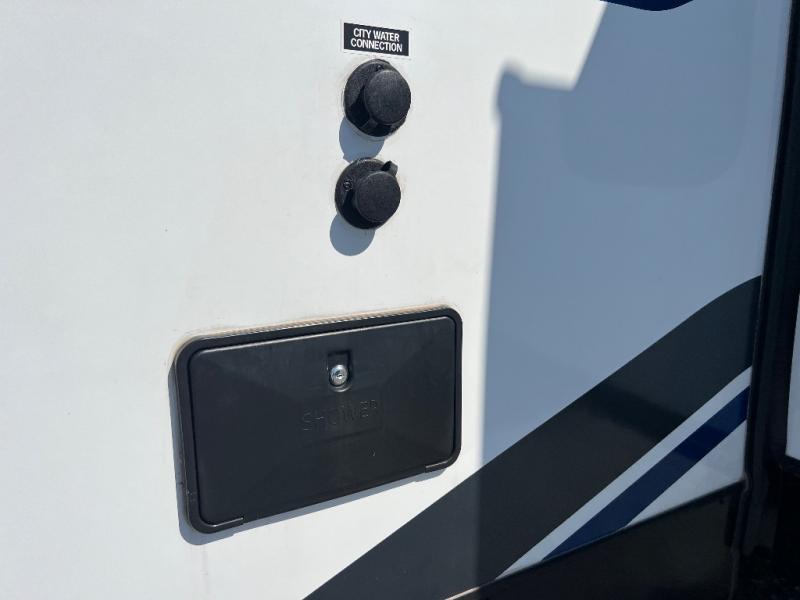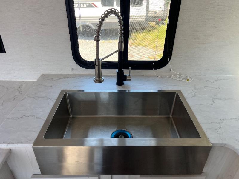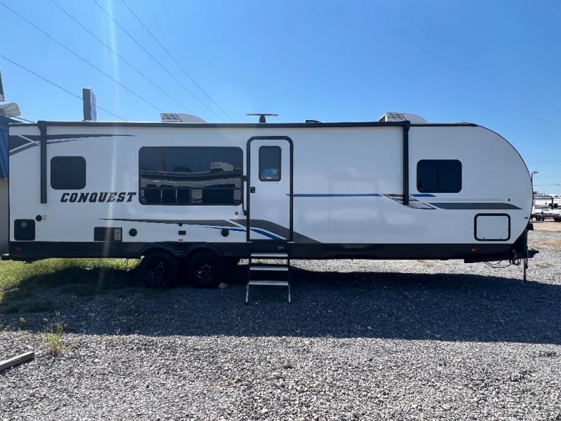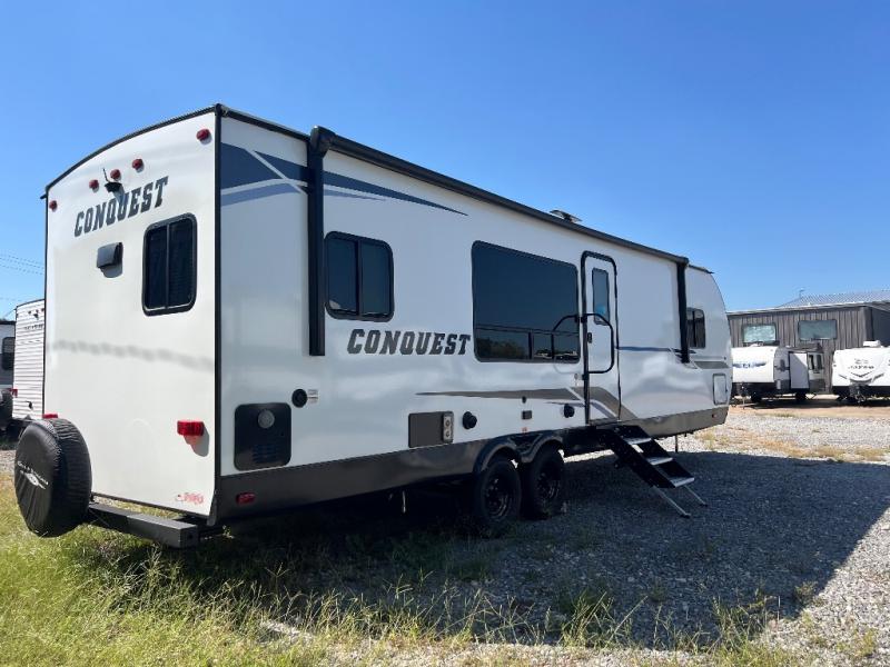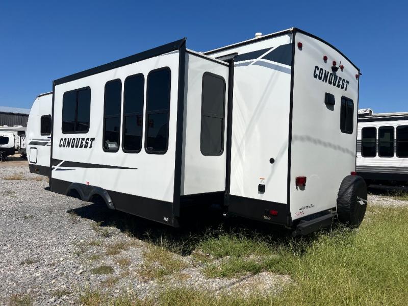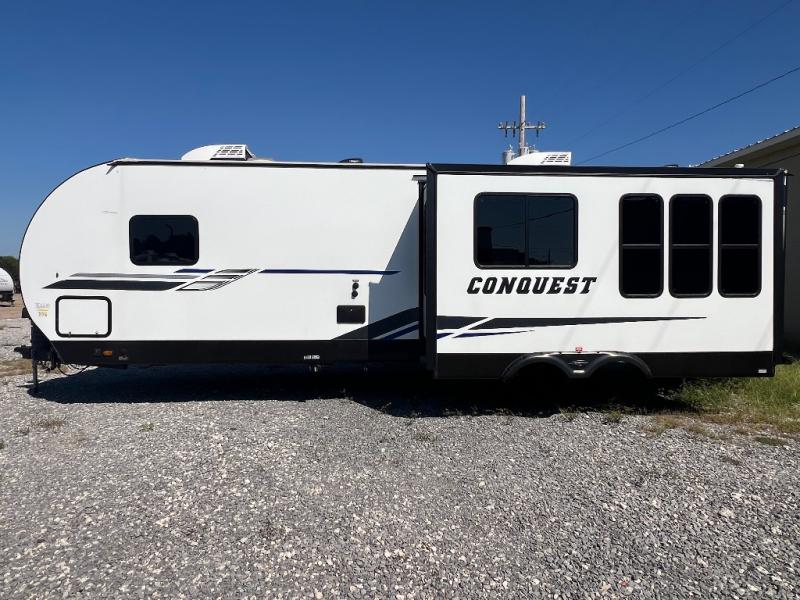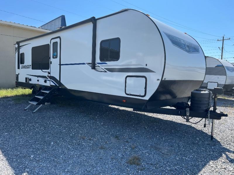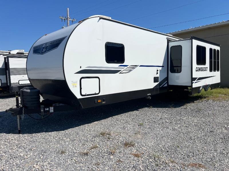 One of these Gulf Stream Conquest Supreme Series travel trailers is ideal for you whether you are looking for a family-friendly unit or a two person getaway! Their uni-body construction is made up of sidewalls, ceiling and floor screwed, glued and tied together with steel straps for unmatched strength and resilience. A powder-coated steel I-beam frame with welded outriggers hold them together and the one-piece seamless roof will last for years to come. Each model includes a 13,500 BTU ducted roof A/C and a gas furnace to keep you comfortable all year long, and the tankless water heater will provide endless hot showers. The included Supreme Package includes upgraded graphics and bigger slide windows, a heated and enclosed underbelly, solar and backup camera prep, and many more hassle-free features. You will appreciate the lighted storage area to easily pack your gear, and the Bluetooth soundbar with outside speakers will make unloading fun!