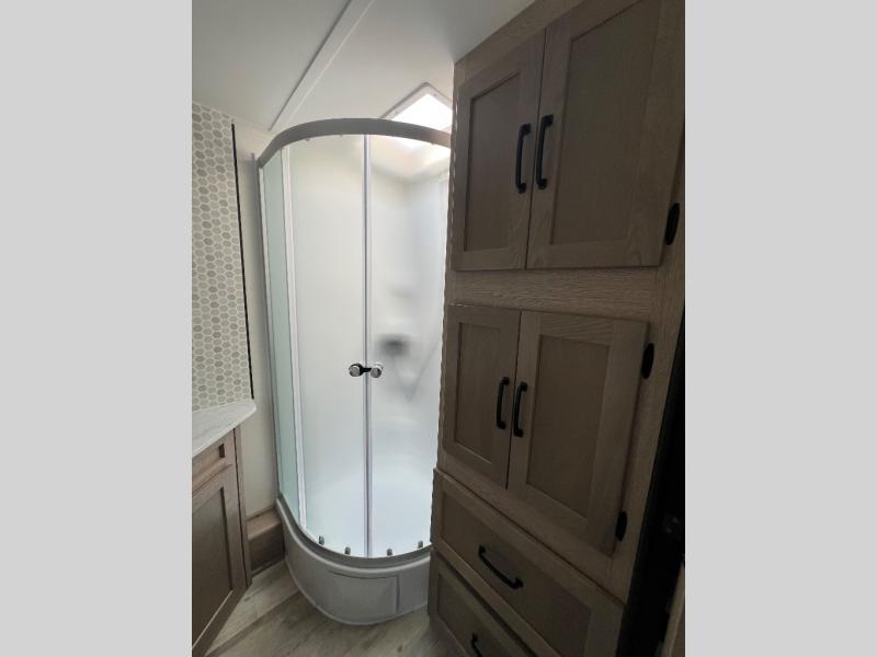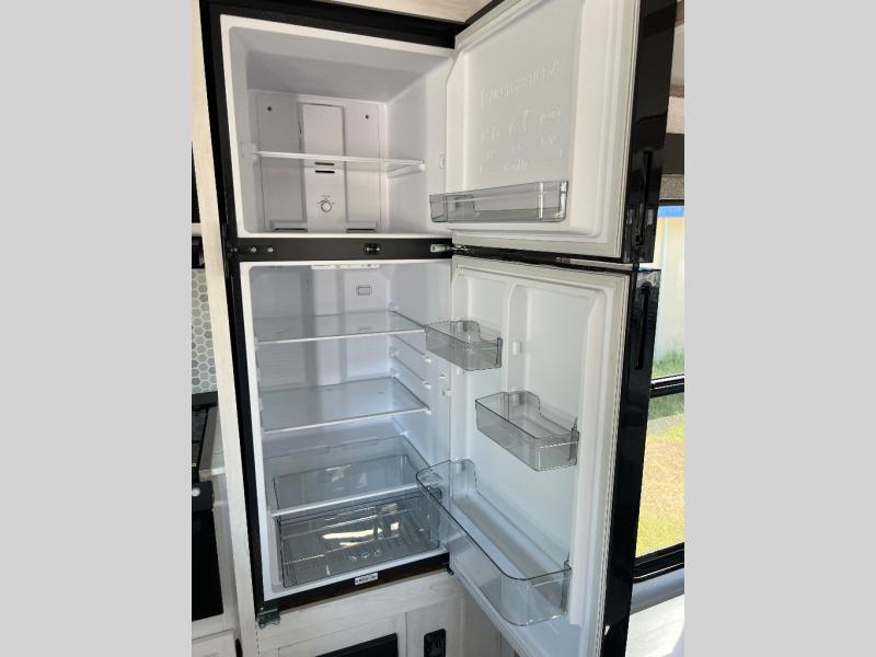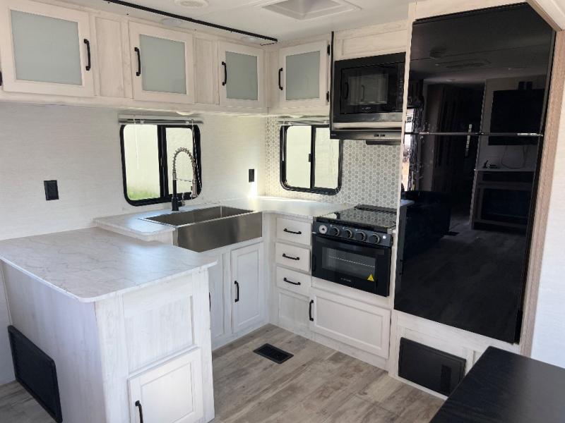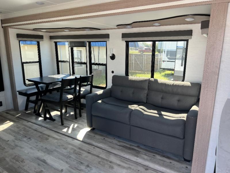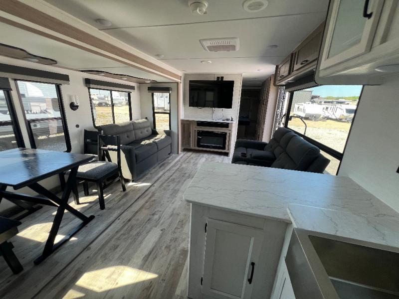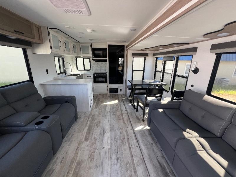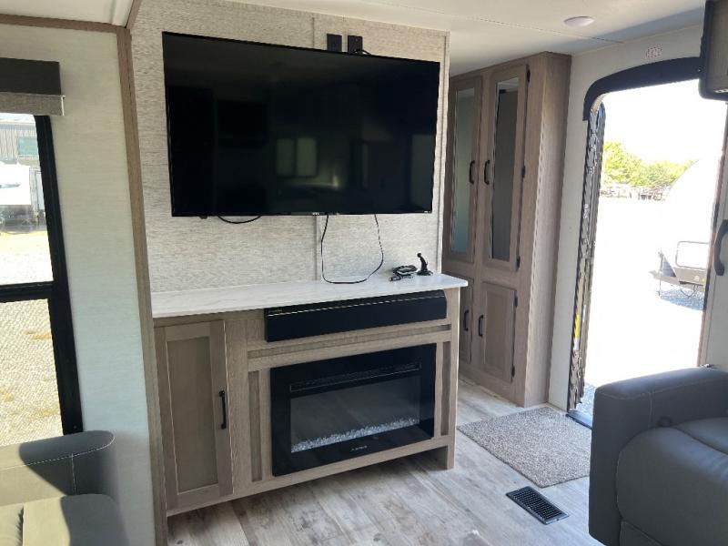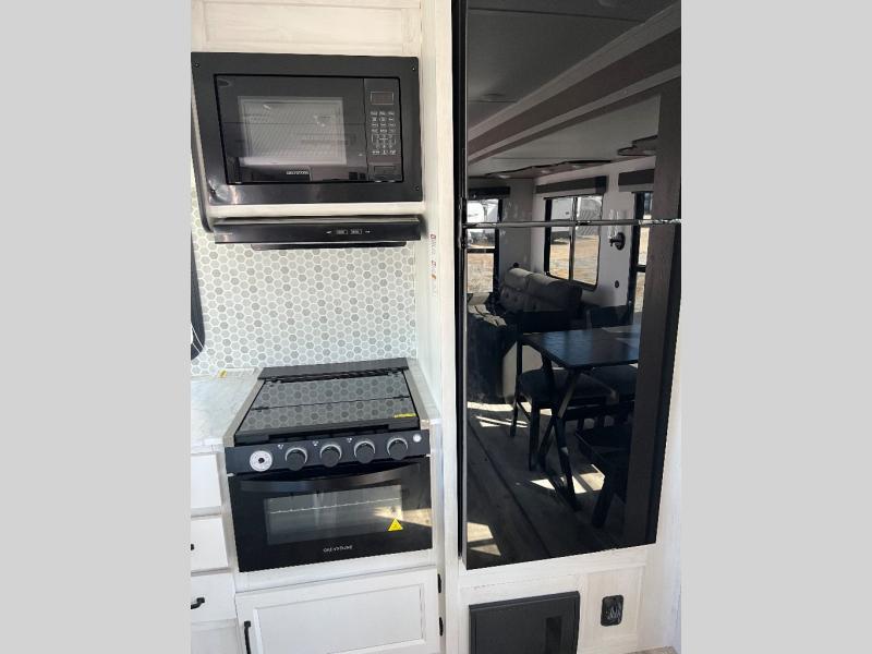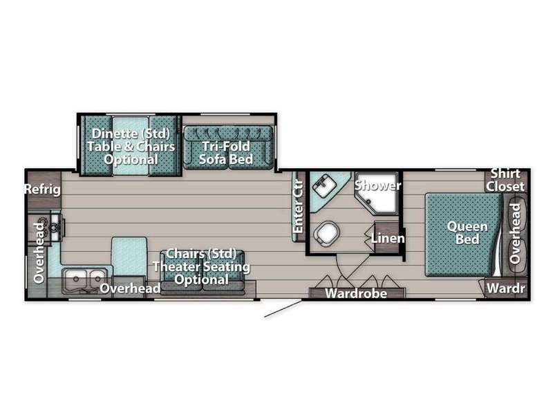 The chef will love cooking in the rear kitchen of this travel trailer! It not only has a 10.7 cu. ft. Everchill refrigerator to keep your perishables fresh, but also a three burner gas range with a super burner and oven. You can enjoy your meals at the booth dinette or switch it out for the optional table and chairs. The tri-fold sofa offers a comfortable place to take an afternoon nap and the chairs are the perfect place to watch your favorite movies with the entertainment center or you can switch the chairs out for the optional theater seating instead. Across from the full bathroom with a neo-angled shower is a wardrobe to use as needed. Rest easy each night in the front private bedroom on the queen bed with a shirt closet on one side and a wardrobe on the other side to keep your clothes looking their best!
