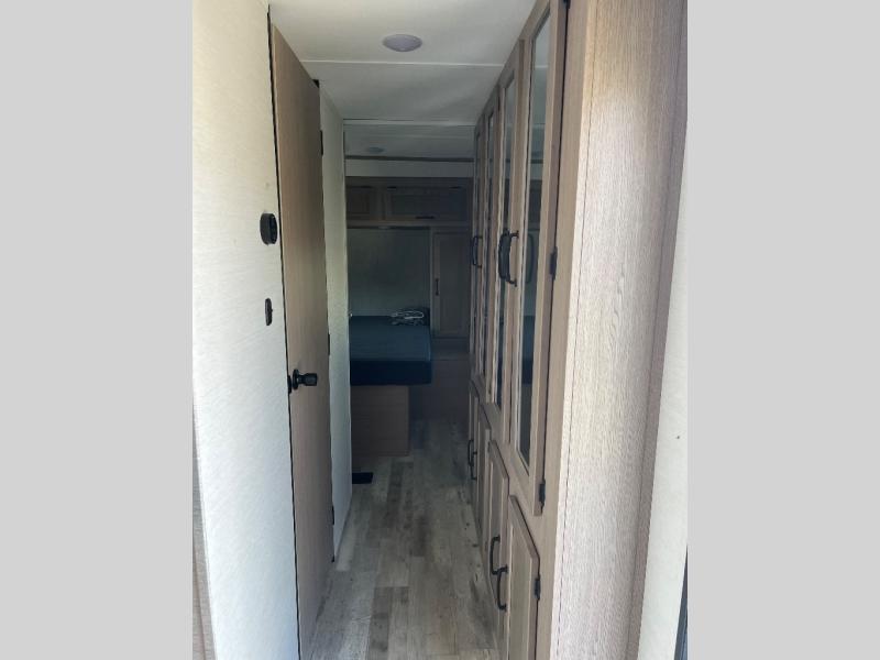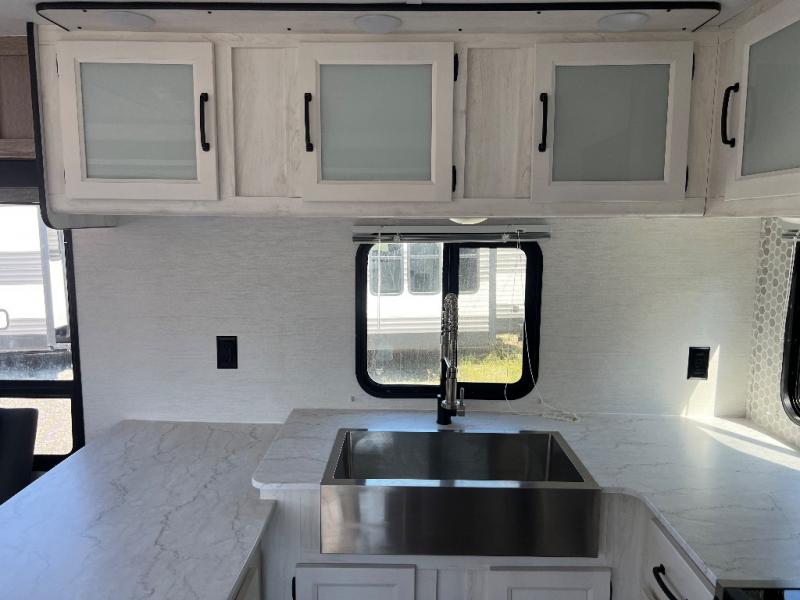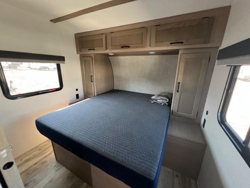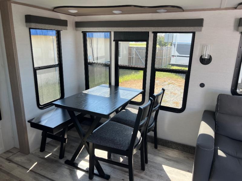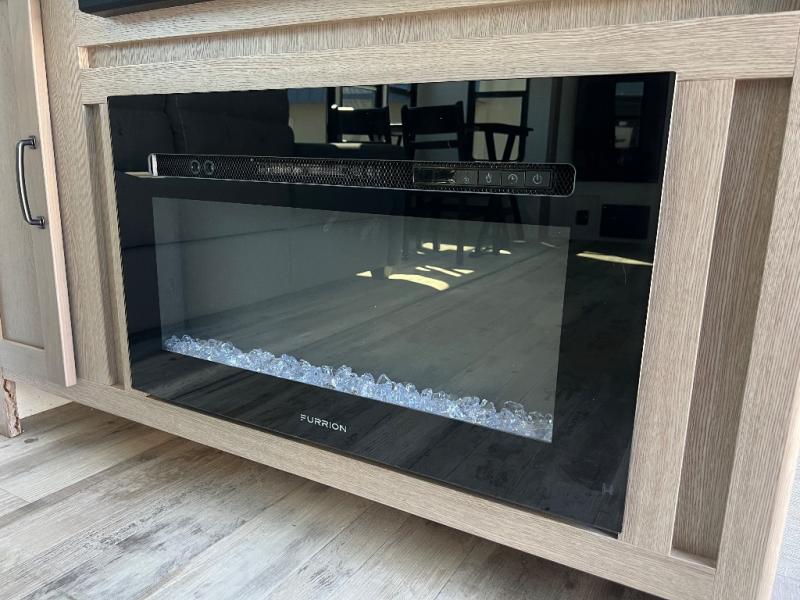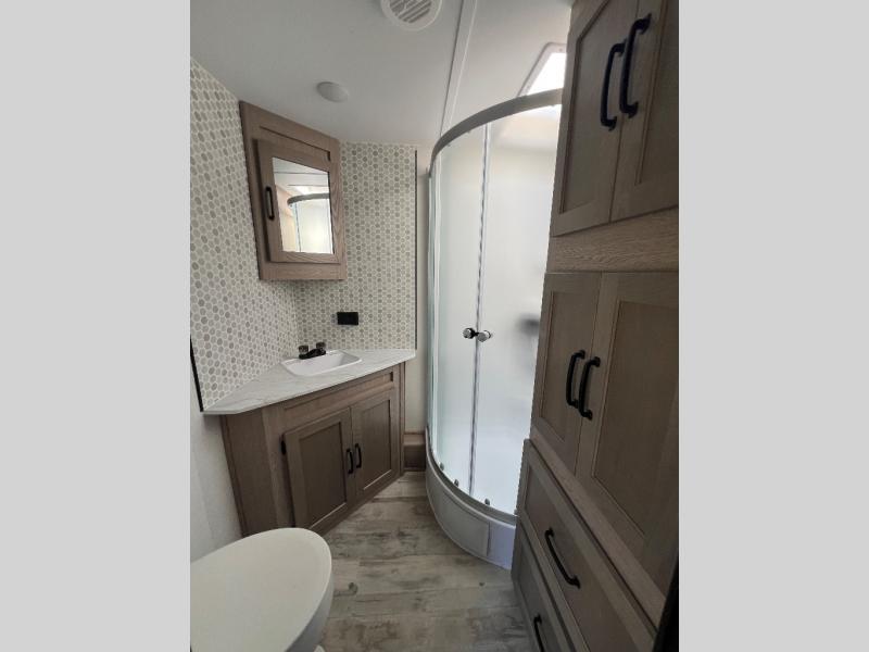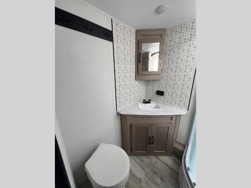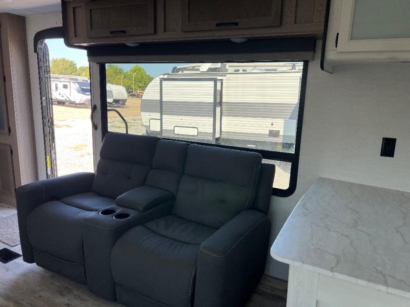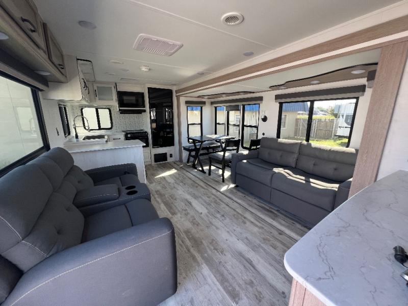 The chef will love cooking in the rear kitchen of this travel trailer! It not only has a 10.7 cu. ft. Everchill refrigerator to keep your perishables fresh, but also a three burner gas range with a super burner and oven. You can enjoy your meals at the booth dinette or switch it out for the optional table and chairs. The tri-fold sofa offers a comfortable place to take an afternoon nap and the chairs are the perfect place to watch your favorite movies with the entertainment center or you can switch the chairs out for the optional theater seating instead. Across from the full bathroom with a neo-angled shower is a wardrobe to use as needed. Rest easy each night in the front private bedroom on the queen bed with a shirt closet on one side and a wardrobe on the other side to keep your clothes looking their best!