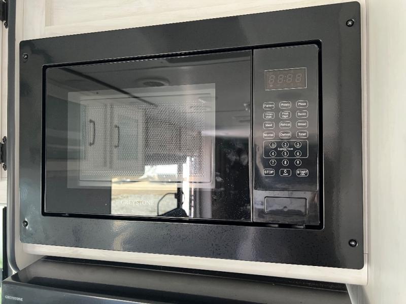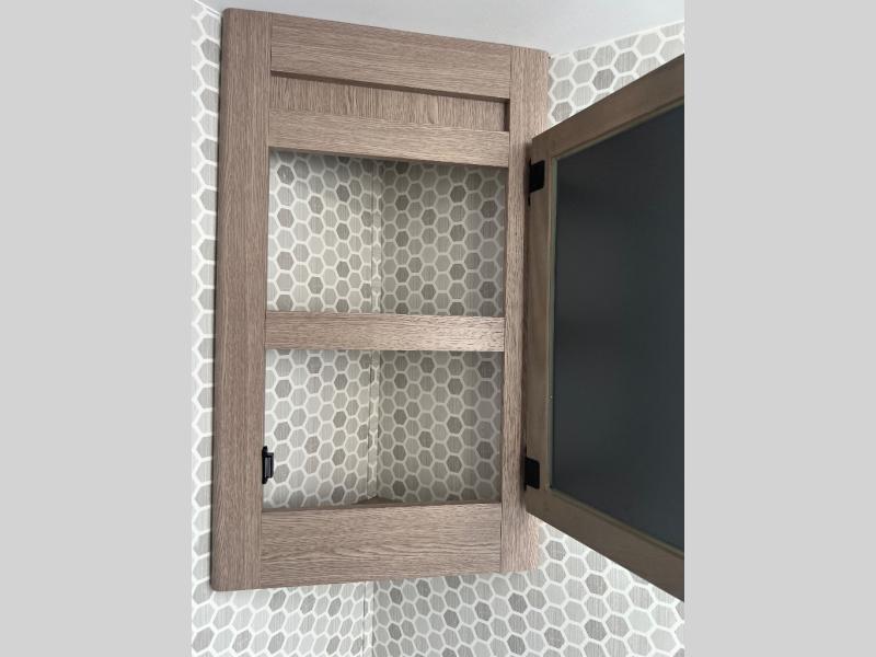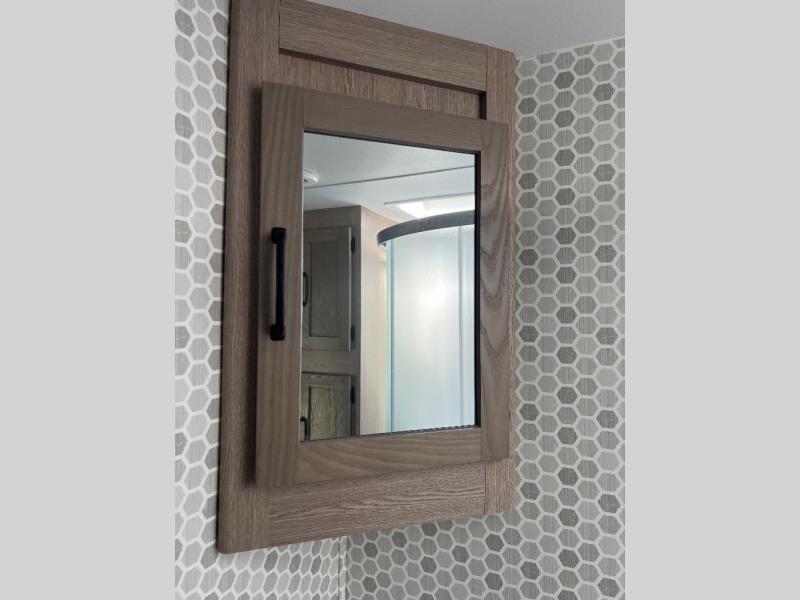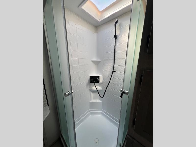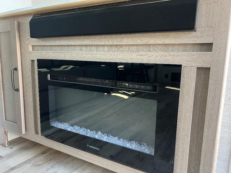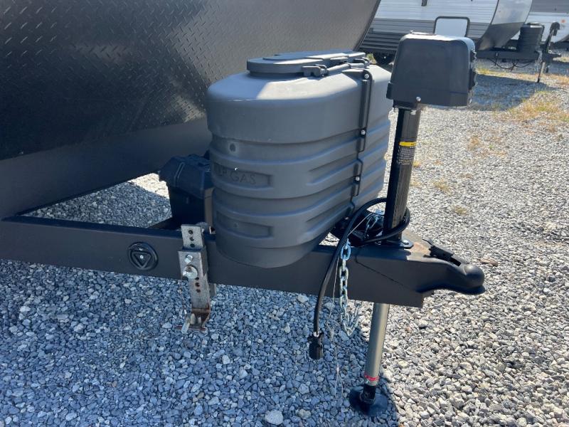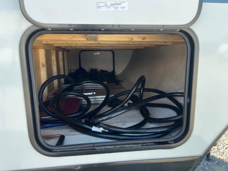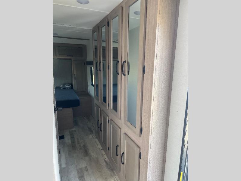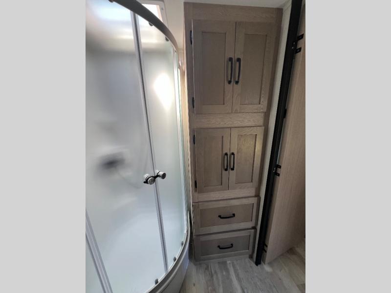 The chef will love cooking in the rear kitchen of this travel trailer! It not only has a 10.7 cu. ft. Everchill refrigerator to keep your perishables fresh, but also a three burner gas range with a super burner and oven. You can enjoy your meals at the booth dinette or switch it out for the optional table and chairs. The tri-fold sofa offers a comfortable place to take an afternoon nap and the chairs are the perfect place to watch your favorite movies with the entertainment center or you can switch the chairs out for the optional theater seating instead. Across from the full bathroom with a neo-angled shower is a wardrobe to use as needed. Rest easy each night in the front private bedroom on the queen bed with a shirt closet on one side and a wardrobe on the other side to keep your clothes looking their best!