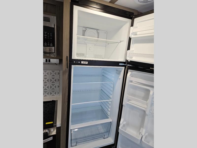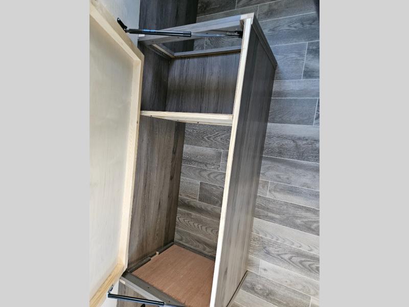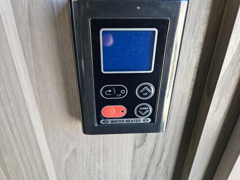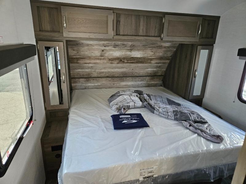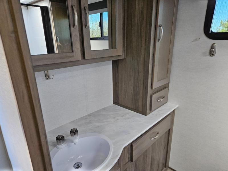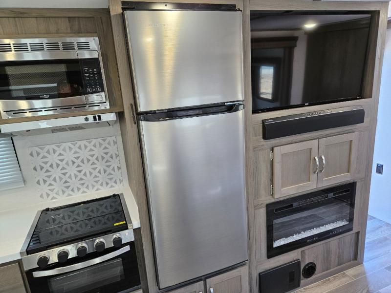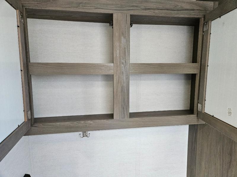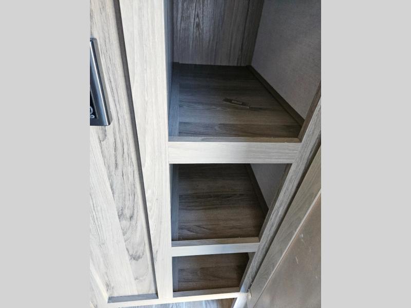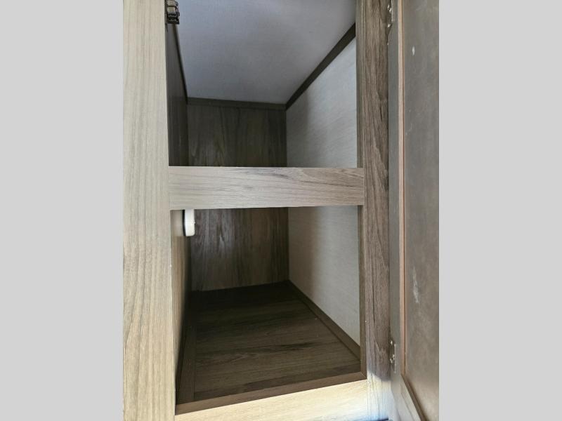 Trips to the lake are made complete with this travel trailer in tow! You will love the amount of interior space provided by the large slide out, and here you can dine at the booth dinette and relax on the tri-fold sofa. Choose the optional theatre seats if you're not needing the additional sleeping space. An optional fireplace can be added under the standard entertainment center with a 40" HDTV, and there is a closet here for storage space. You will feel right at home in the front private bedroom that includes a queen bed, dual wardrobes, plus an under-bed shoe box. In the morning you can make breakfast on the stainless steel three burner cooktop, and there is a convenient dog dish drawer for your furry friends!