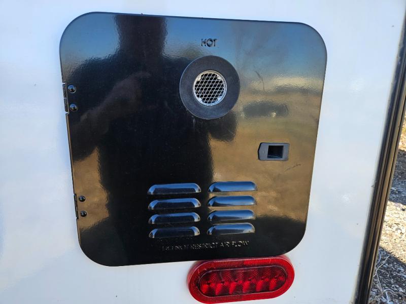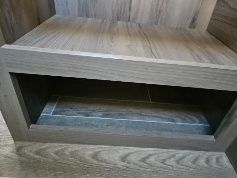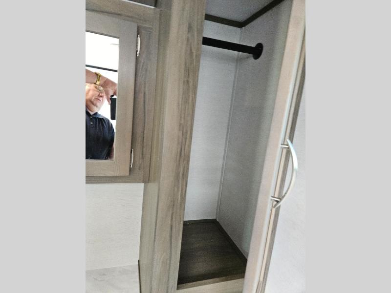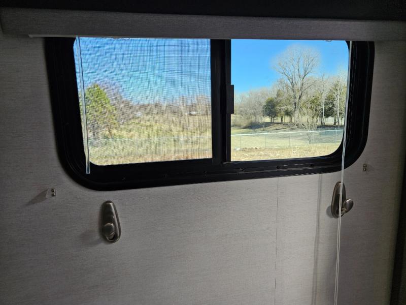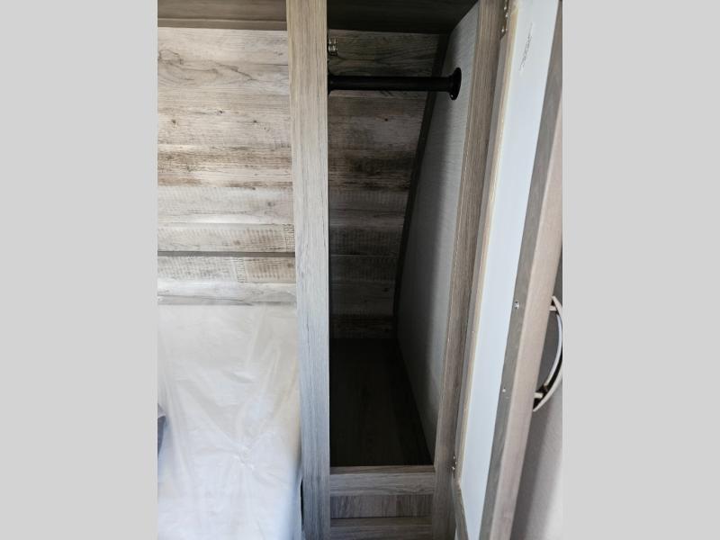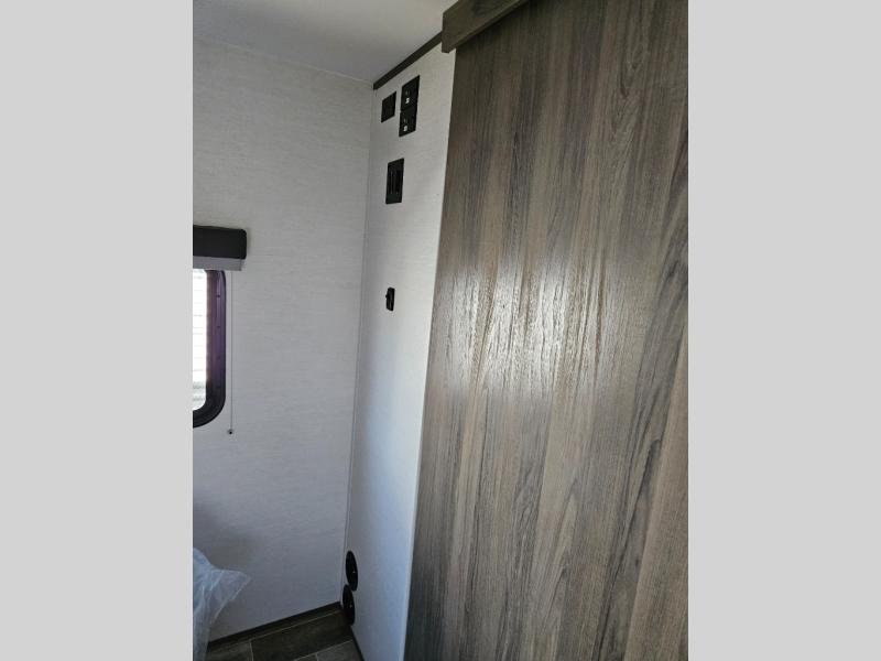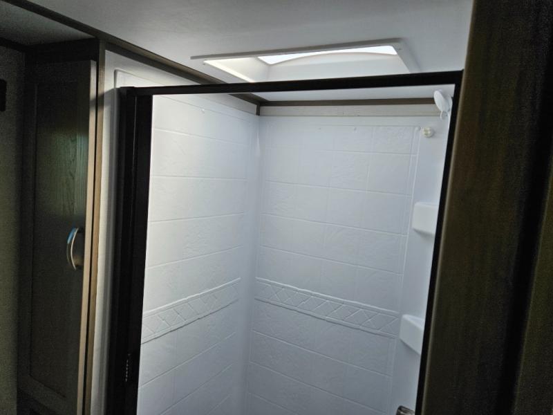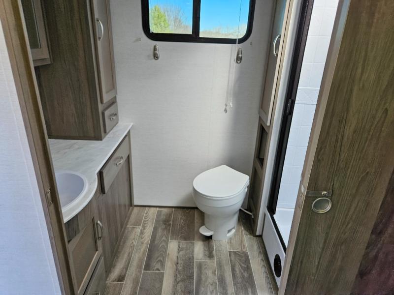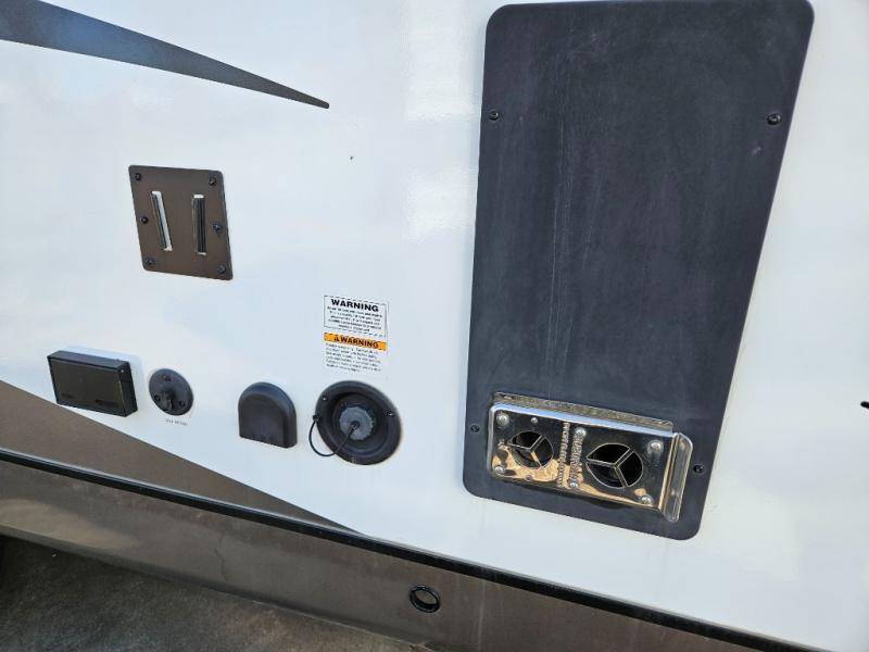 Trips to the lake are made complete with this travel trailer in tow! You will love the amount of interior space provided by the large slide out, and here you can dine at the booth dinette and relax on the tri-fold sofa. Choose the optional theatre seats if you're not needing the additional sleeping space. An optional fireplace can be added under the standard entertainment center with a 40" HDTV, and there is a closet here for storage space. You will feel right at home in the front private bedroom that includes a queen bed, dual wardrobes, plus an under-bed shoe box. In the morning you can make breakfast on the stainless steel three burner cooktop, and there is a convenient dog dish drawer for your furry friends!
