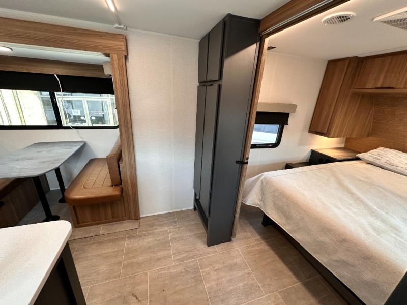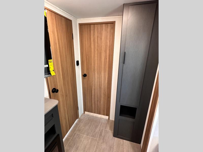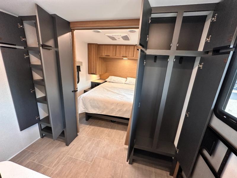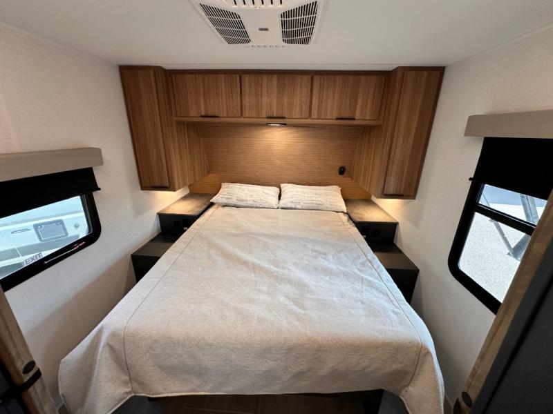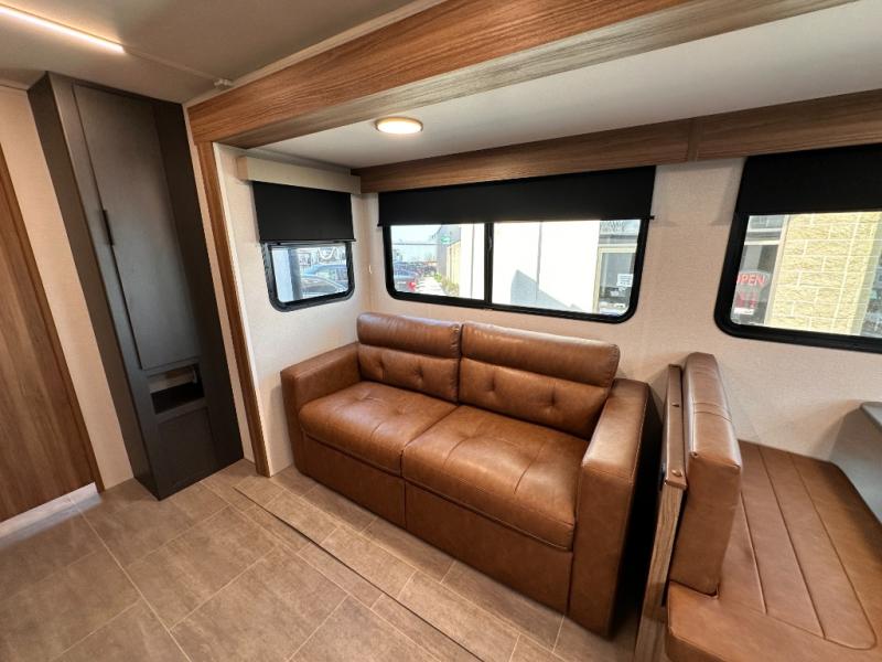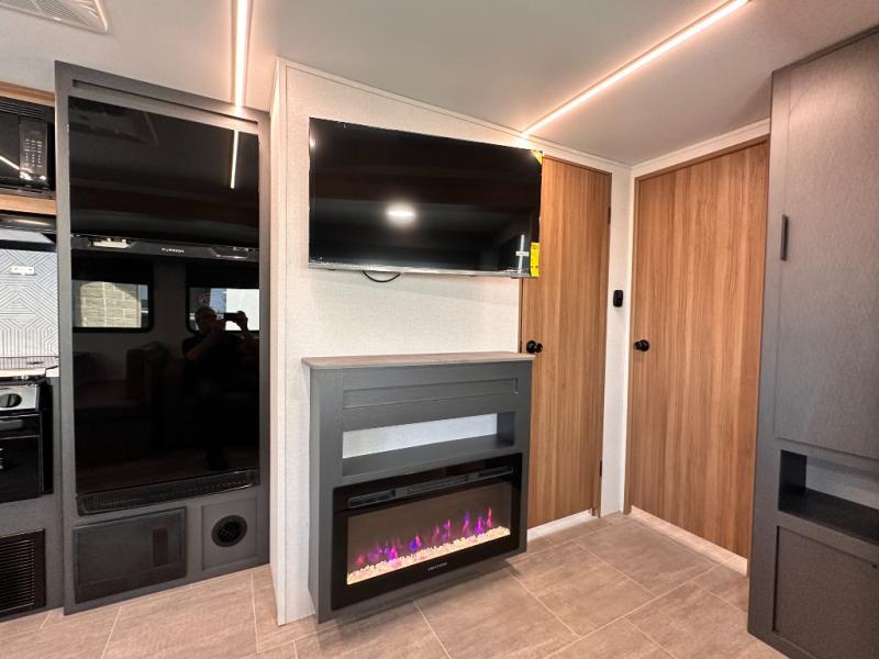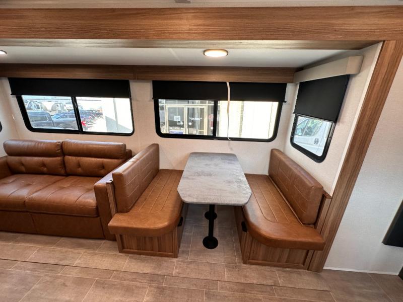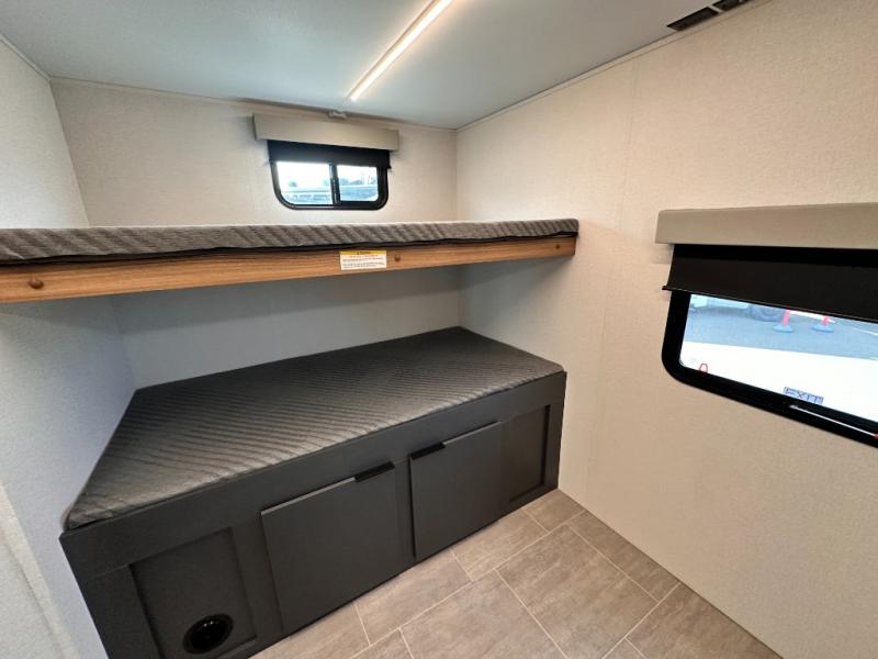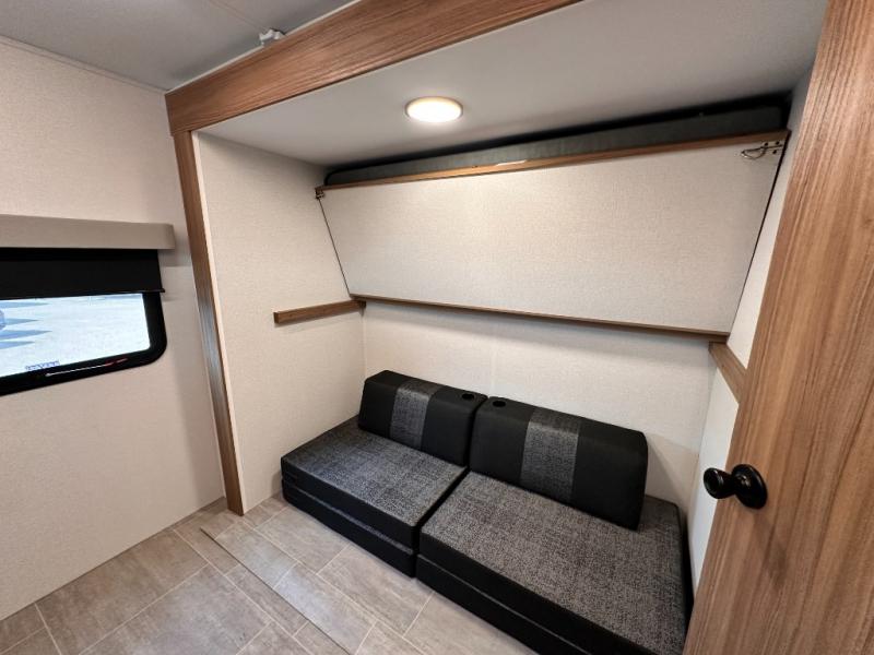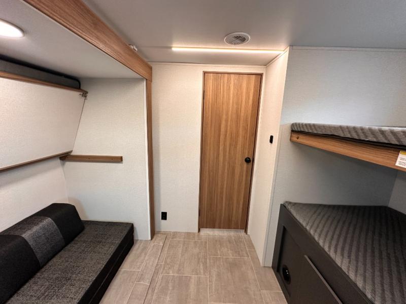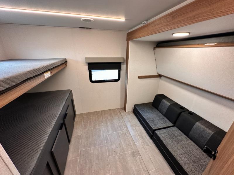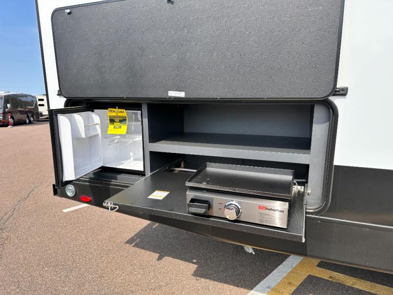 You won't believe all that this travel trailer has inside! Enter the unit through one of the dual entry doors and see all that it has to offer. Starting with the front private bedroom that has a queen size bed to lay your head on at night and wardrobes on either side to hang up your clothes. The fully equipped kitchen has stainless steel appliances to prepare your best home cooked meals, as well as an outside kitchen to breathe in some fresh air while you cook. Enjoy your delicious meals at the booth dinette then play a card game or relax on the sofa while watching a movie on the 40" LED TV. The rear private bunkhouse has a flip-up bunk bed above a sofa and another bunk bed above a bottom bed with storage space below it. Everyone can freshen up in the full bathroom which also has one of the dual entry doors!