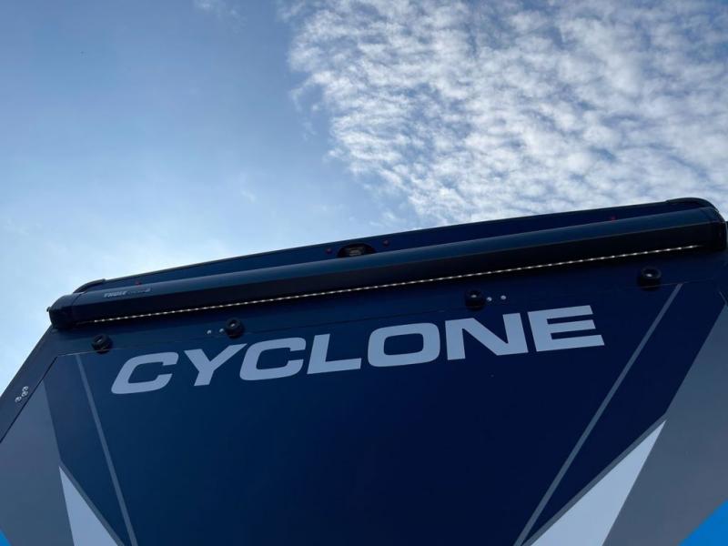Satisfy your wanderlust with a Heartland Cyclone fifth wheel toy hauler! You won't have to sacrifice any luxury either with indulgent features like the king bedroom suite with an exclusive East to West bed tilt system with 30% more floor space, Stor-Mor three-sided access to the basement with 30% more storage capacity, and Step Caddy folding patio step for better stability as you enter or exit the patio. The industry first Grill and Go 25" residential pull out three burner griddle combo comes on models with an exterior kitchen for an easier cooking experience. The residential furniture gives you a high-quality experience on the road. If you like to dry camp longer then you will appreciate the industry's largest 150 gallons fresh water tanks. Come find the perfect model for you today!