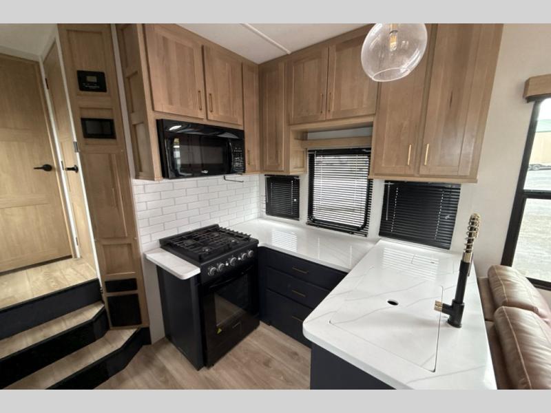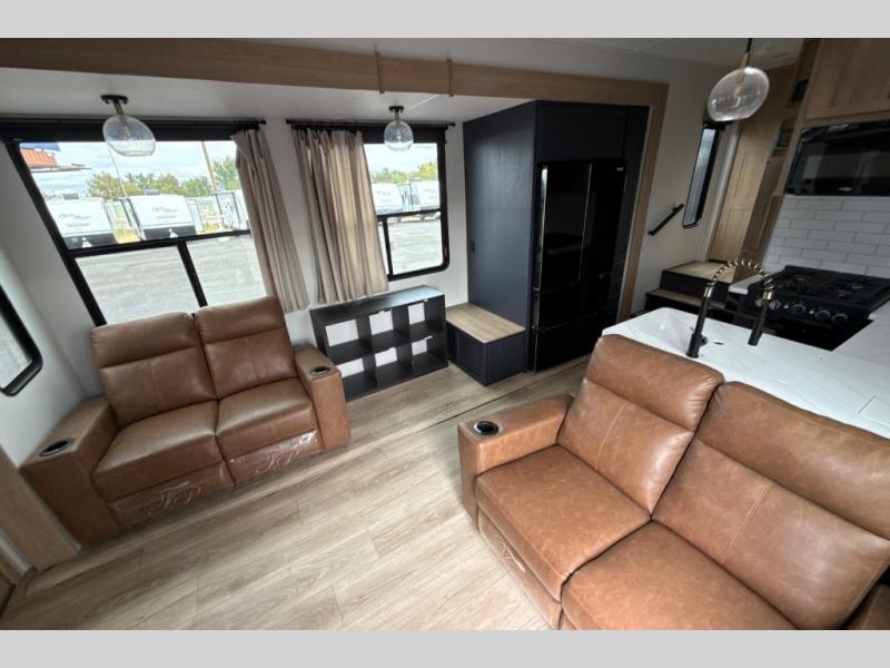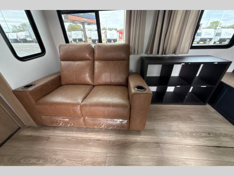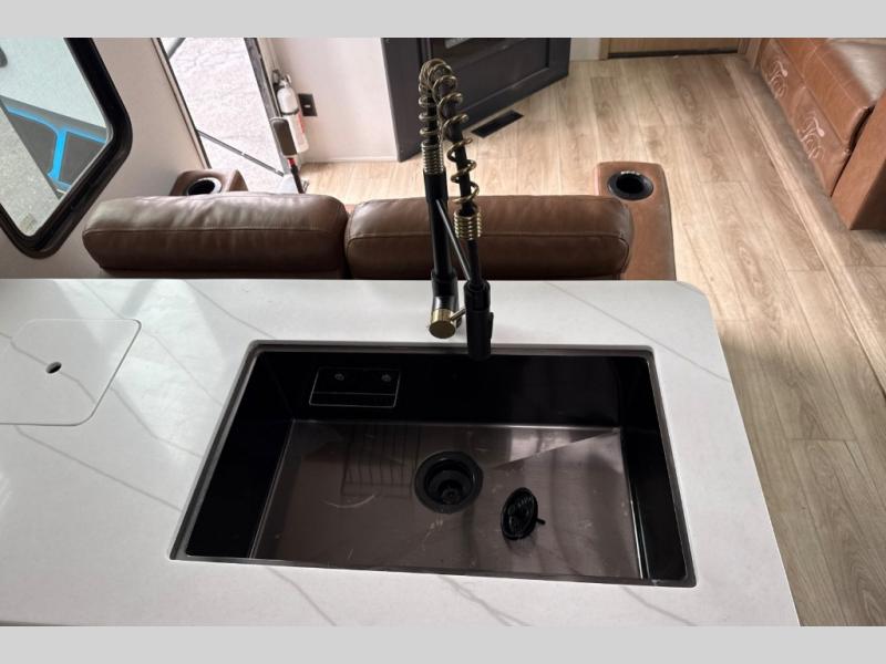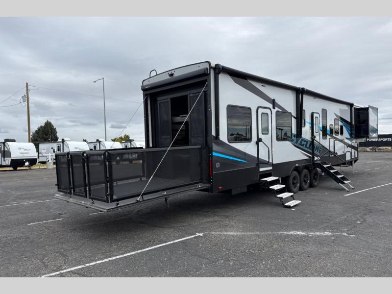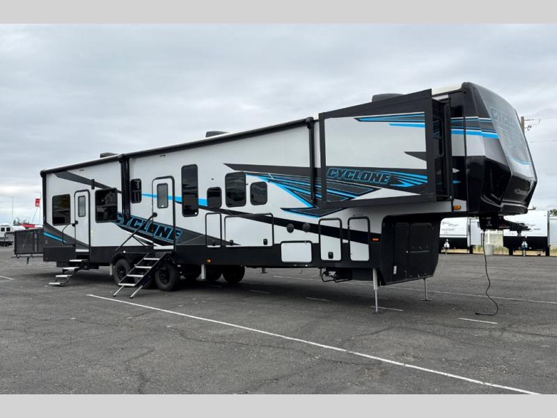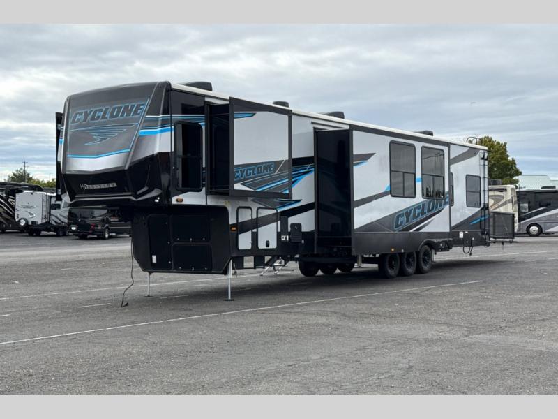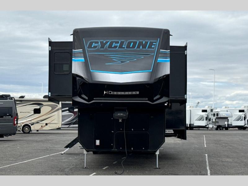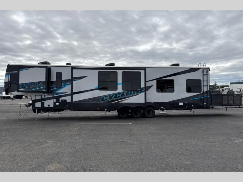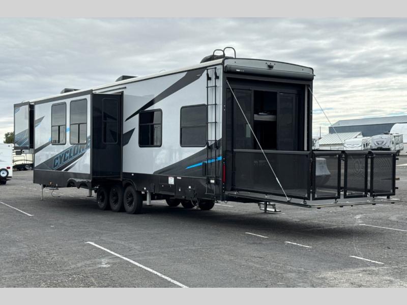 Satisfy your wanderlust with a Heartland Cyclone fifth wheel toy hauler! You won't have to sacrifice any luxury either with indulgent features like the king bedroom suite with an exclusive East to West bed tilt system with 30% more floor space, Stor-Mor three-sided access to the basement with 30% more storage capacity, and Step Caddy folding patio step for better stability as you enter or exit the patio. The industry first Grill and Go 25" residential pull out three burner griddle combo comes on models with an exterior kitchen for an easier cooking experience. The residential furniture gives you a high-quality experience on the road. If you like to dry camp longer then you will appreciate the industry's largest 150 gallons fresh water tanks. Come find the perfect model for you today!