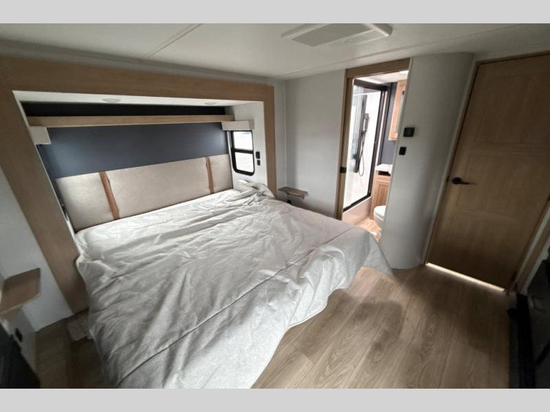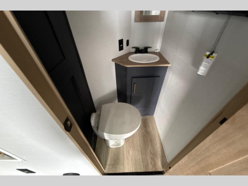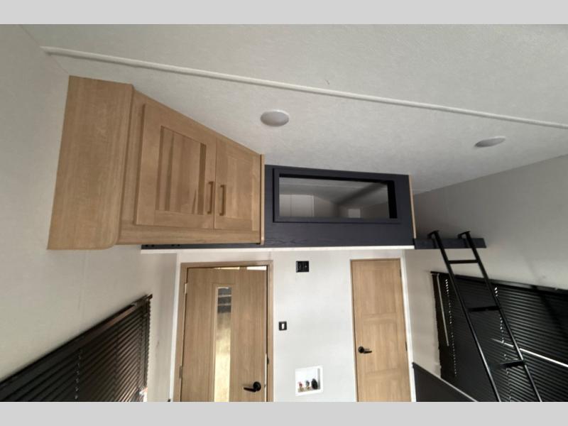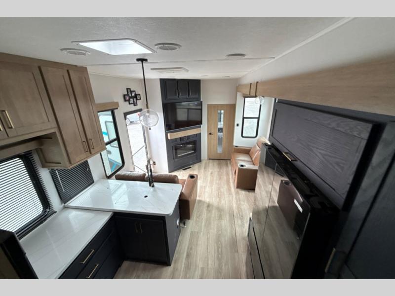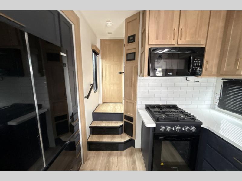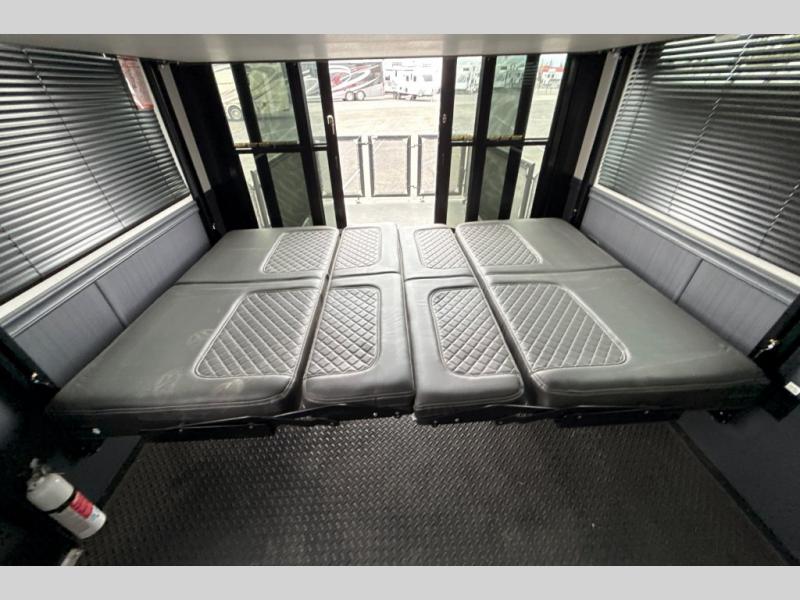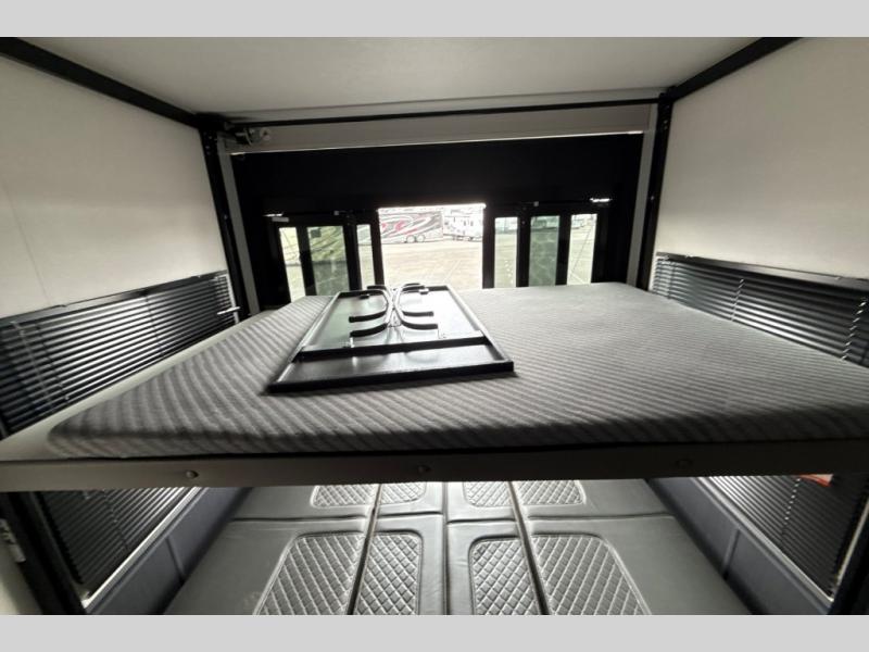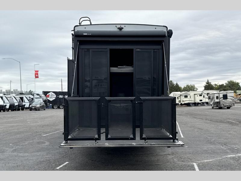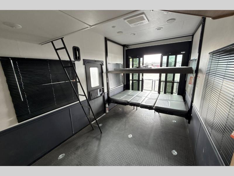 This toy hauler with a 15' separate garage is sure to meet all your needs! Once your toys are unloaded, you can set up the split bench seat/bed or let your guests take a rest on the electric queen bed above this area. There is also a loft here for additional sleeping or storage space plus a half bath for added convenience. The combined kitchen and living area includes a large slide out, two sofas and a free-standing table with chairs and a bench on one side. The U-shaped kitchen will let you whip up your best meals, or you can take your prep outdoors to cook on the outside kitchen. There is also a mini refrigerator here and a Grill N Go pull-out three burner griddle/grill combo. The full dual entry bath will create a front master bedroom, complete with a tilting king bed slide out and a wardrobe slide out for maximum space!