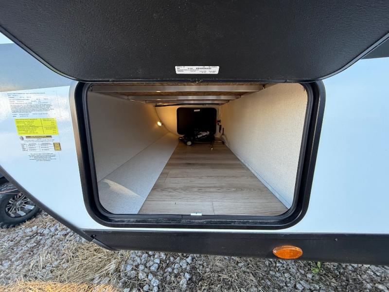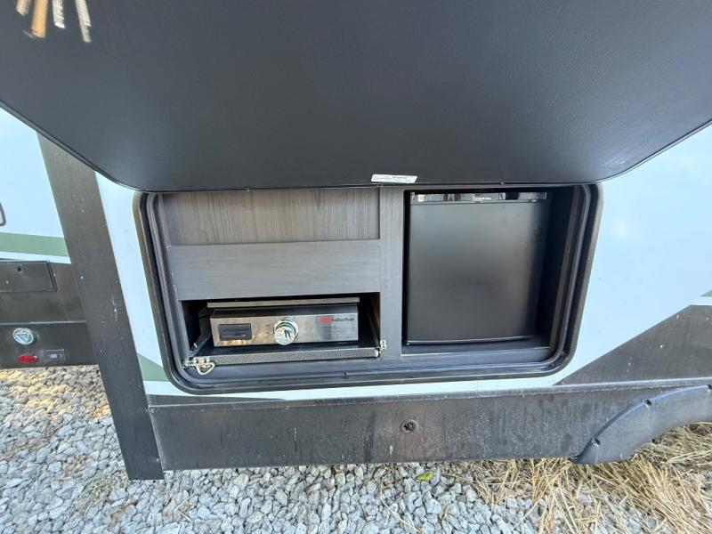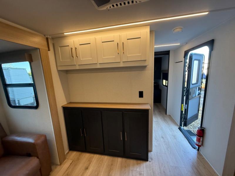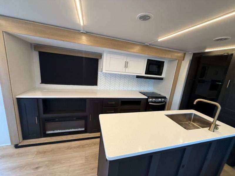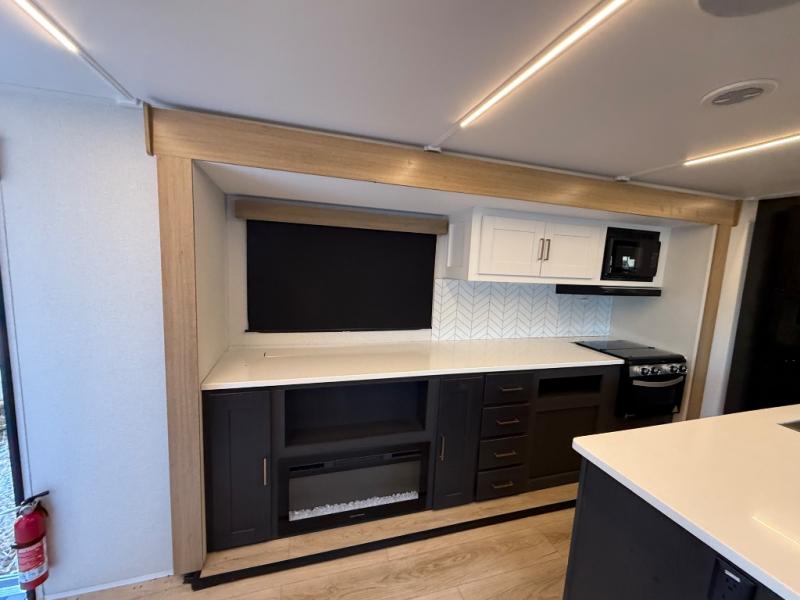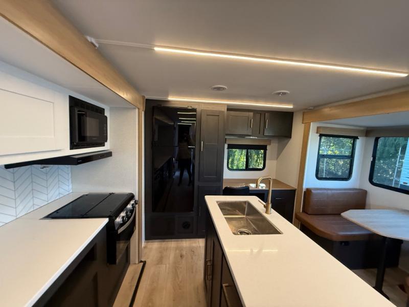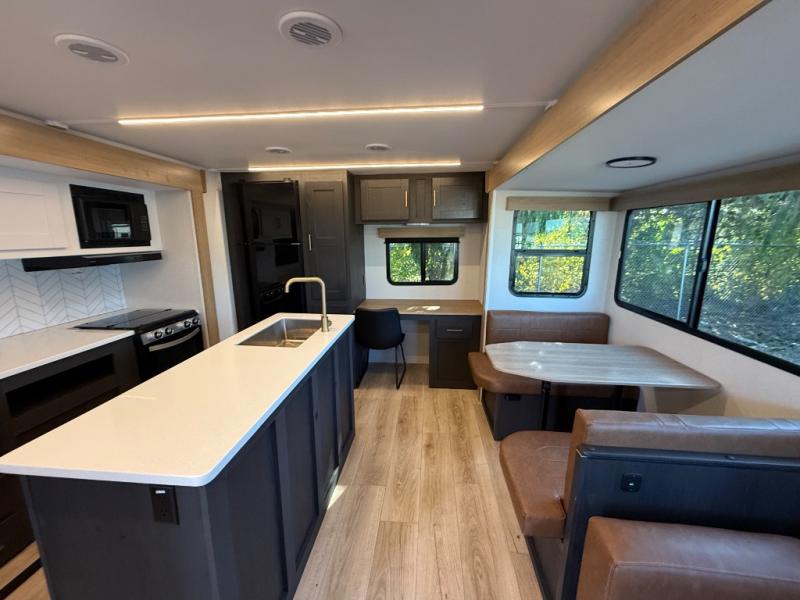 Trips to the campground are made complete in this travel trailer! There are dual opposing slides in the combined kitchen and living area to give you an open floorplan. The chef of your group will appreciate the kitchen island for more counter space, along with all the appliances needed to make meals. The rear kitchen also includes a desk with a chair and overhead storage for work necessities if you're working remotely. When you're not outside relaxing under the 18' awning, you can play games at the booth dinette or watch movies on the sofa. And the king bed in the front bedroom is sure to bring a great night's rest. There are also dual bedside wardrobes plus a dresser with washer and dryer prep if you plan to add those appliances.