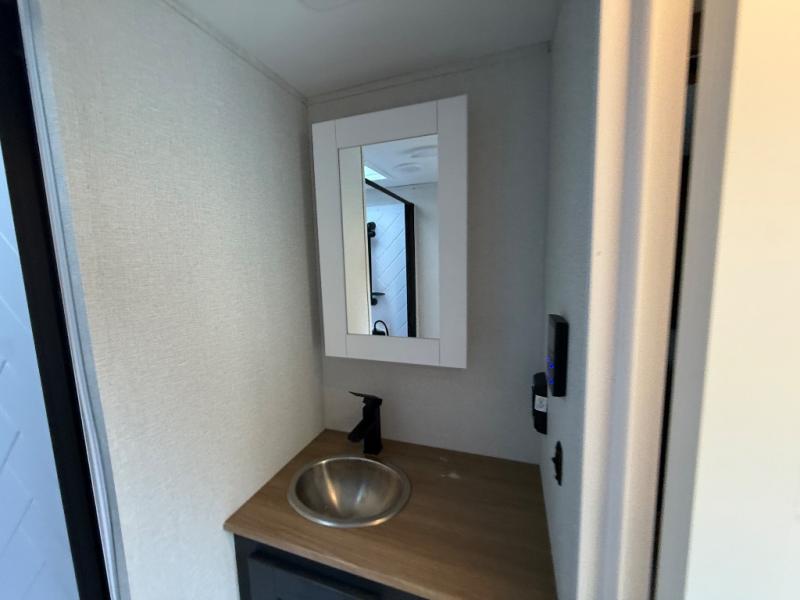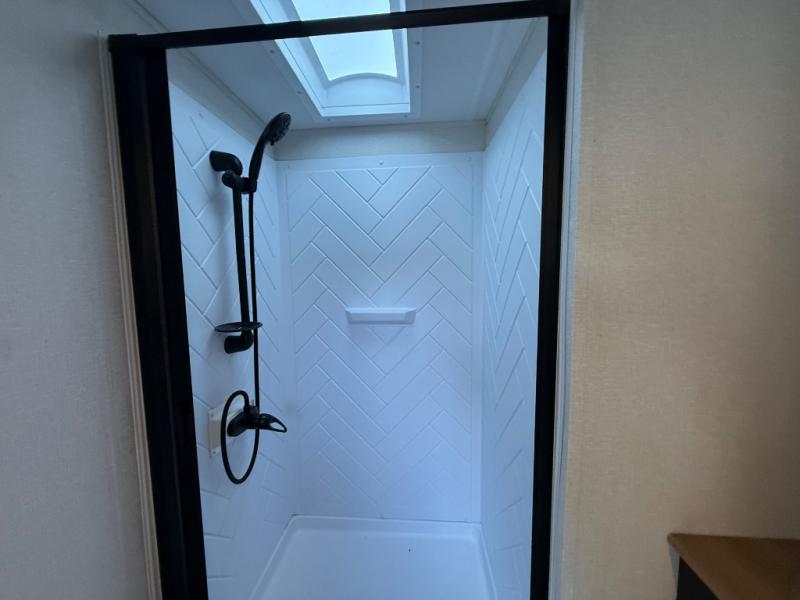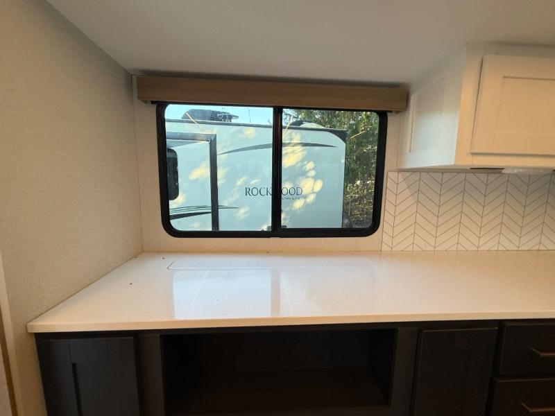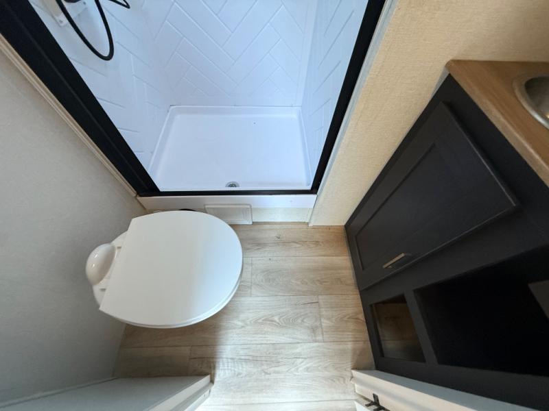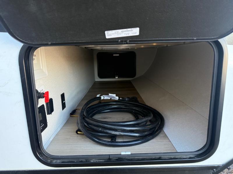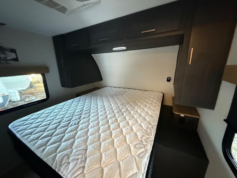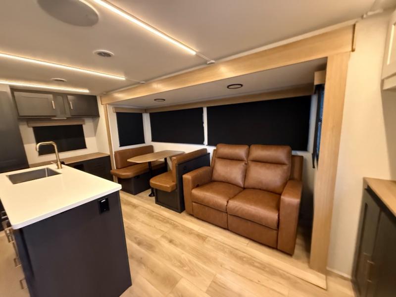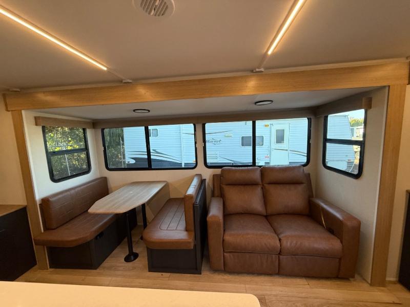 Trips to the campground are made complete in this travel trailer! There are dual opposing slides in the combined kitchen and living area to give you an open floorplan. The chef of your group will appreciate the kitchen island for more counter space, along with all the appliances needed to make meals. The rear kitchen also includes a desk with a chair and overhead storage for work necessities if you're working remotely. When you're not outside relaxing under the 18' awning, you can play games at the booth dinette or watch movies on the sofa. And the king bed in the front bedroom is sure to bring a great night's rest. There are also dual bedside wardrobes plus a dresser with washer and dryer prep if you plan to add those appliances.