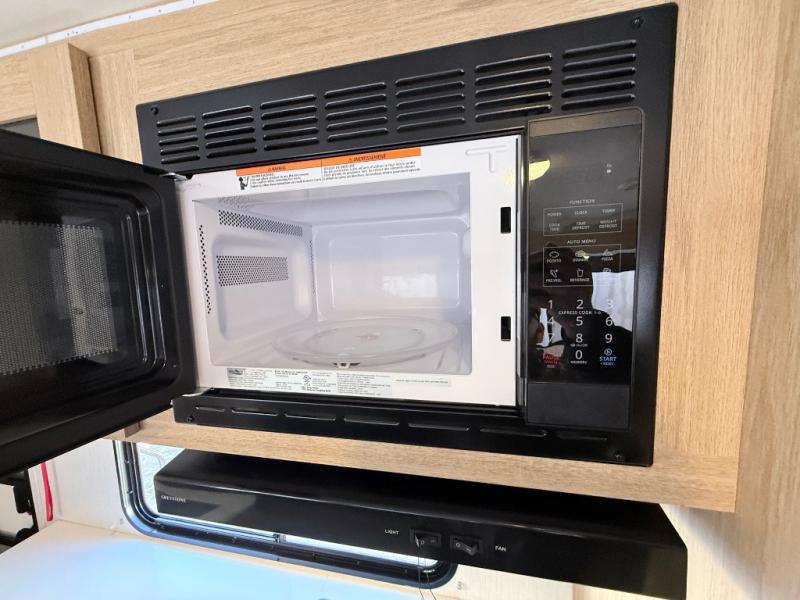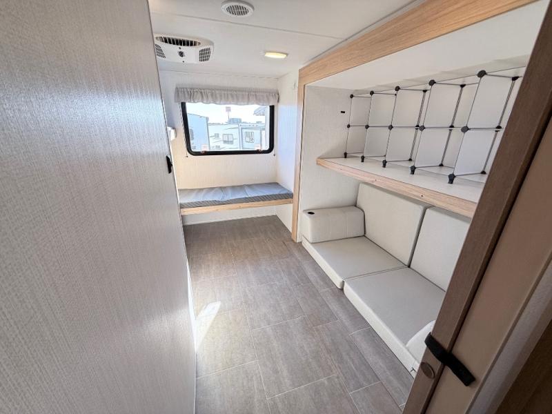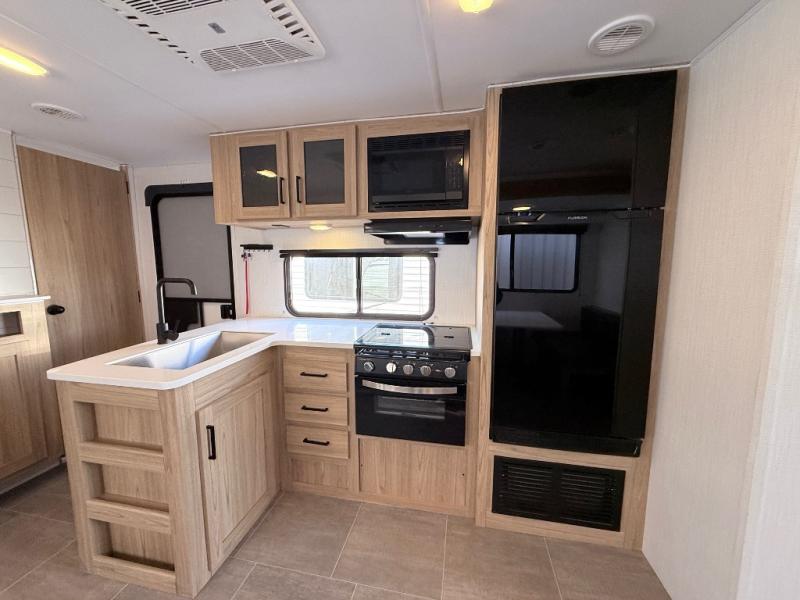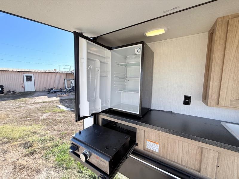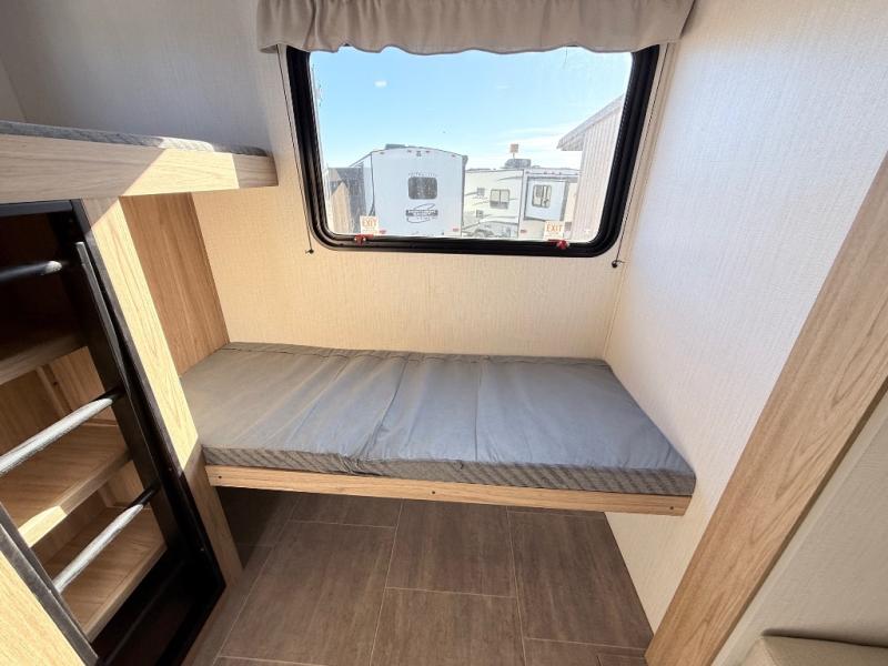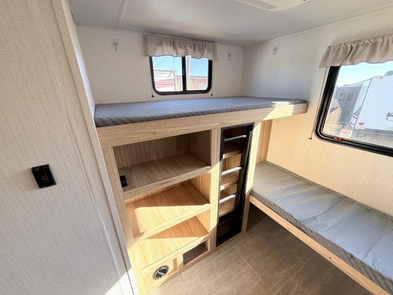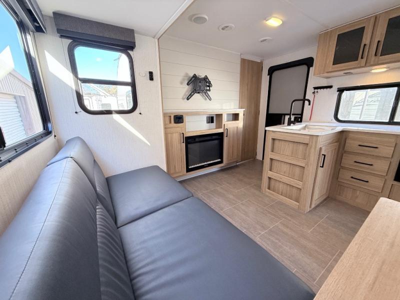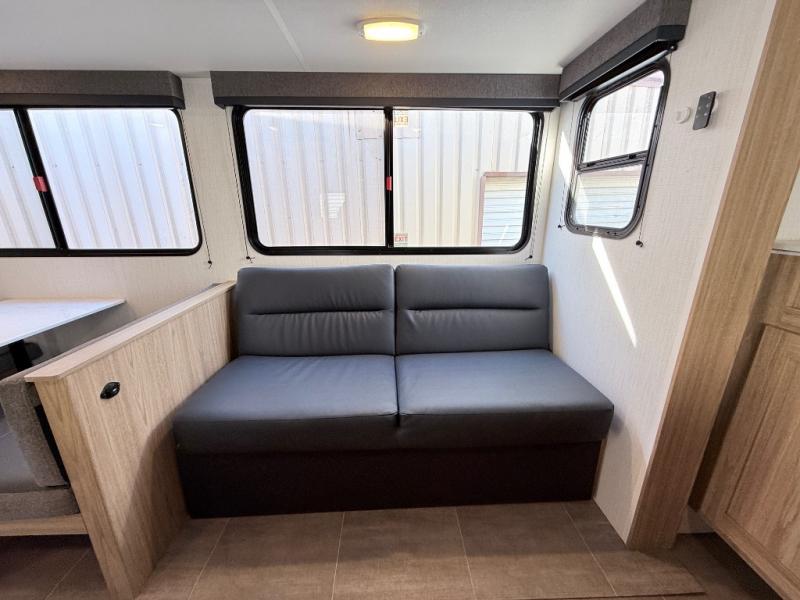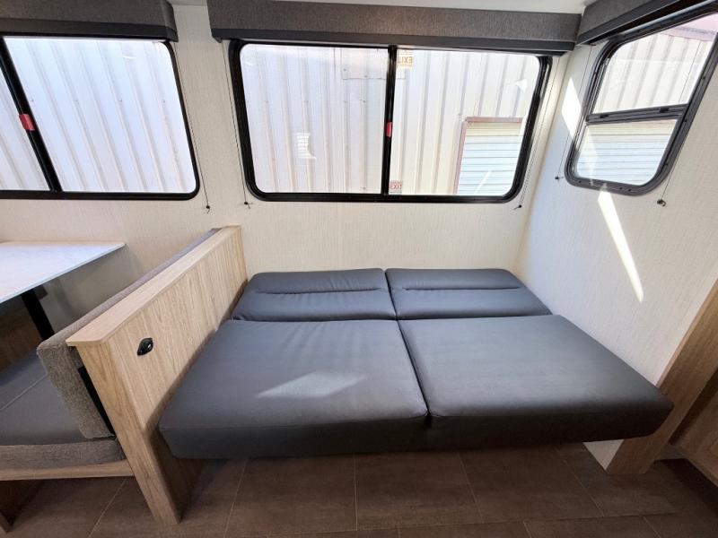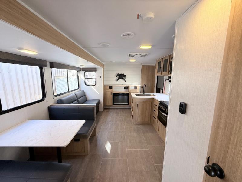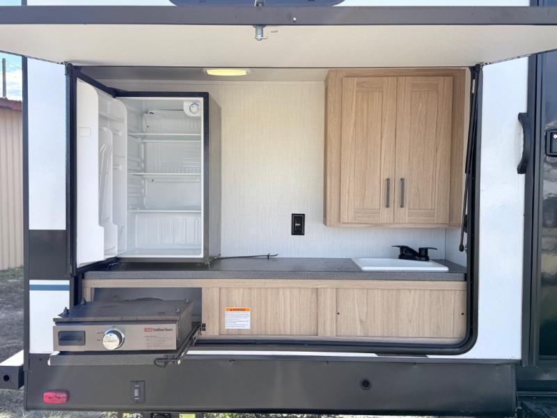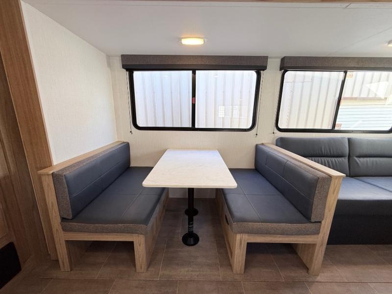 One look at this travel trailer and you'll be hooked! The front private bedroom with a queen bed provides a place for you to retreat to each night, and the full bath will let you freshen up in the morning. One of the dual entry doors is even found in the bath for added convenience! The little ones or your guests will have the bunkhouse to themselves with a total of four bunks and chairs below the flip-up bunk so they can relax. A full kitchen, complete with a three burner cooktop, microwave oven, and farmhouse sink will be perfect for meal times, or you can head outdoors to cook at the outdoor kitchen. In the evening, you can relax on the sofa or play a game at the booth dinette!