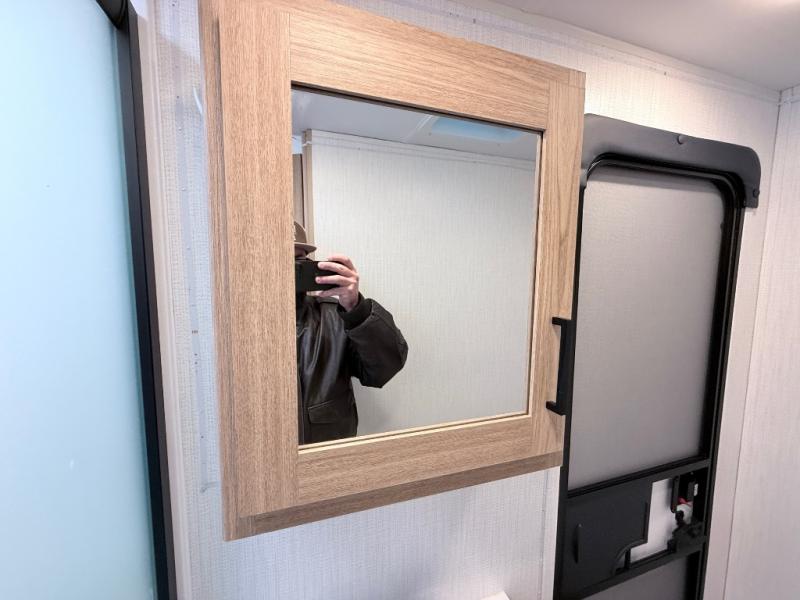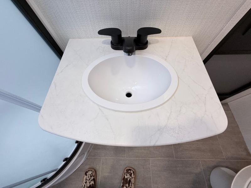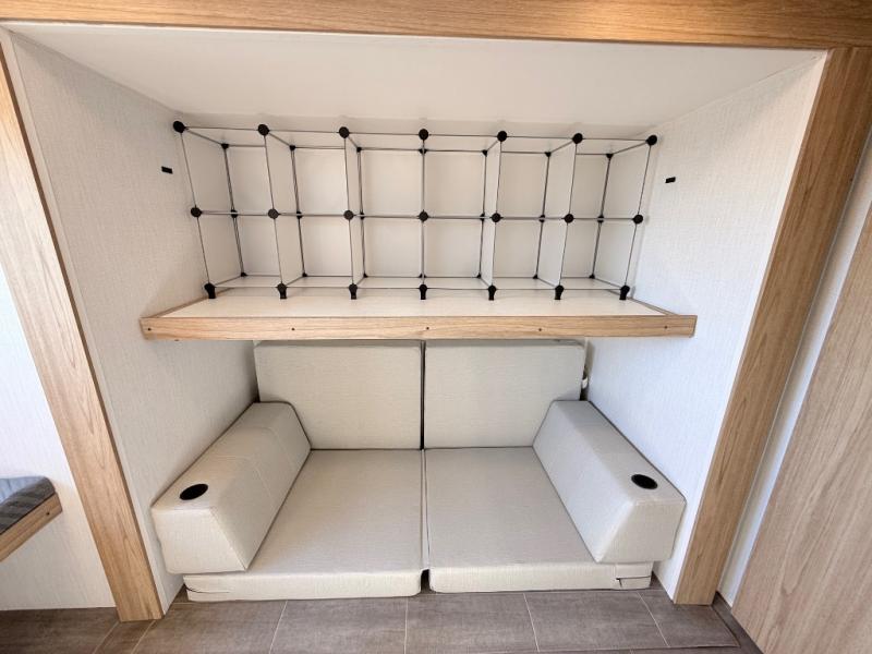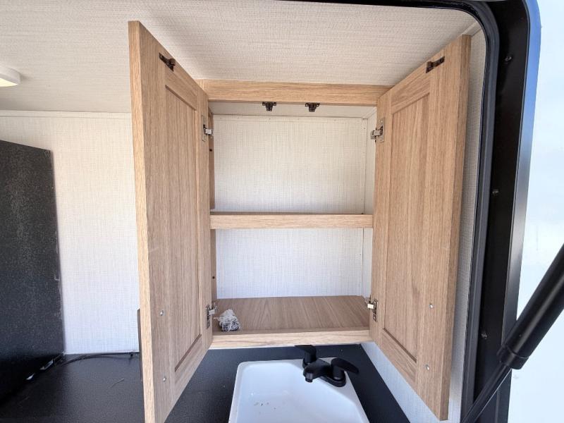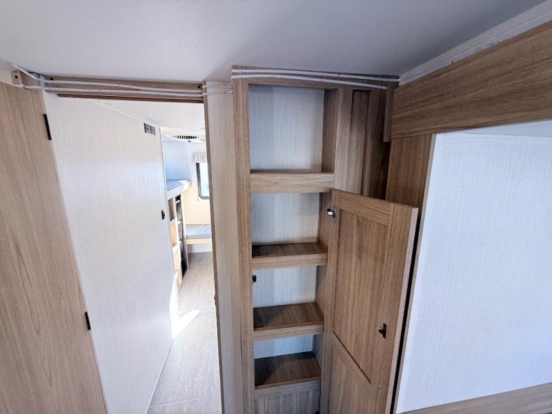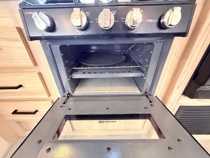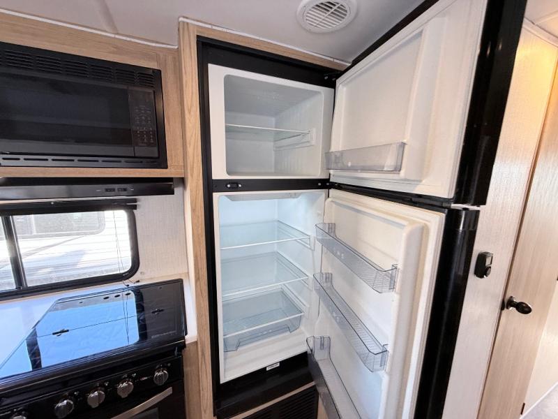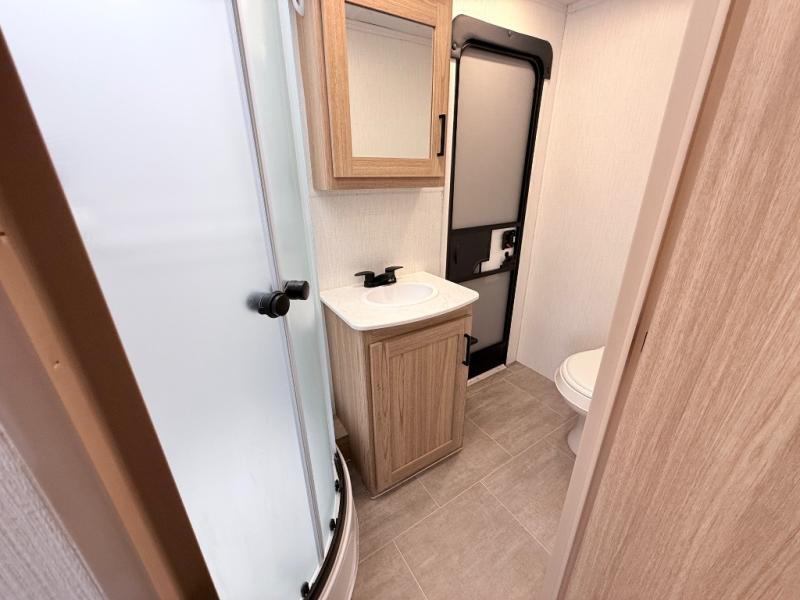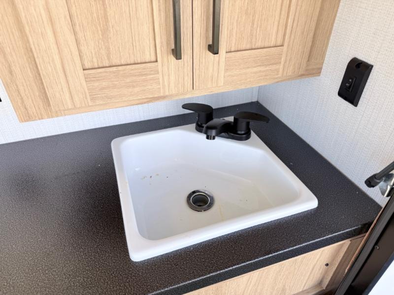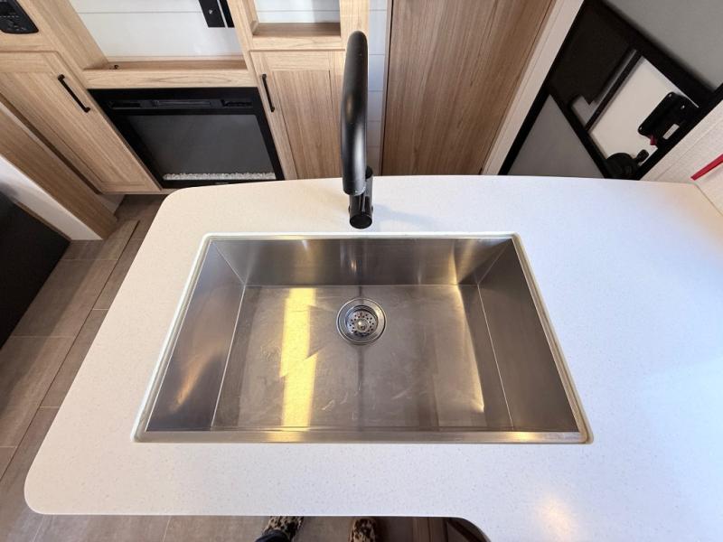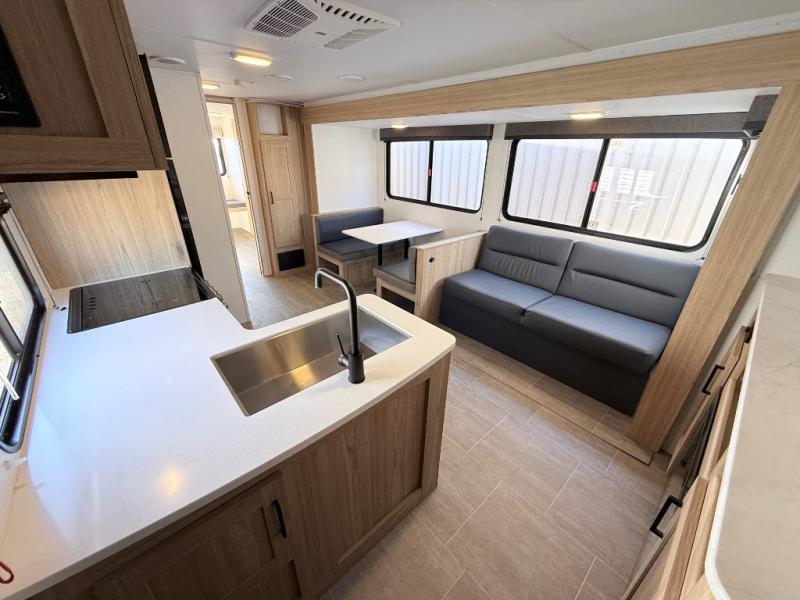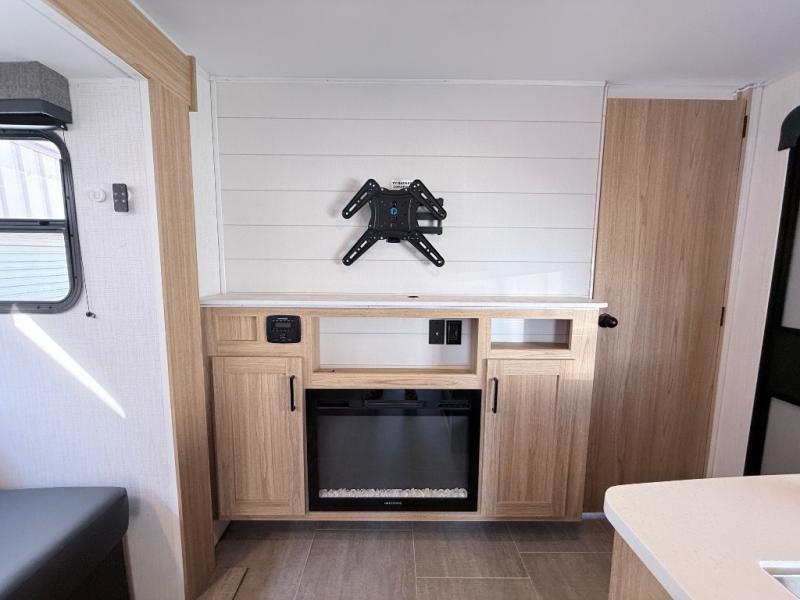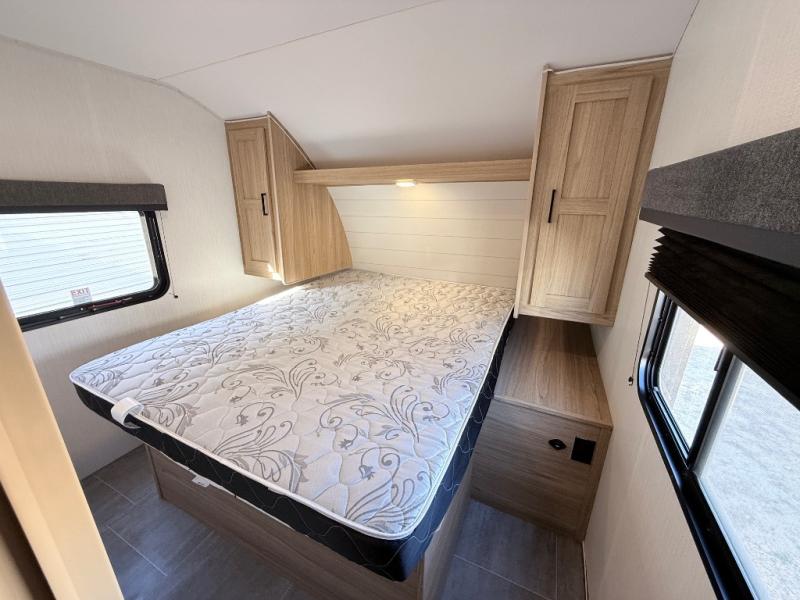 One look at this travel trailer and you'll be hooked! The front private bedroom with a queen bed provides a place for you to retreat to each night, and the full bath will let you freshen up in the morning. One of the dual entry doors is even found in the bath for added convenience! The little ones or your guests will have the bunkhouse to themselves with a total of four bunks and chairs below the flip-up bunk so they can relax. A full kitchen, complete with a three burner cooktop, microwave oven, and farmhouse sink will be perfect for meal times, or you can head outdoors to cook at the outdoor kitchen. In the evening, you can relax on the sofa or play a game at the booth dinette!