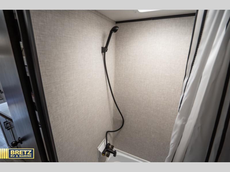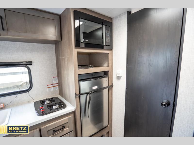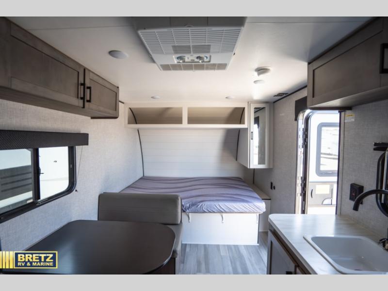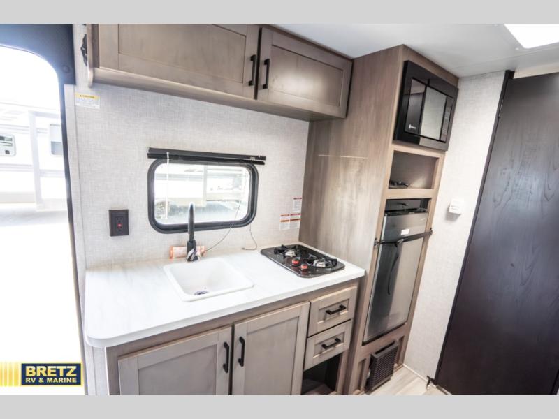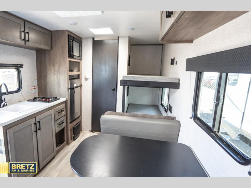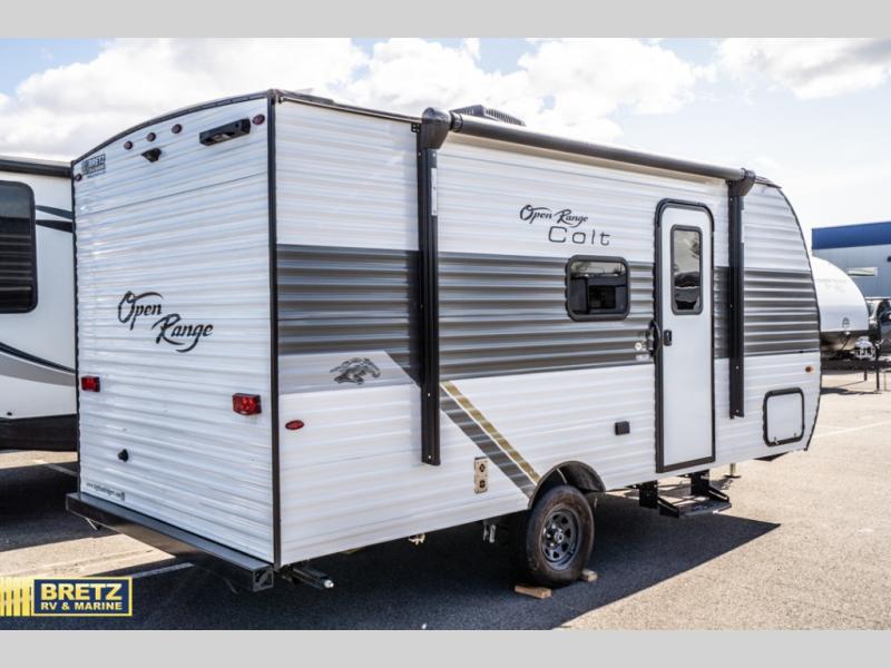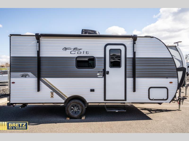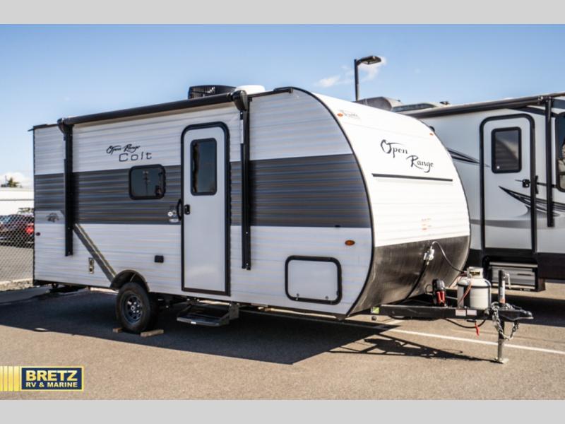 This Open Range Conventional COLT travel trailer is perfect for all your camping needs. There is a front queen bed and bunks beds for sleeping space, plus a booth dinette that will double as both dining and sleeping space for a guest or two little ones. A full kitchen includes a two burner cooktop and microwave to make meals each day, and the private bath with a tub/shower will make it easier than ever to wash up after a day outdoors.