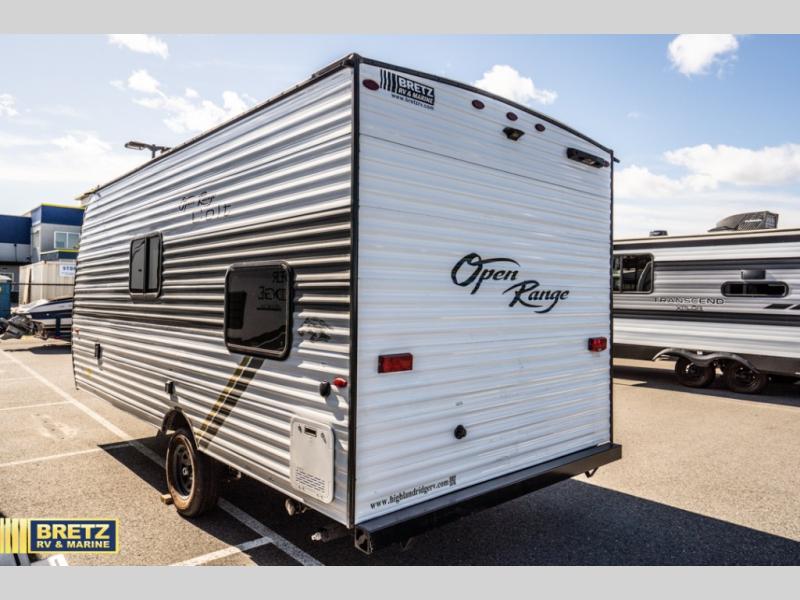 The affordable Open Range Conventional travel trailers by Highland Ridge are ready to meet your camping needs! You will appreciate the durable Magnum Roof system, plus each model is constructed with black front diamond plate protection, 5/8" main floor decking, and self-adjusting electric brakes with E-Z Lube axles for smooth towing. The 81" interior height means you won't feel cramped when relaxing with friends and family, and the residential vinyl flooring throughout is easy to clean, which will be perfect if you're camping with little ones or pets. These models also include a ceiling mount Bluetooth speaker plus a 13,500 BTU roof mounted A/C to keep you cool on those hot summer months.