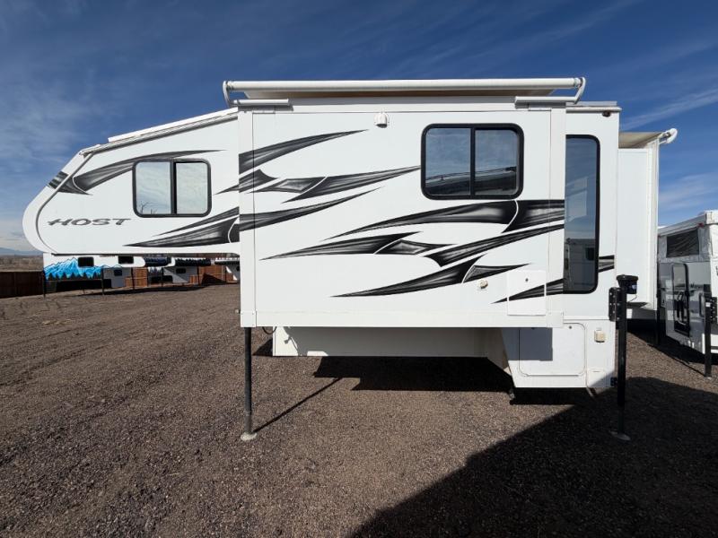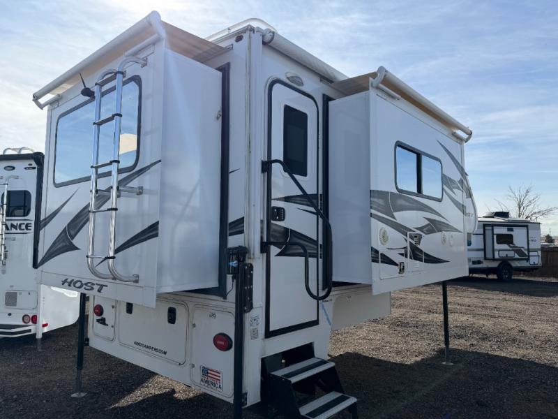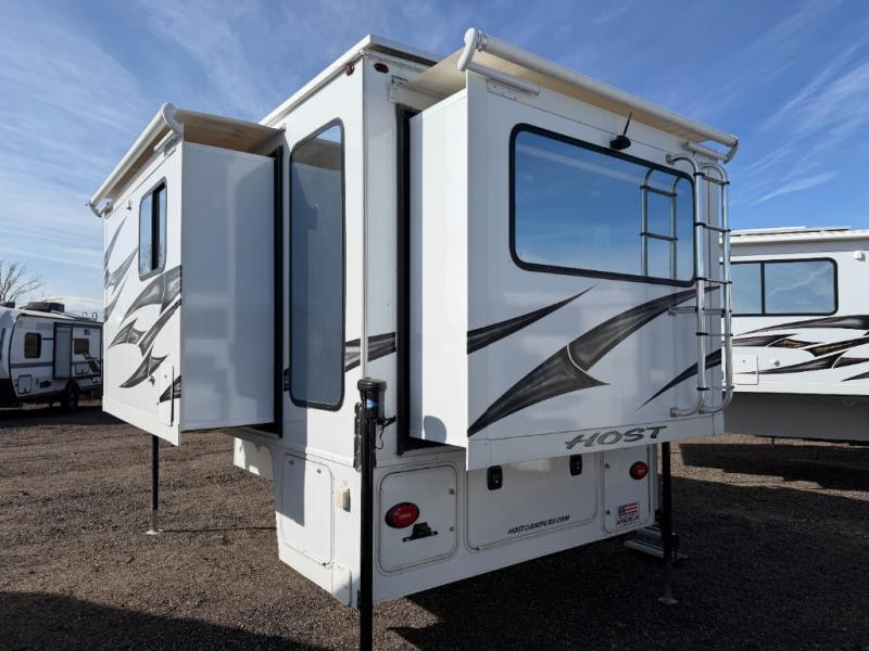 With any Host Industries Host Campers truck camper, there is ease of setting up with electric jacks with a wireless remote, and security when traveling thanks to the heavy duty camper tie down brackets. Each is constructed with two or three slide outs giving you more interior space on an Ultralite 100% aluminum structure with vacuum bonded foam insulated walls, a floor and a ceiling, plus there is a one-piece TPO roof. Some conveniences include an enclosed service center, enclosed and heated holding tanks, large J-rail rain gutters, and access panels for the slide out motors, water tank and holding tanks to mention a few. And the interior is just as impressive from the style, decor choices, the 12 volt LED lighting system, the Grani-coat solid surface countertops, and the many options you can add to customize your Host Camper!