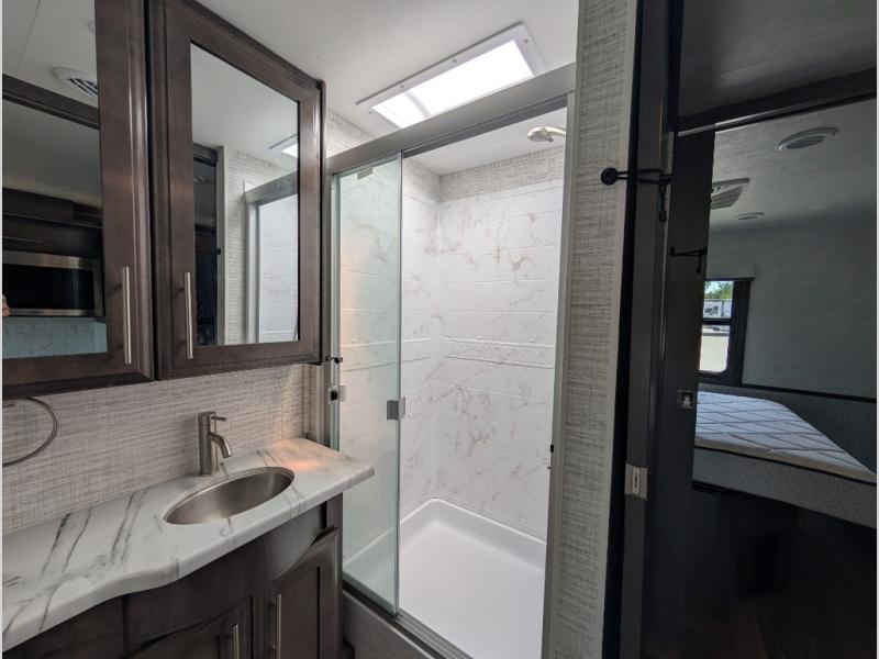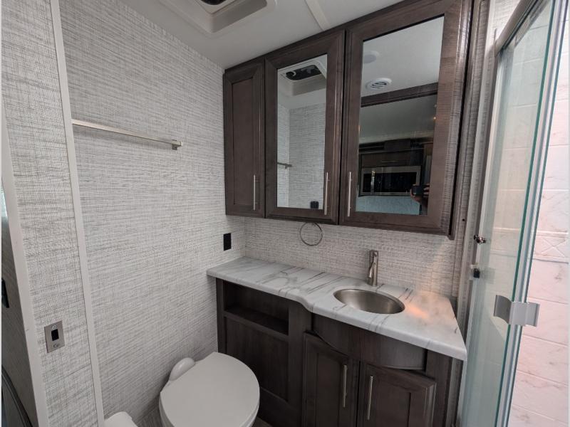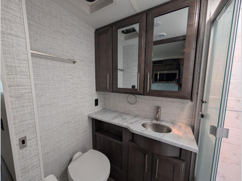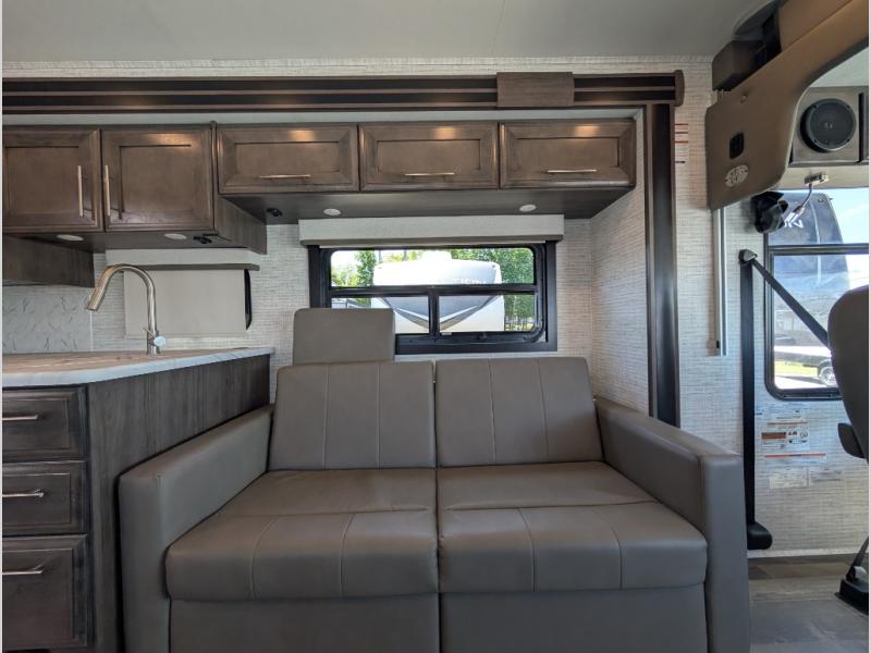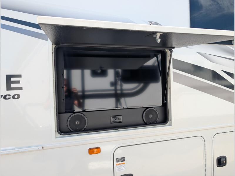 Travel to see new places and enjoy interior comforts as well as outdoor entertainment with this coach! After easily setting up the 23' electric awning you can relax and unwind while taking in the scenery or watching the the exterior LED HD Smart TV. The chef can utilize the outside kitchen or the full kitchen amenities inside such as a 10 cu. ft. refrigerator, the Furrion all-in-one cooktop and oven, plus a residential-size microwave. There is even a pop-up charging center. Enjoy privacy in the rear bedroom while you sleep on the walk-around queen bed, and add the TV option if you like. You will find seating in the main area on the Jayco-exclusive easy-operation legless dinette table and the jack-knife sofa, or choose the theater seating option. The cockpit table also gives you another surface to place your things while you sit in the driver and passenger seats that swivel. If you're needing additional sleeping space, just choose the drop-down overhead bunk option!