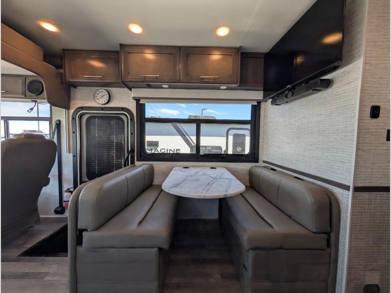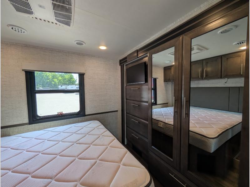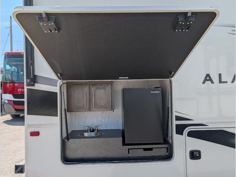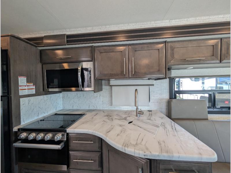 With any Alante Class A gas motorhome by Jayco, the mandatory Customer Value package provides JRide technology with a computer-balanced driveshaft ensuring smooth and efficient power transfer to the wheels, and SACHS shock absorbers offering independent adjustments to the road conditions. There is also a one-piece, seamless, crowned fiberglass roof, and an exterior entertainment center to watch shows and movies. The automatic hydraulic leveling jacks, 120 in. panoramic windshield, 200W solar panel, and the electric-powered entrance step will make traveling that much easier. And the interior equipment includes a Sony infotainment center with Apple CarPlay and Android Auto, a backup and side-view cameras for easy parking, plus a 6-way power driver seat for comfortable and safe driving. You will also love the power front privacy shade with manual side privacy shades, LED-lit hardwood fascia and countertops, a pop-up charging station in the kitchen and a USB port and wireless charging in the nightstands.
