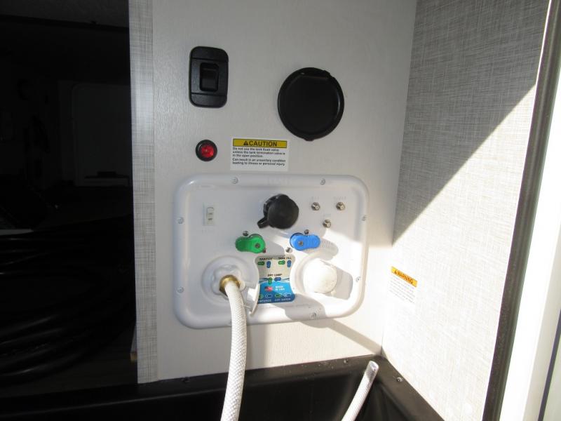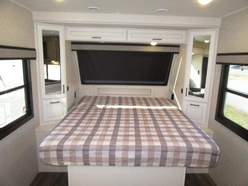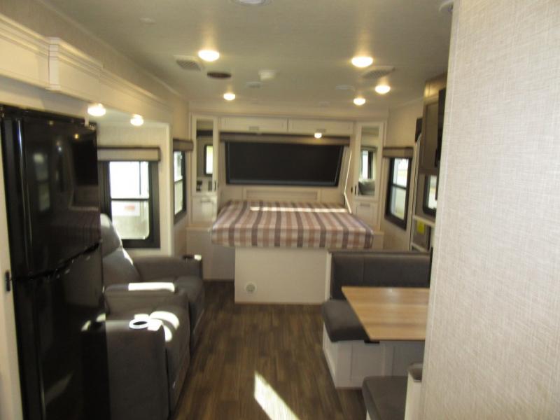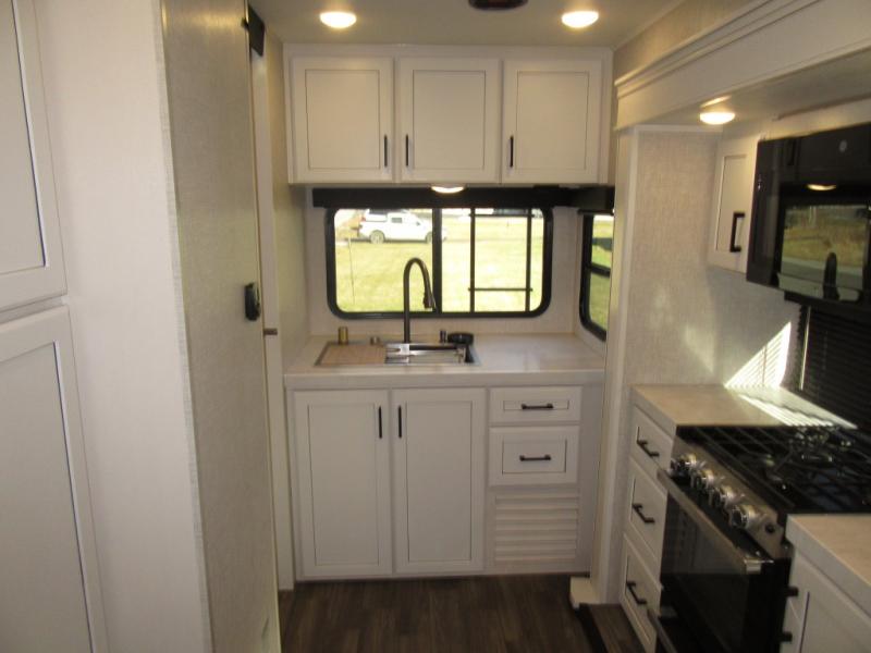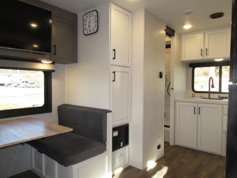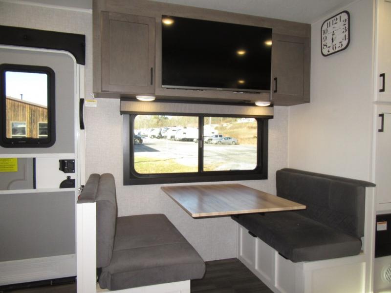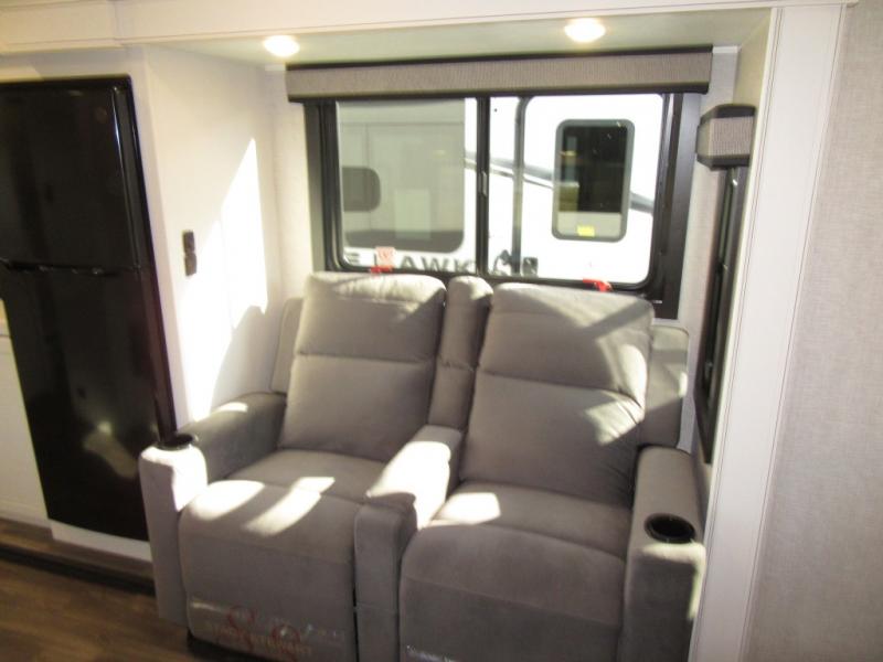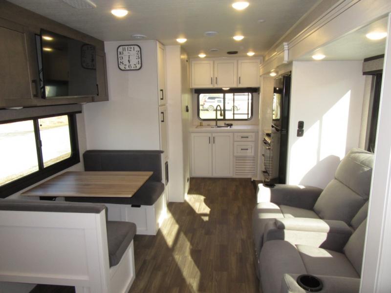 It will be so easy to enjoy camping trips when you're in this travel trailer! A full kitchen, complete with a three burner cooktop, over-the-range microwave, and 10 cu. ft. 12V refrigerator will let you cook and store meals, and the booth dinette provides a place to dine. Within the large slide, you'll find the 60" theater sofa with cup holders which is across from the 40" 4K Ultra LED HD Smart TV! You'll love having a 66" x 80" Olympic queen bed to sleep on, and there are dual wardrobes to keep your clothes organized. And larger camp gear can go outside in the pass-thru storage!