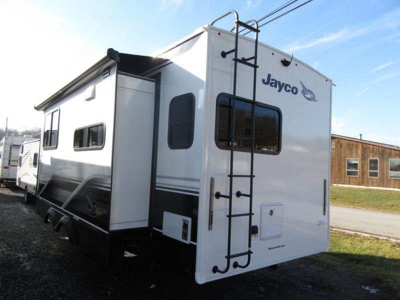 With any Eagle HT fifth wheel or travel trailer by Jayco you will enjoy a smooth drive thanks to the 4 Star Handling Package and MORryde CRE-3000 rubberized suspension. The Customer Value Package includes amenities that are sure to make camping easier than ever, like the 60K on-demand water heater, Keyed-Alike lock system, 15,000 BTU "Whisper Quiet" A/C, and more. Handcrafted and glazed door/drawer fronts will make your space feel more like home, along with residential vinyl flooring throughout, GE appliances, and blackout roller shades with reflective side throughout to keep the sun out when you want to sleep in. Each model also includes a NuVo H2O water treatment system with filters included, interior and exterior "Blue Sync" audio connect with MB Quart Sound for your TV and phone, and 100% no floor vents for added comfort and convenience!