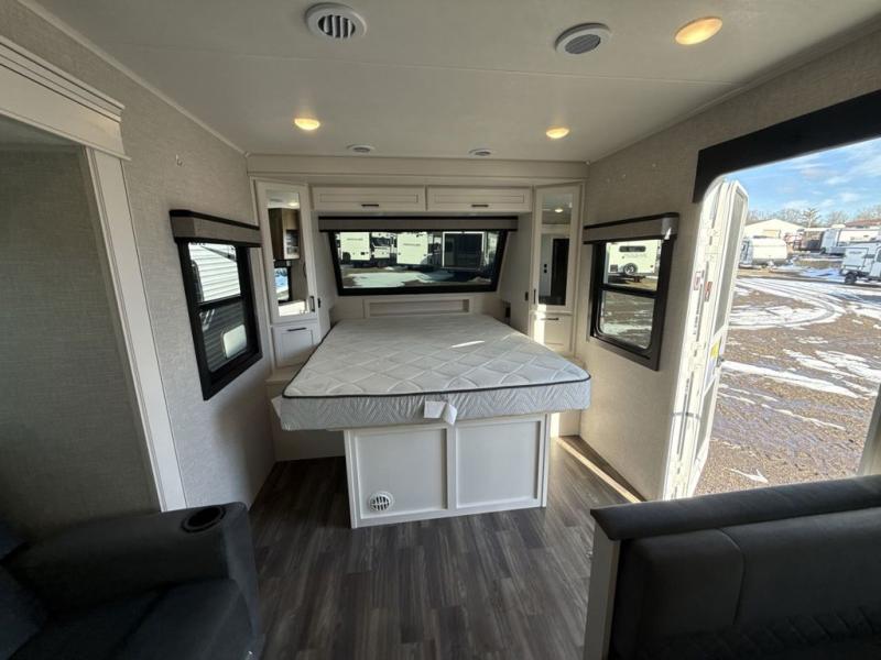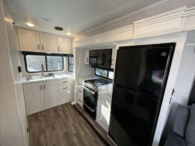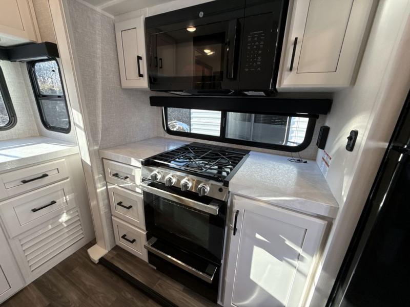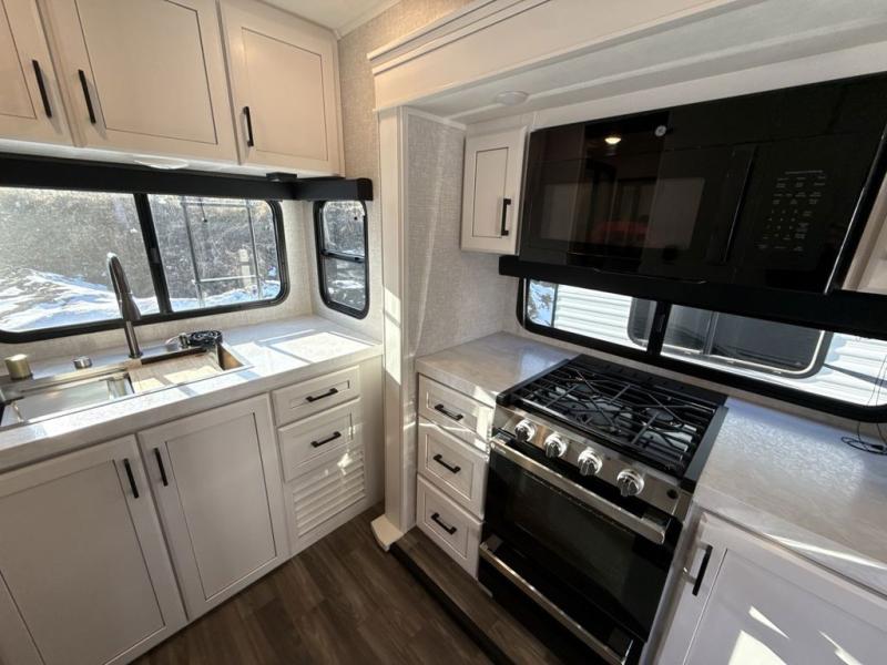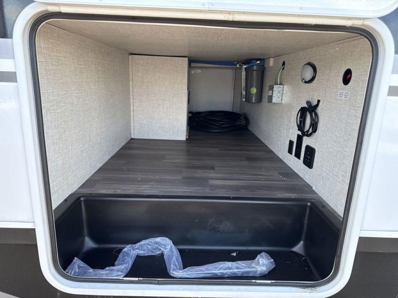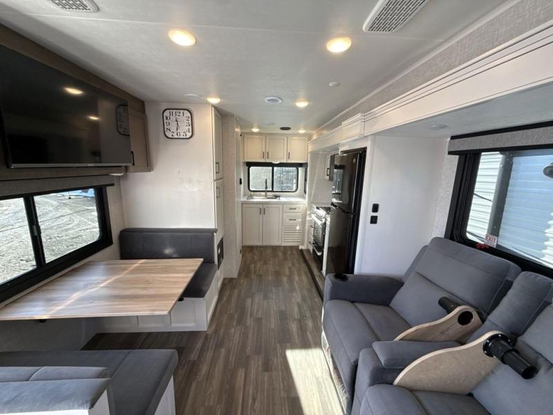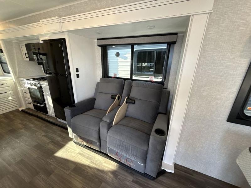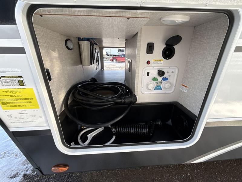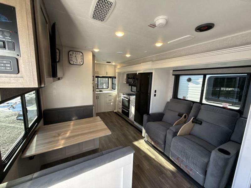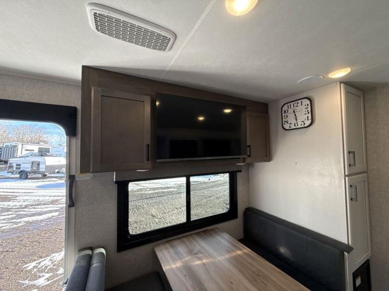 It will be so easy to enjoy camping trips when you're in this travel trailer! A full kitchen, complete with a three burner cooktop, over-the-range microwave, and 10 cu. ft. 12V refrigerator will let you cook and store meals, and the booth dinette provides a place to dine. Within the large slide, you'll find the 60" theater sofa with cup holders which is across from the 40" 4K Ultra LED HD Smart TV! You'll love having a 66" x 80" Olympic queen bed to sleep on, and there are dual wardrobes to keep your clothes organized. And larger camp gear can go outside in the pass-thru storage!