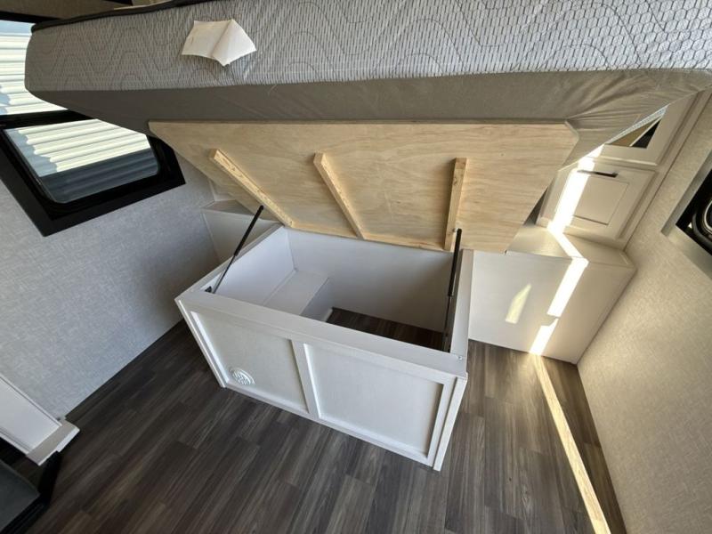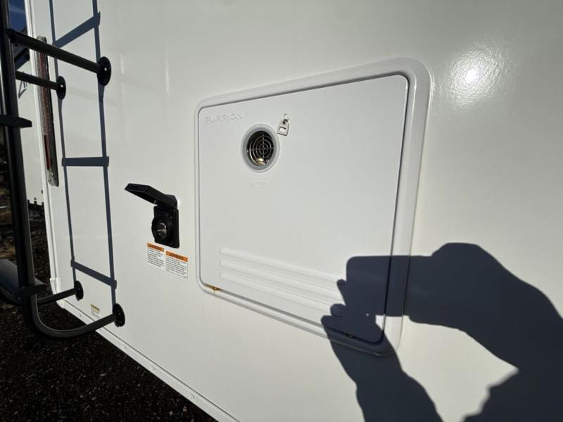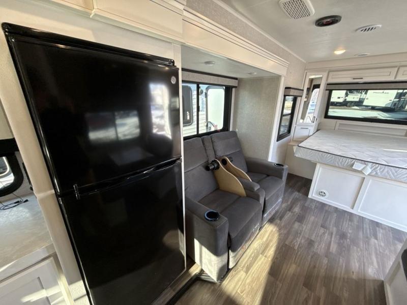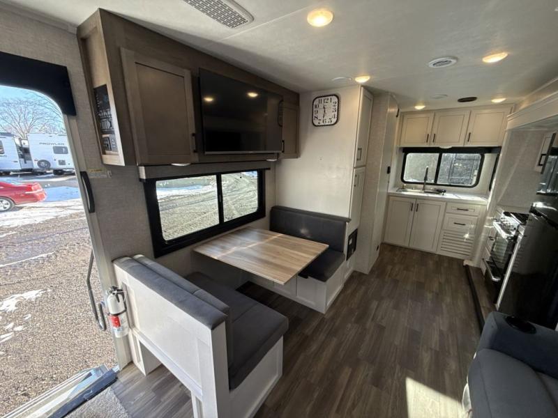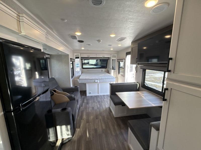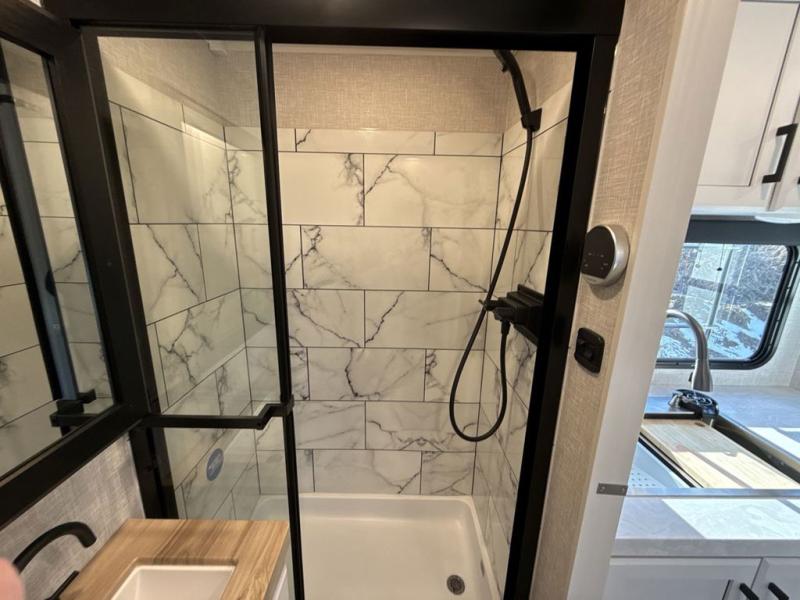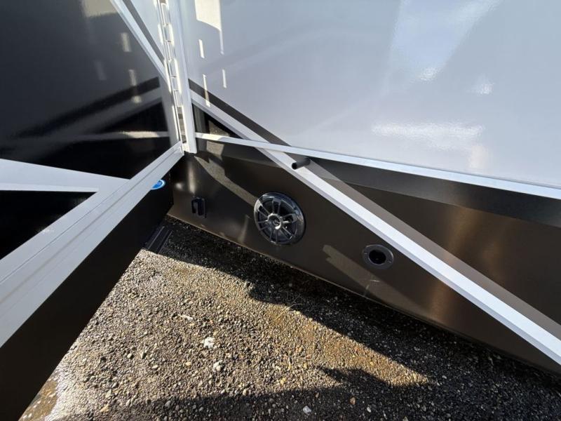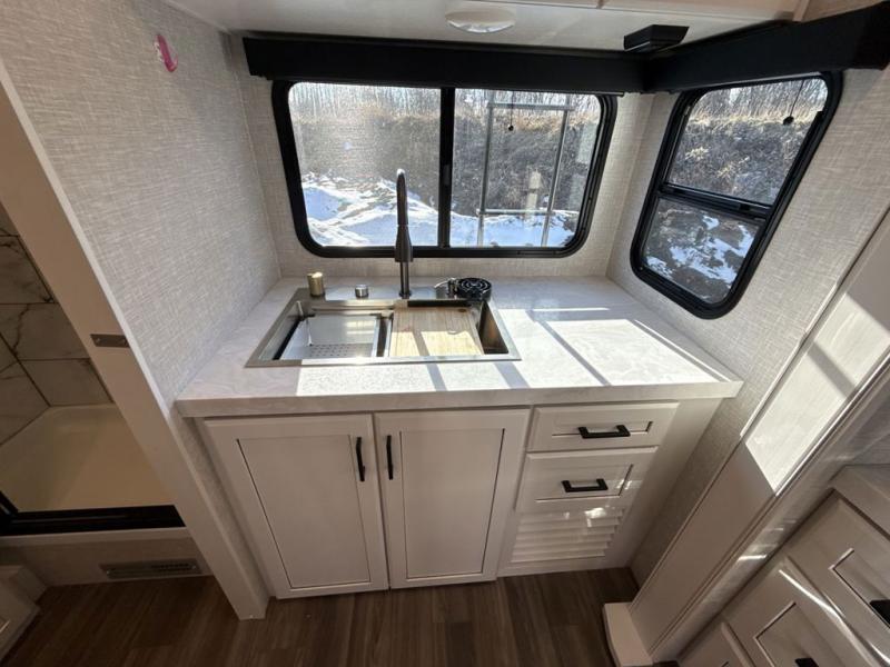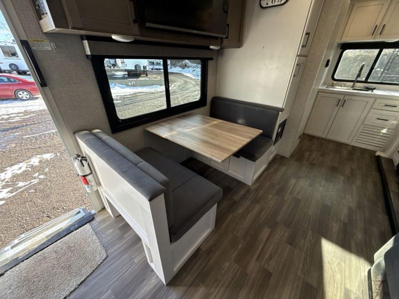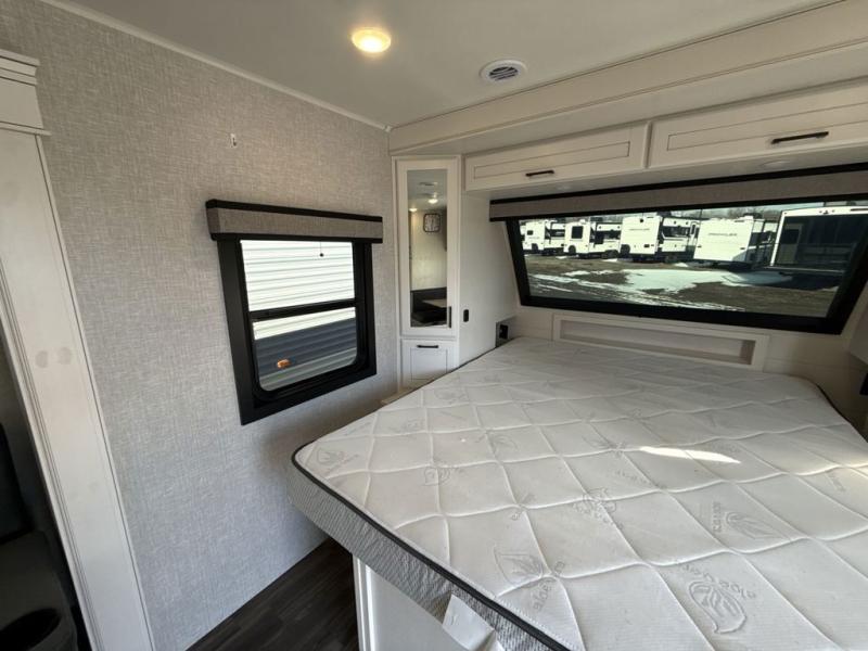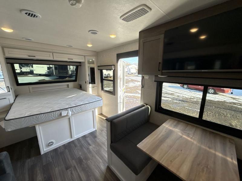 It will be so easy to enjoy camping trips when you're in this travel trailer! A full kitchen, complete with a three burner cooktop, over-the-range microwave, and 10 cu. ft. 12V refrigerator will let you cook and store meals, and the booth dinette provides a place to dine. Within the large slide, you'll find the 60" theater sofa with cup holders which is across from the 40" 4K Ultra LED HD Smart TV! You'll love having a 66" x 80" Olympic queen bed to sleep on, and there are dual wardrobes to keep your clothes organized. And larger camp gear can go outside in the pass-thru storage!