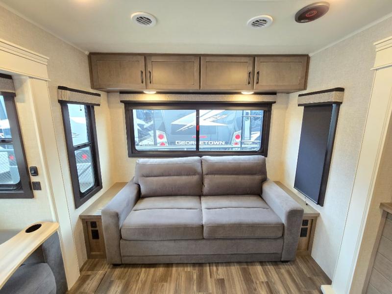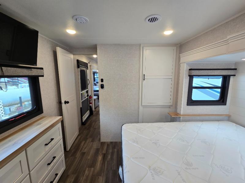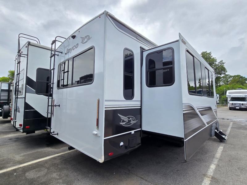With any Eagle HT fifth wheel or travel trailer by Jayco you will enjoy a smooth drive thanks to the 4 Star Handling Package, Goodyear Endurance tires, and MORryde CRE-3000 rubberized suspension. The Customer Value Package includes amenities that are sure to make camping easier than ever, like the 60K on-demand water heater, Keyed-Alike lock system, 15,000 BTU "Whisper Quiet" A/C, and more. Handcrafted and glazed door/drawer fronts will make your space feel more like home, along with residential vinyl flooring throughout, GE appliances, and blackout roller shades with reflective side throughout to keep the sun out when you want to sleep in. Each model also includes a NuVo H2O water treatment system with filters included, interior and exterior "Blue Sync" audio connect with MB Quart Sound for your TV and phone, and 100% no floor vents for added comfort and convenience!