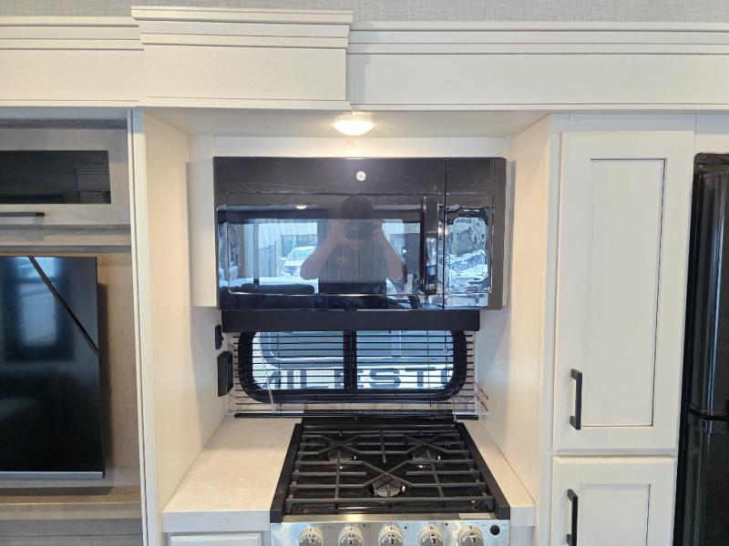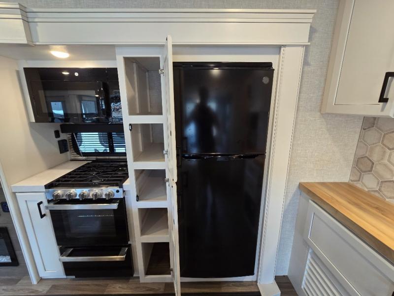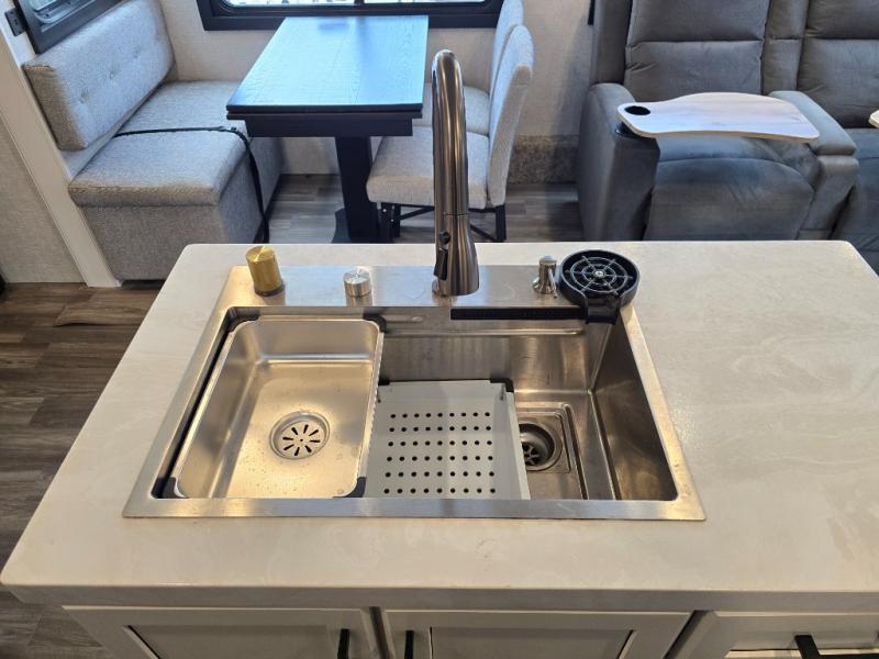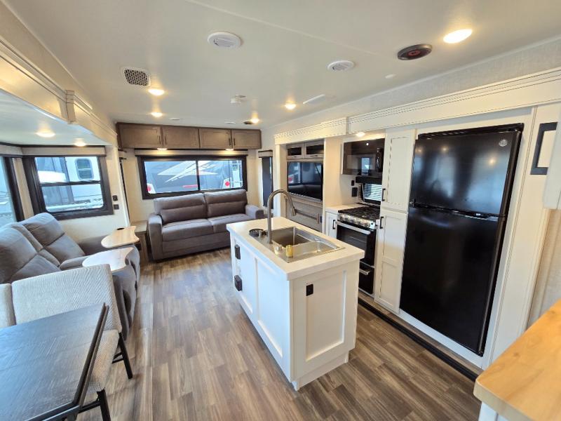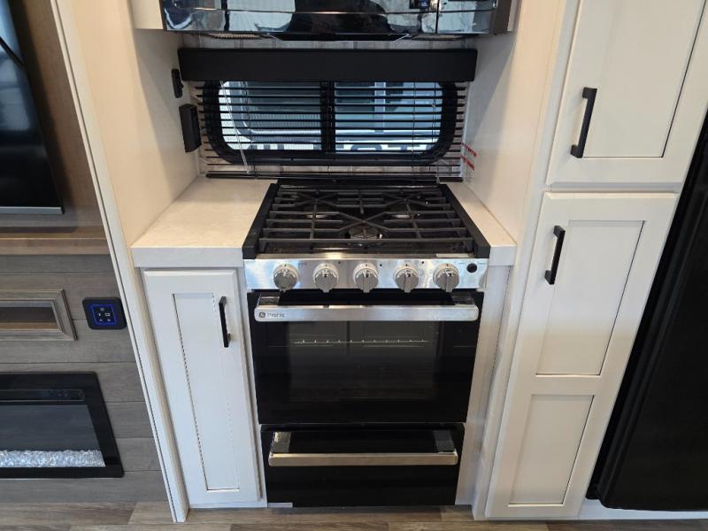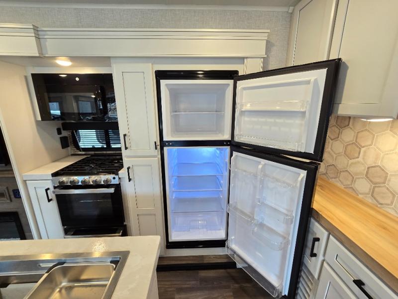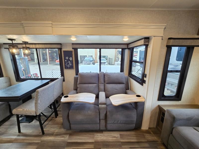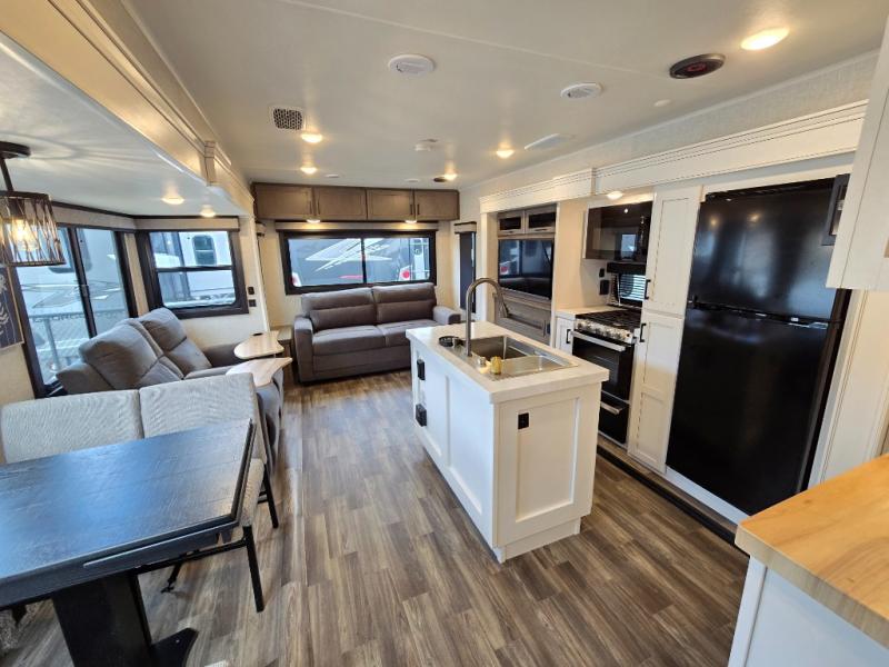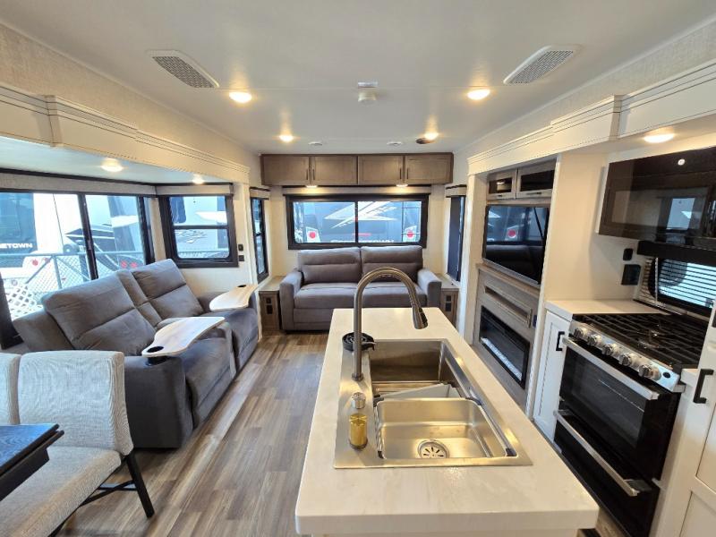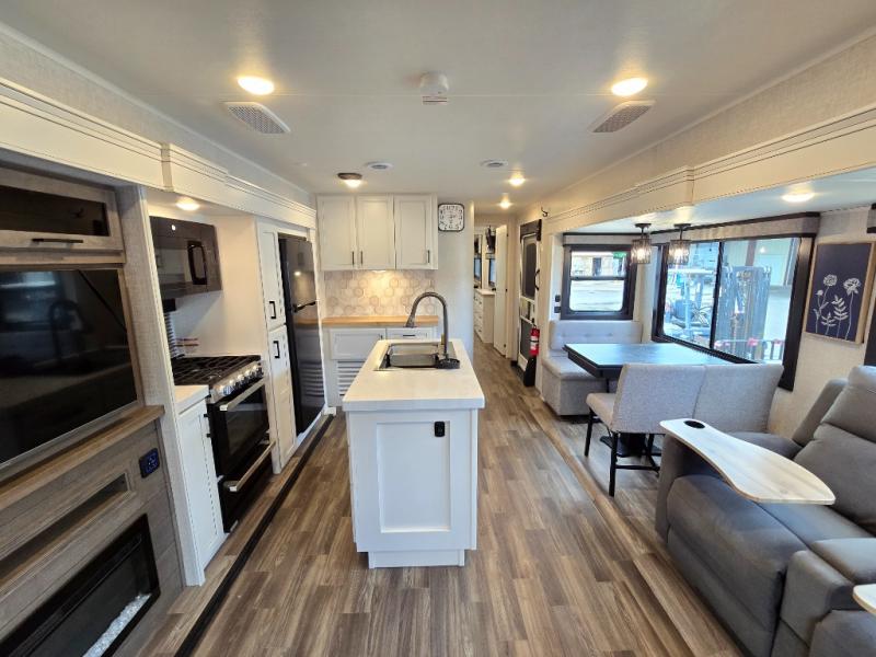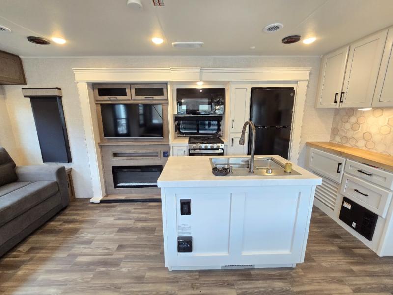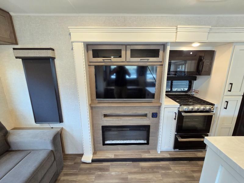 You will feel right at home camping in this travel trailer! It features a front private bedroom with an Olympic queen bed slide for more interior space, a dresser, a front wardrobe to hang your clothes, and a wardrobe that is prepped to add an optional washer and dryer. Start each morning getting squeaky clean in the full bathroom with the shower and then head to the kitchen to fry up some eggs on the stainless steel range. The kitchen island with a multi-functional sink will help make meal prepping easier too, plus there is a hutch to store your dishes. Enjoy a relaxing evening by the fireplace and watch your favorite movie with the entertainment center while sitting on either the rear tri-fold sofa or the theater seating!