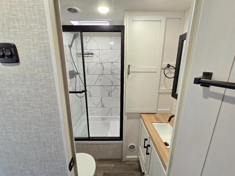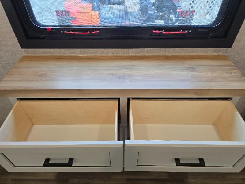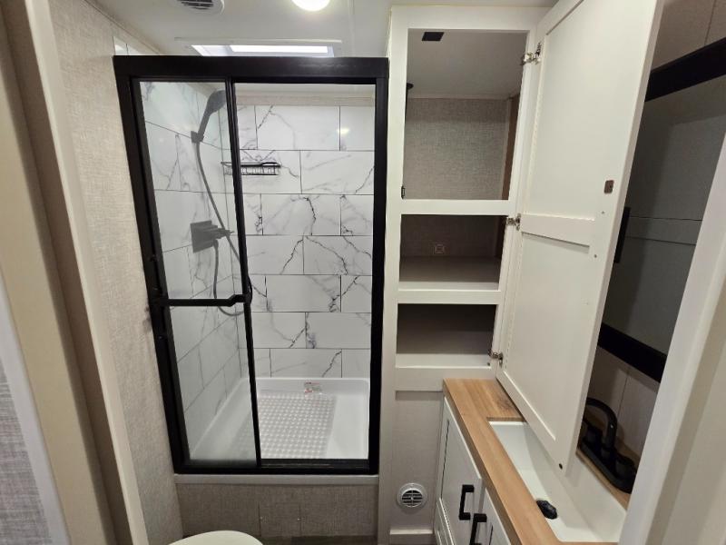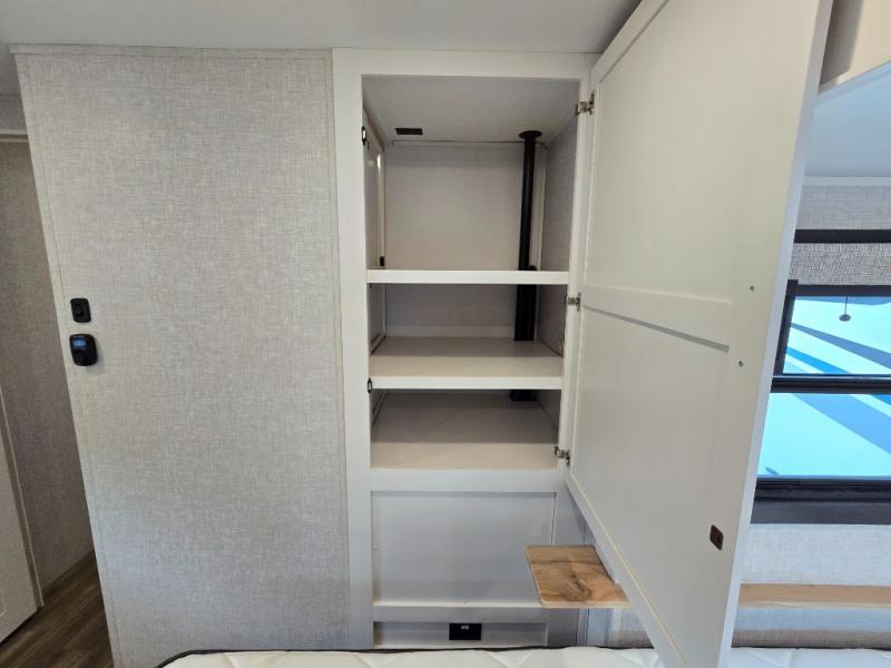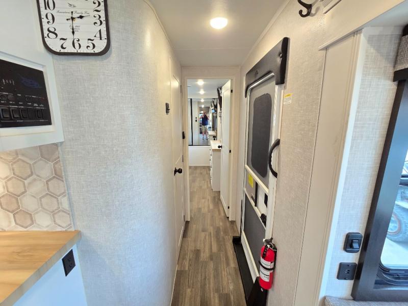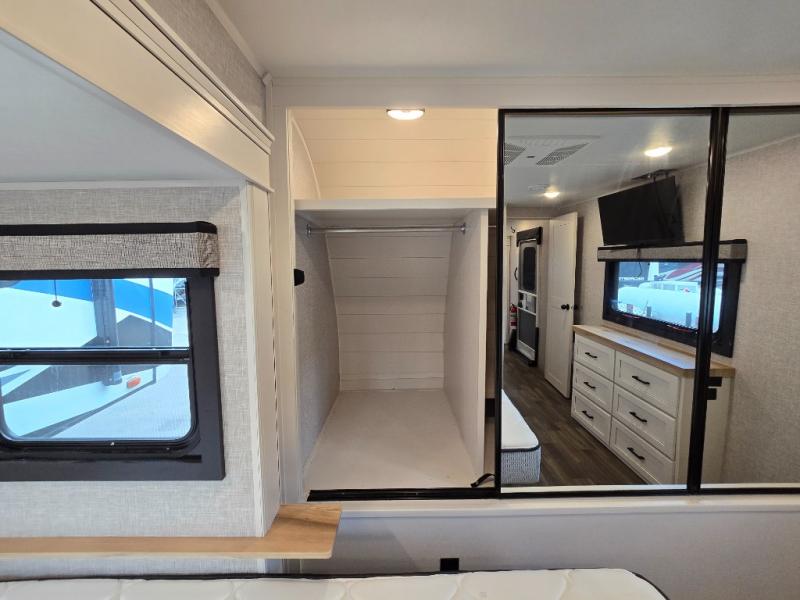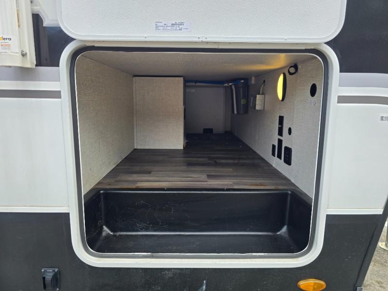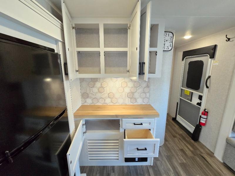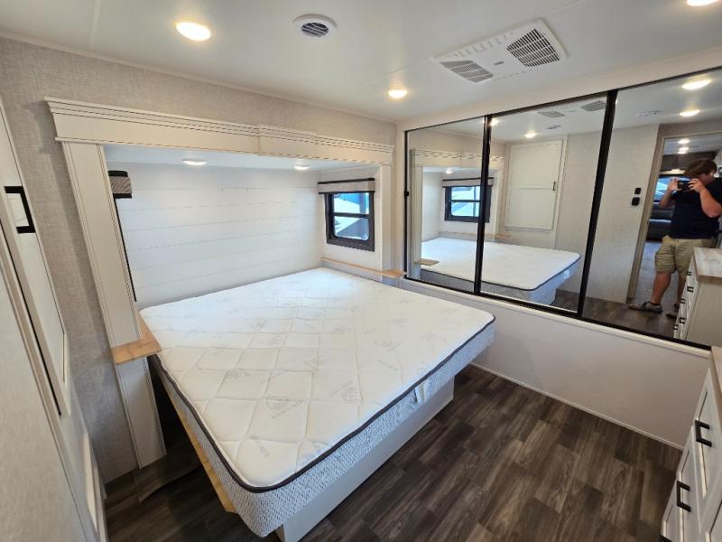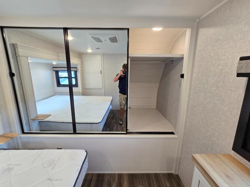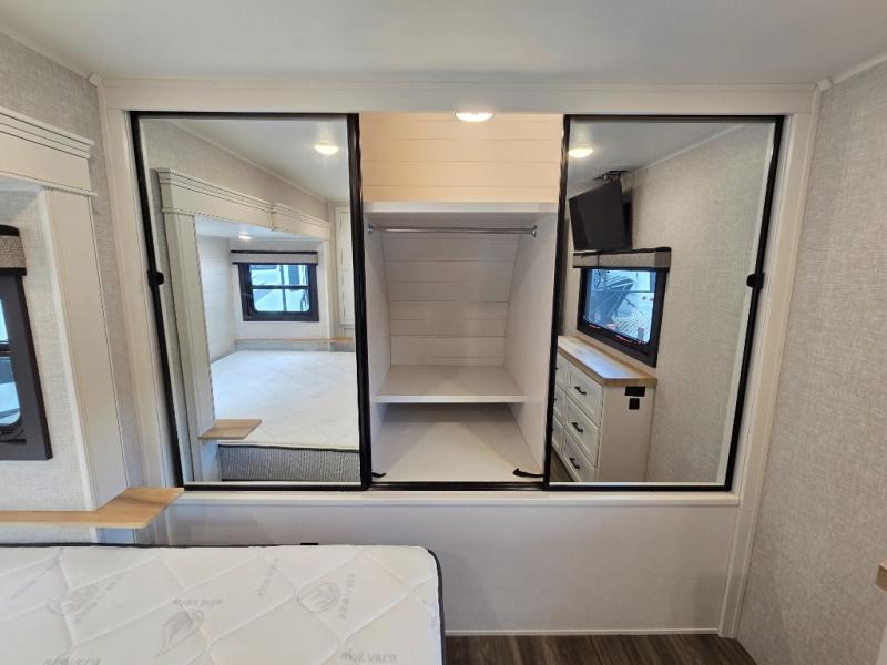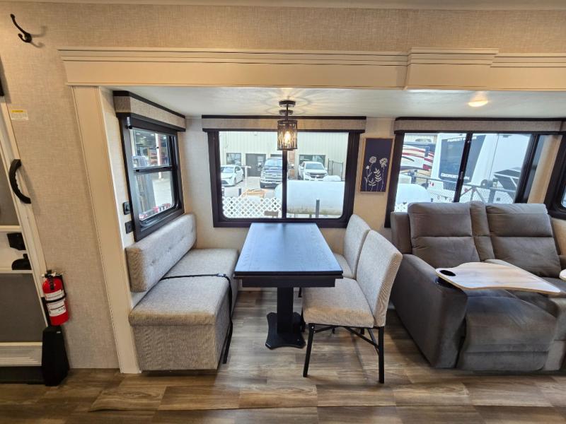 You will feel right at home camping in this travel trailer! It features a front private bedroom with an Olympic queen bed slide for more interior space, a dresser, a front wardrobe to hang your clothes, and a wardrobe that is prepped to add an optional washer and dryer. Start each morning getting squeaky clean in the full bathroom with the shower and then head to the kitchen to fry up some eggs on the stainless steel range. The kitchen island with a multi-functional sink will help make meal prepping easier too, plus there is a hutch to store your dishes. Enjoy a relaxing evening by the fireplace and watch your favorite movie with the entertainment center while sitting on either the rear tri-fold sofa or the theater seating!